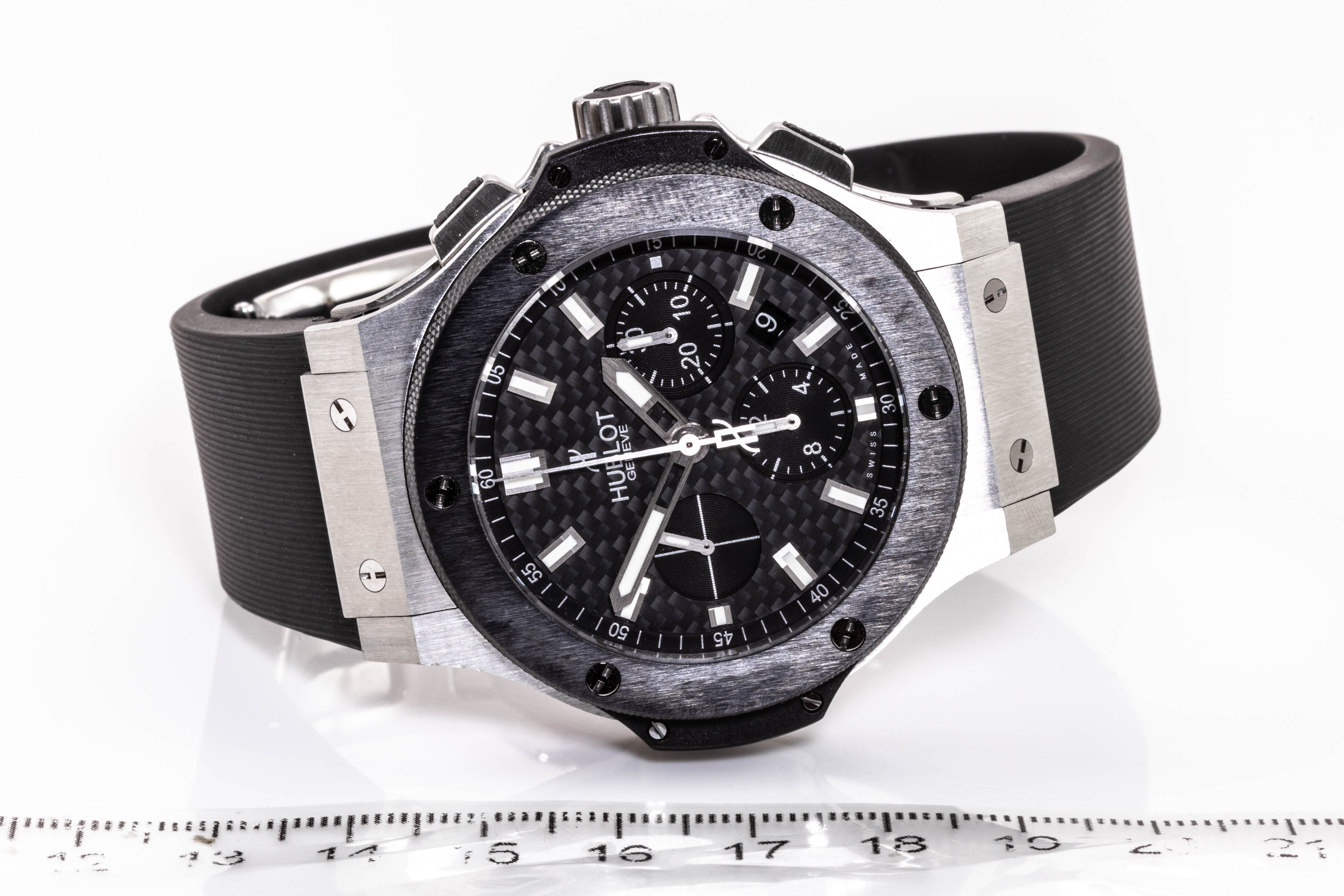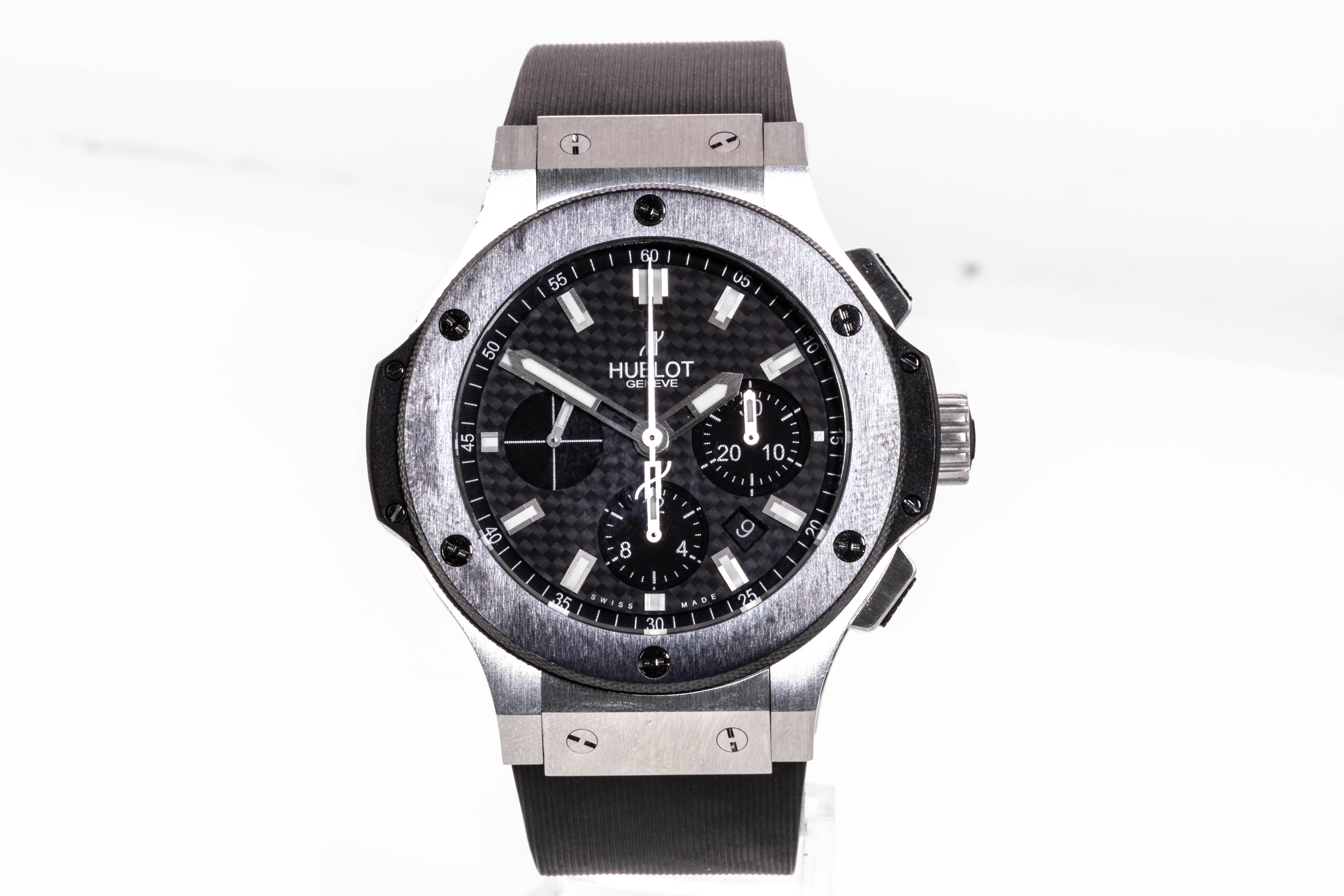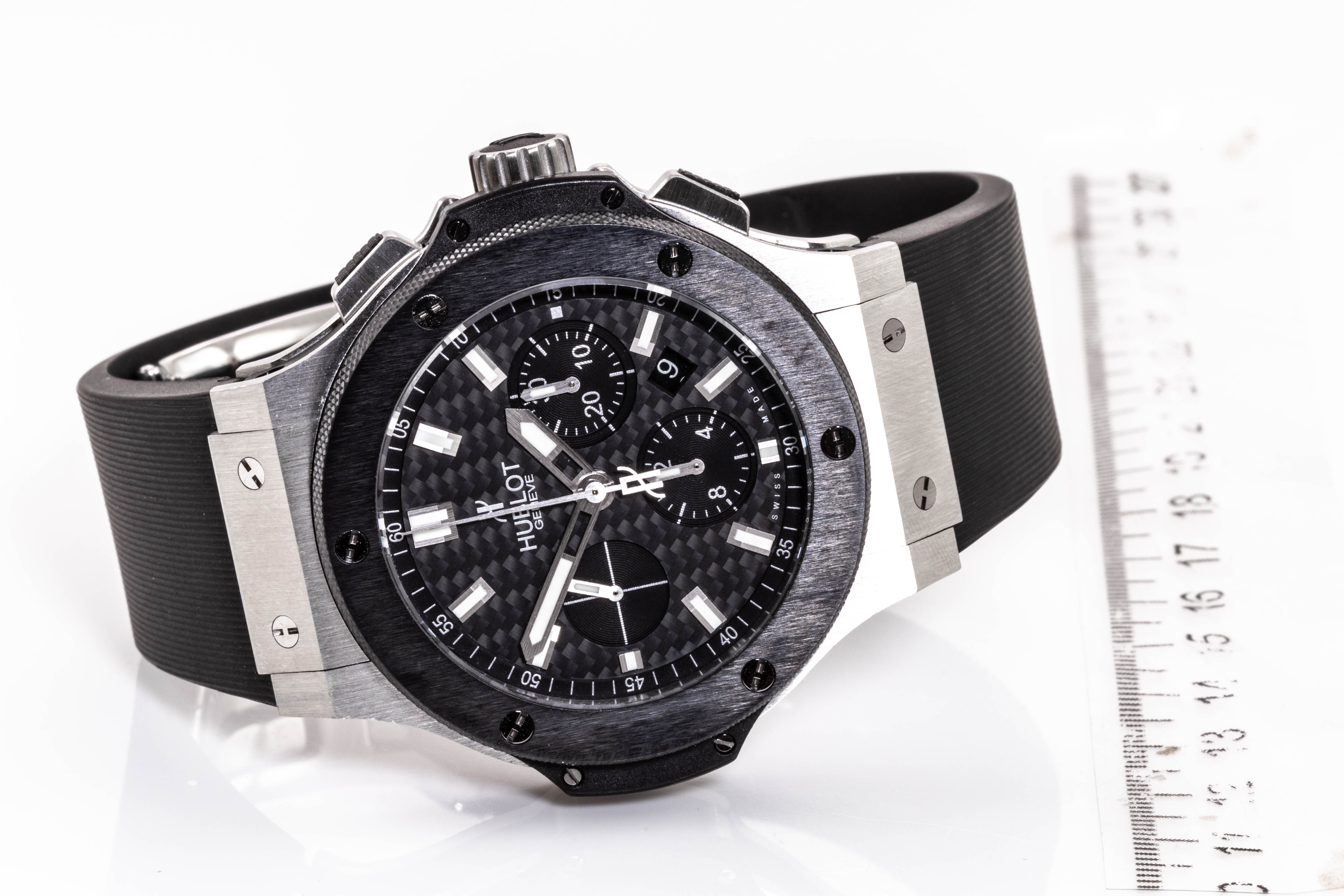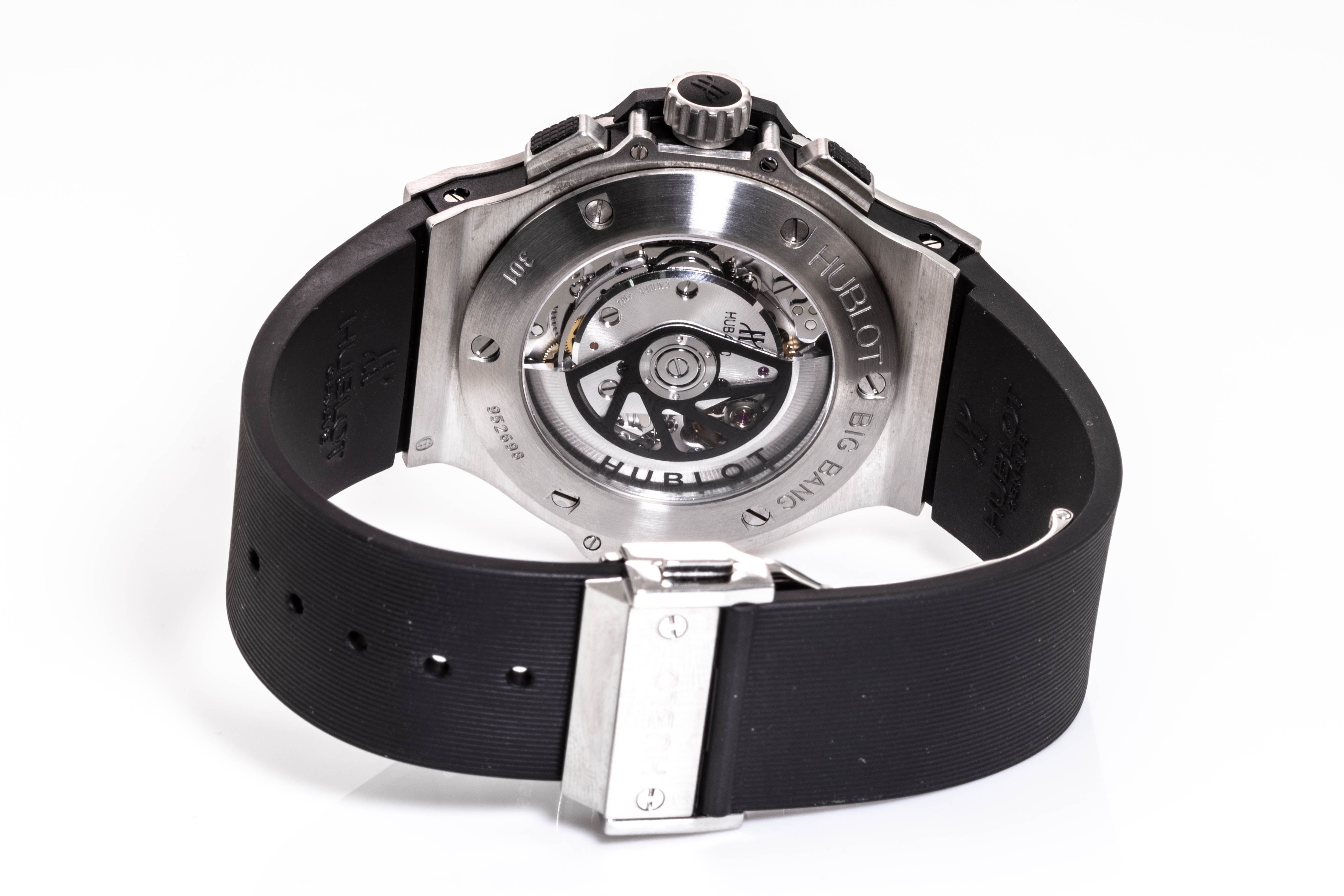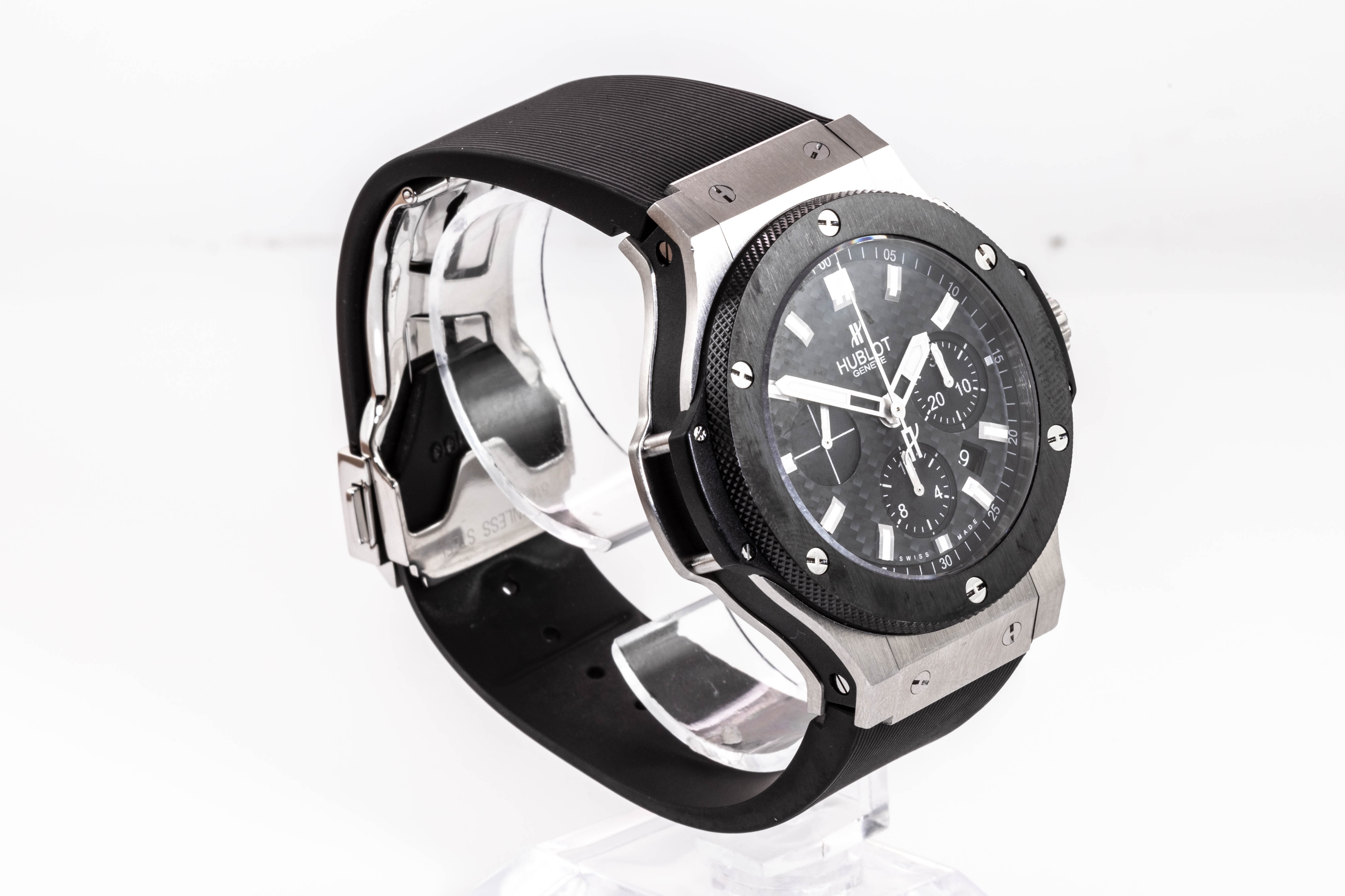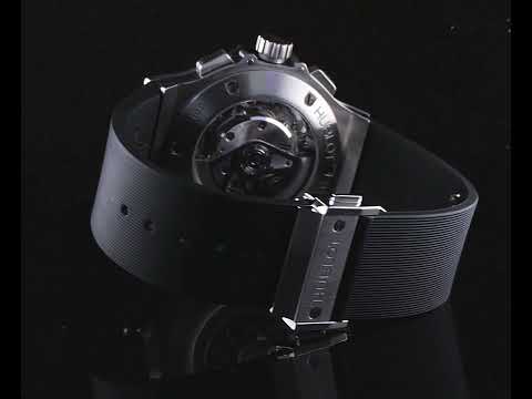 Hublot Big Bang stainless steel automatic mens watch. Black Chronograph dial, date, case diameter: 44mm, adjustable wrist size: 19cm, Swiss made. Ref# 301.SM.1770.RX. With Hublot black rubber strap and clasp. With Certificate of Authenticity, Hublot International Warranty Card dated 16/02/2014 and Hublot box. 3 month FSA warranty. (Pre-owned)
