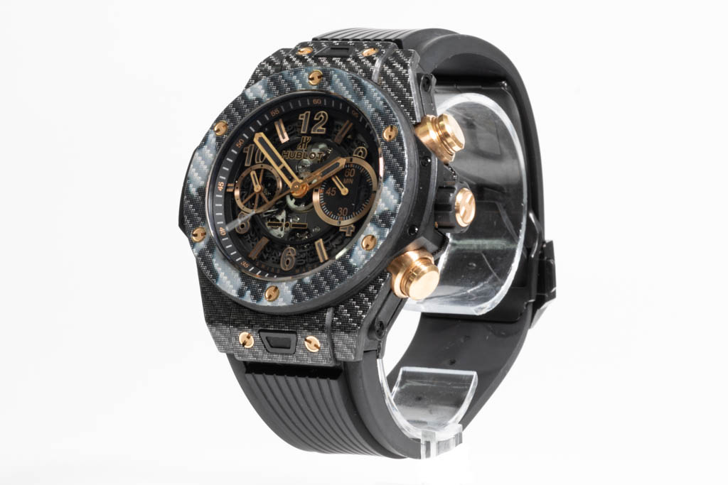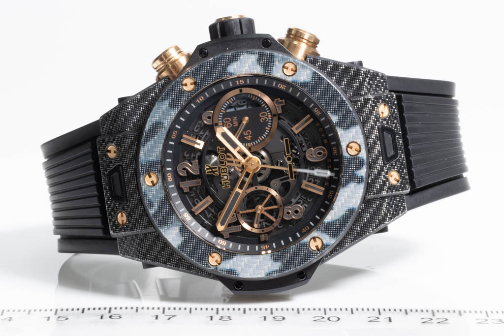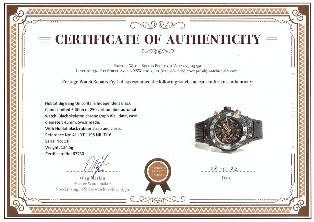 Hublot Big Bang Unico Italia Independent Black Camo Limited Edition of 250 carbon fiber automatic watch. Black skeleton chronograph dial, date, case diameter: 45mm, wrist size: 20cm. Swiss made. Ref# 411.YT.1198.NR.ITI16. With Hublot black rubber strap and clasp. With Certificate of Authenticity. 3 month FSA warranty. (Pre-owned)