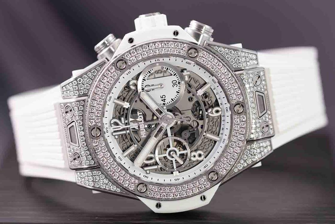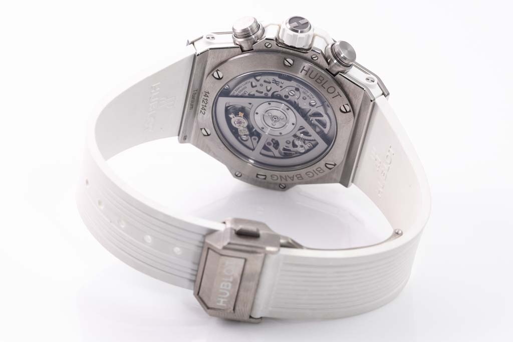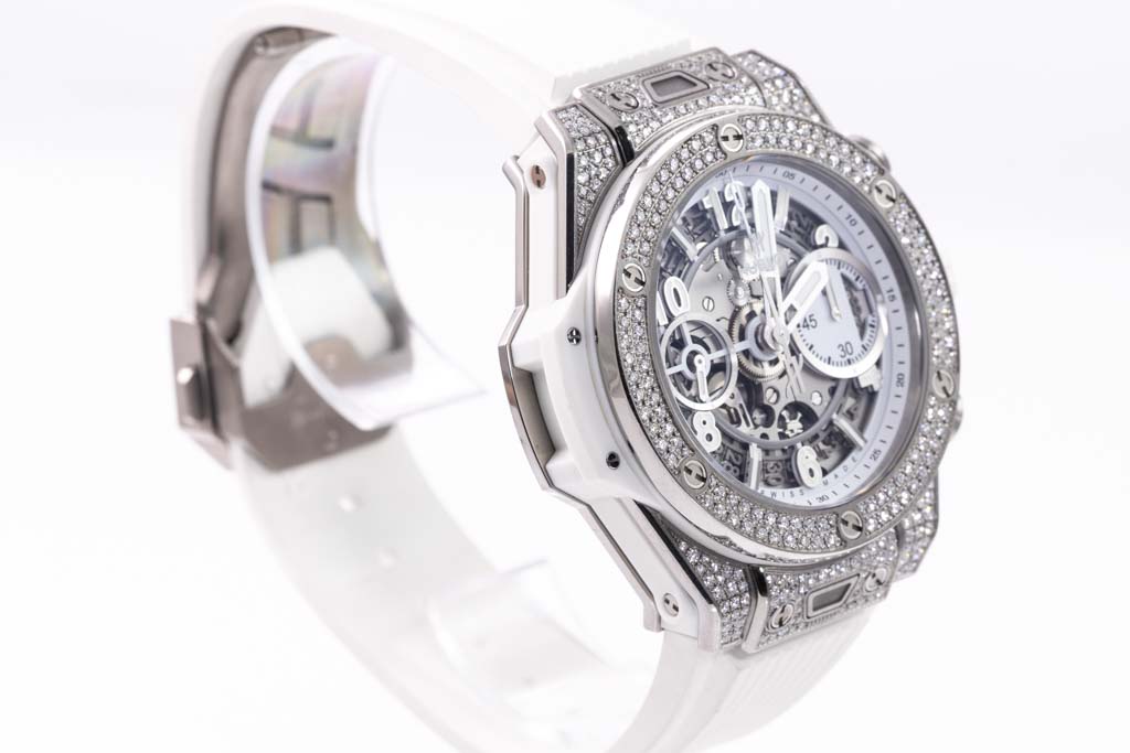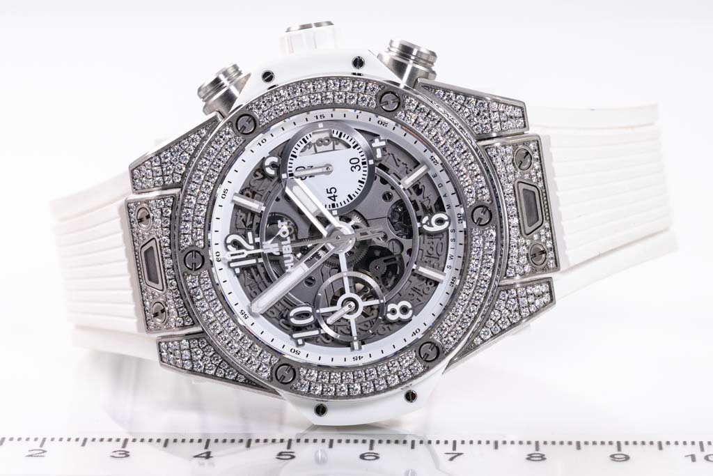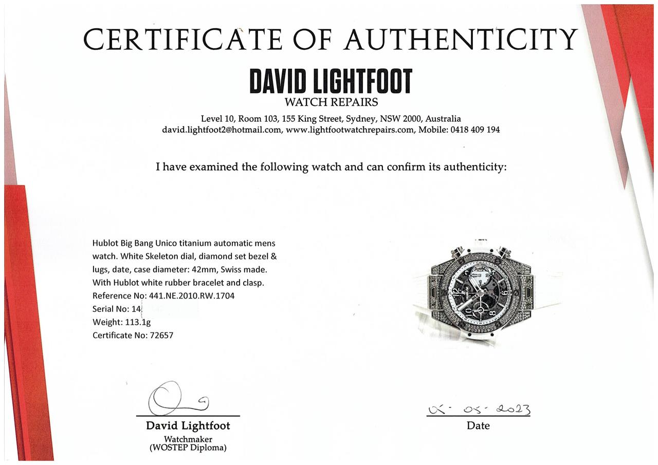 Hublot Big Bang Unico Titanium automatic mens watch. White Skeleton dial, diamond set bezel & lugs, date, case diameter: 42mm, adjustable max wrist size: 20cm, Swiss made. Ref# 441.NE.2010.RW.1704. With Hublot white rubber bracelet and clasp. With Certificate of Authenticity and Hublot International Warranty Card dated 07/12/2019. 3 month FSA warranty. (Pre-owned)