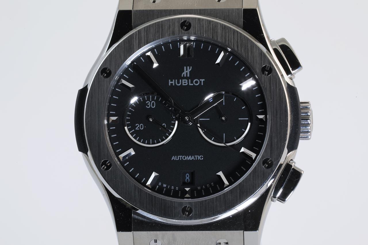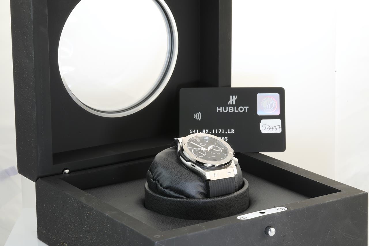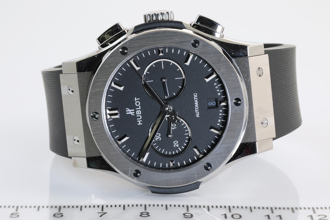 Hublot Classic Fusion titanium automatic mens watch. Black chronograph dial, case diameter: 42mm, wrist size: 19.5cm. Ref# 541.NX.1171.LR, Swiss made. With Hublot rubber strap and Hublot clasp. With Hublot international warranty card inside Hublot box. With Certificate of authenticity and Hublot box. 3 month FSA warranty. (Pre-owned)