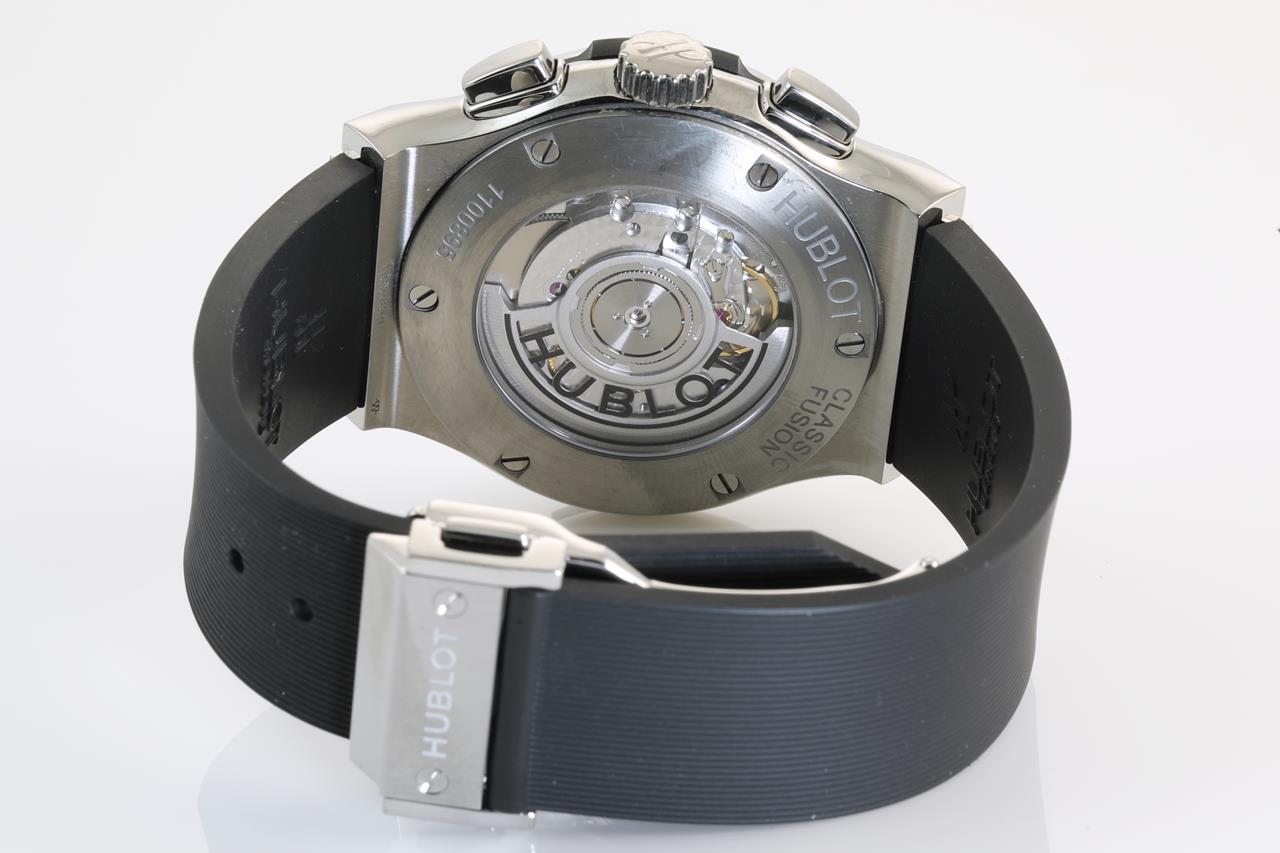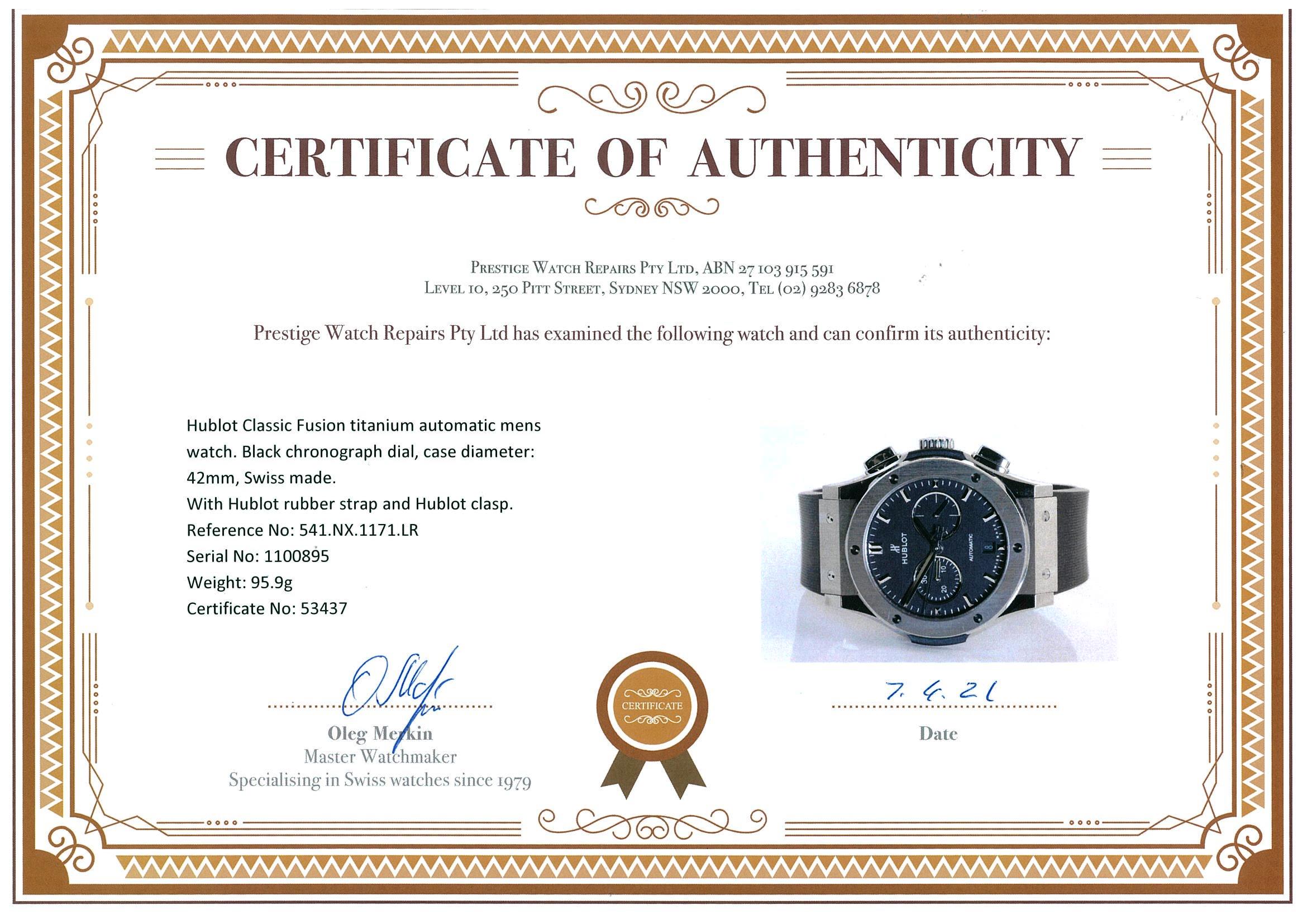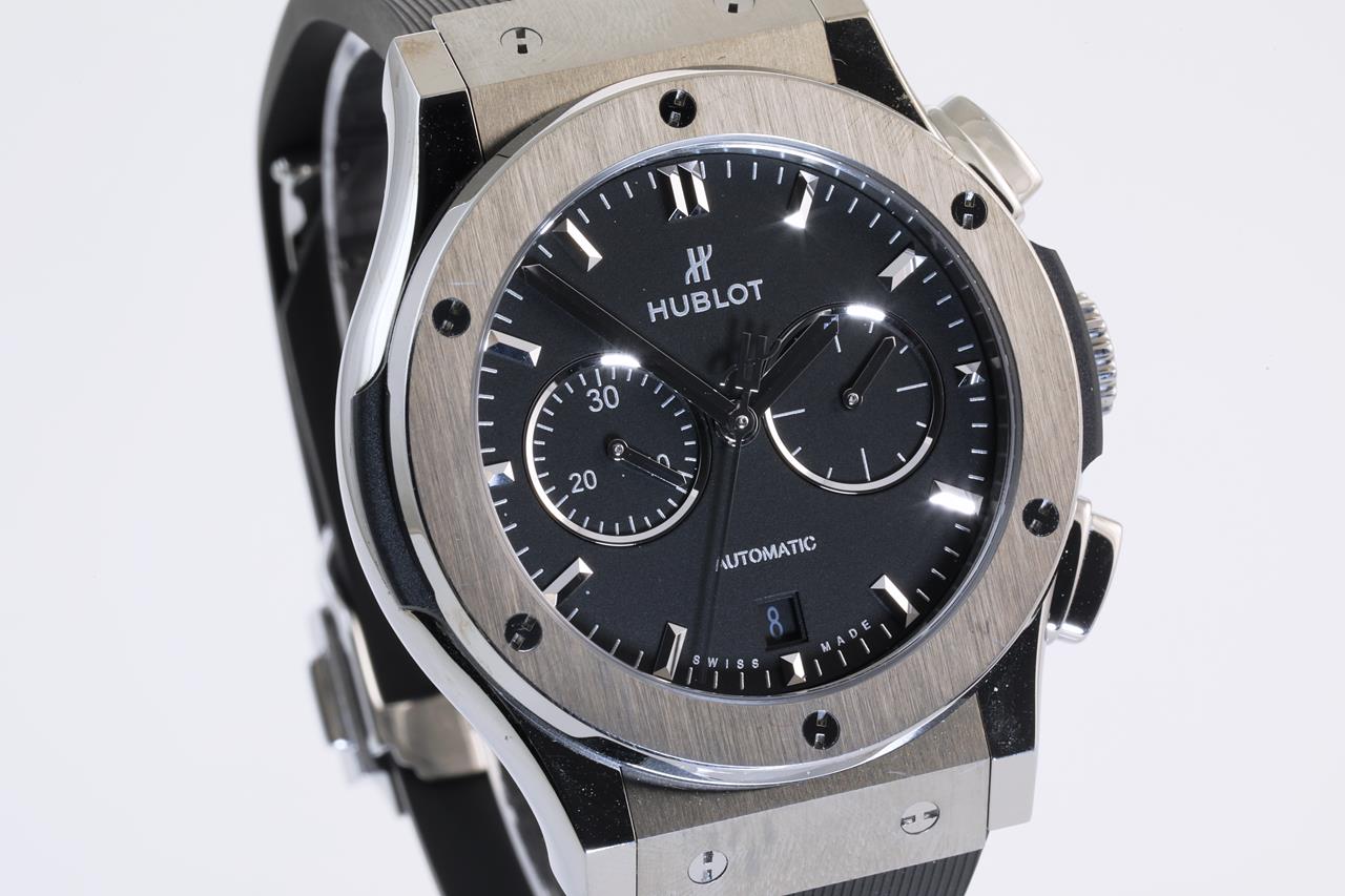 Hublot Classic Fusion titanium automatic mens watch. Black chronograph dial, case diameter: 42mm, wrist size: 19.5cm. Ref# 541.NX.1171.LR, Swiss made. With Hublot rubber strap and Hublot clasp. With Hublot international warranty card inside Hublot box. With Certificate of authenticity and Hublot box. 3 month FSA warranty. (Pre-owned)