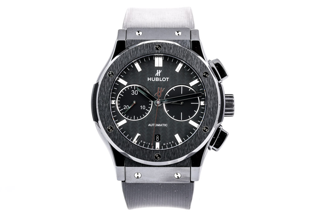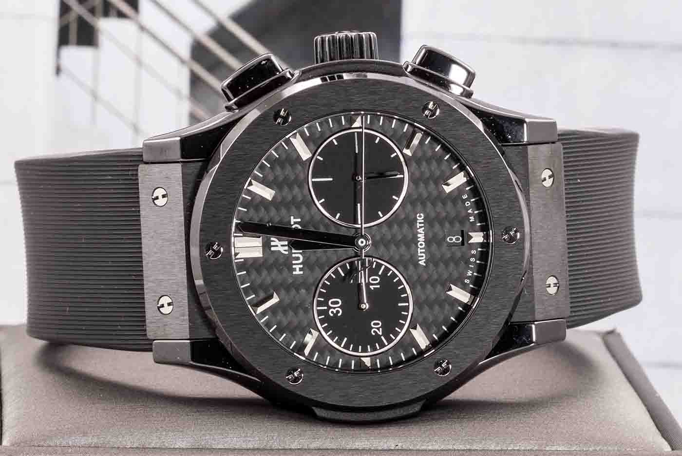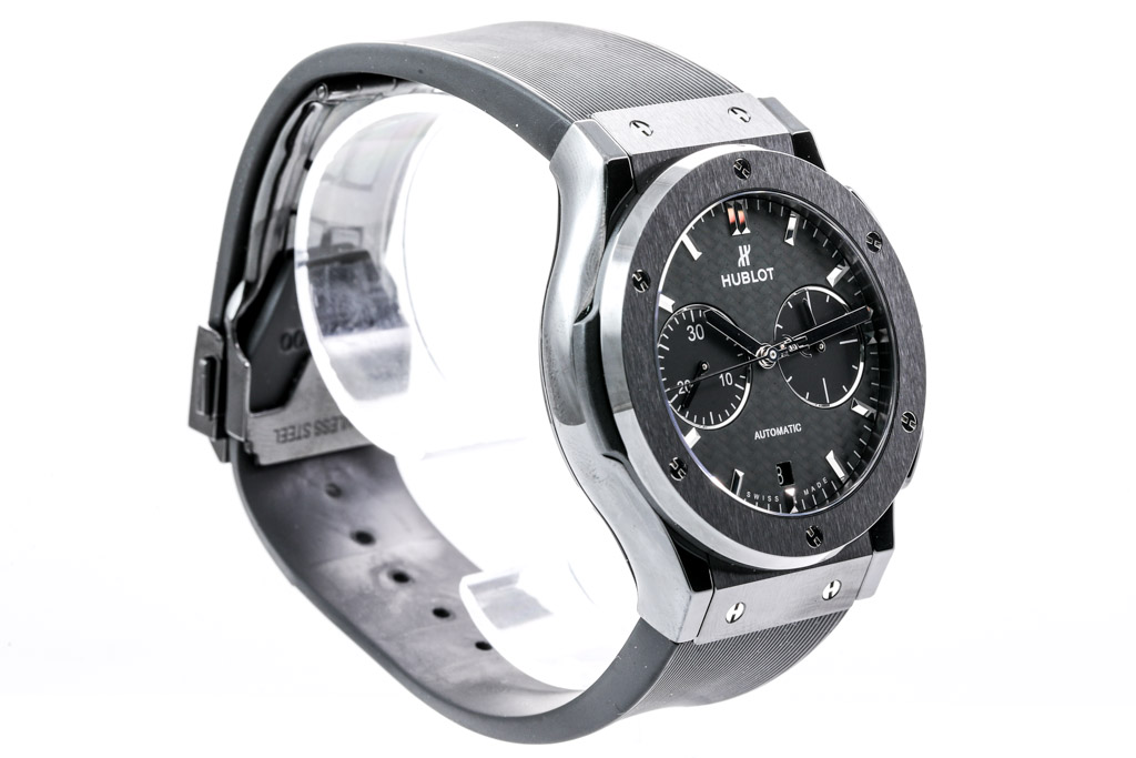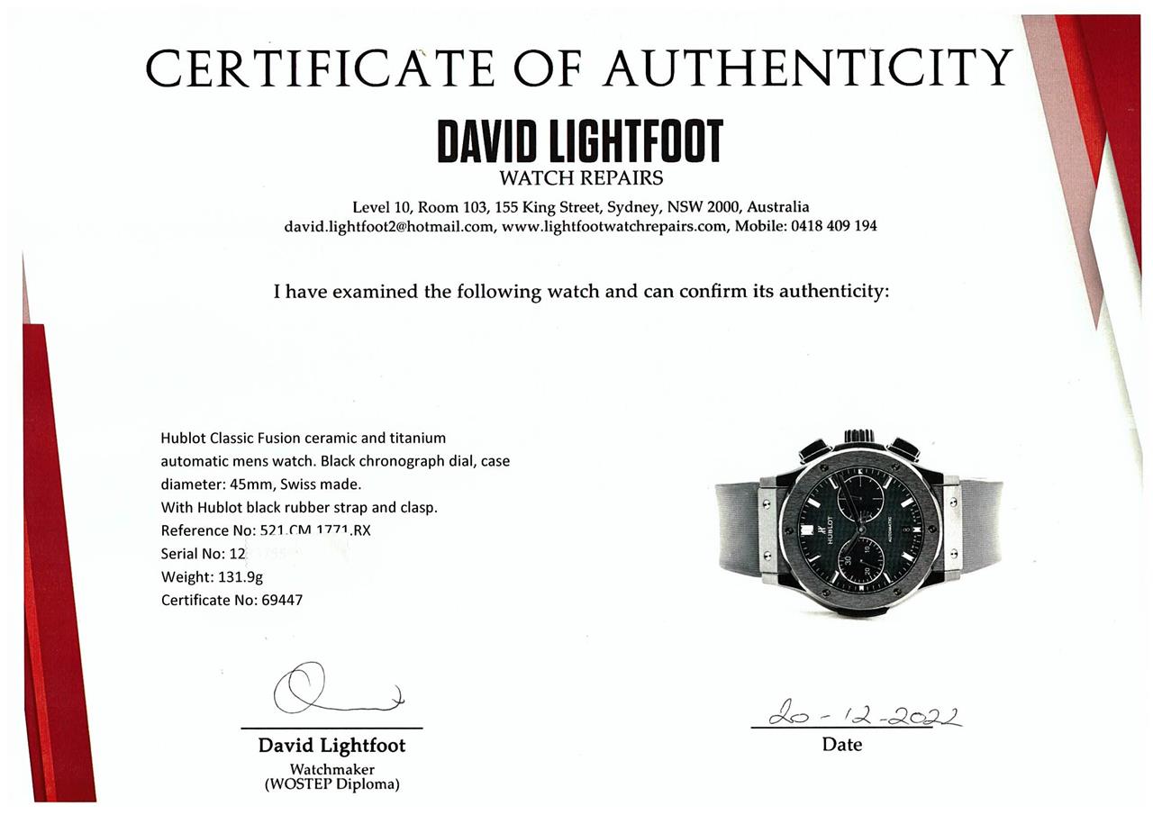 Hublot Classic Fusion ceramic and titanium automatic mens watch. Black chronograph dial, case diameter: 45mm, adjustable max wrist size: 20cm, Swiss made. Ref# 521.CM.1771.RX. With Hublot black rubber strap and clasp. With Certificate of Authenticity, Hublot International Warranty Card dated 23/08/2017 and Hublot box. 3 month FSA warranty. (Pre-owned)