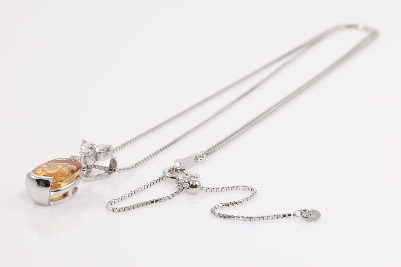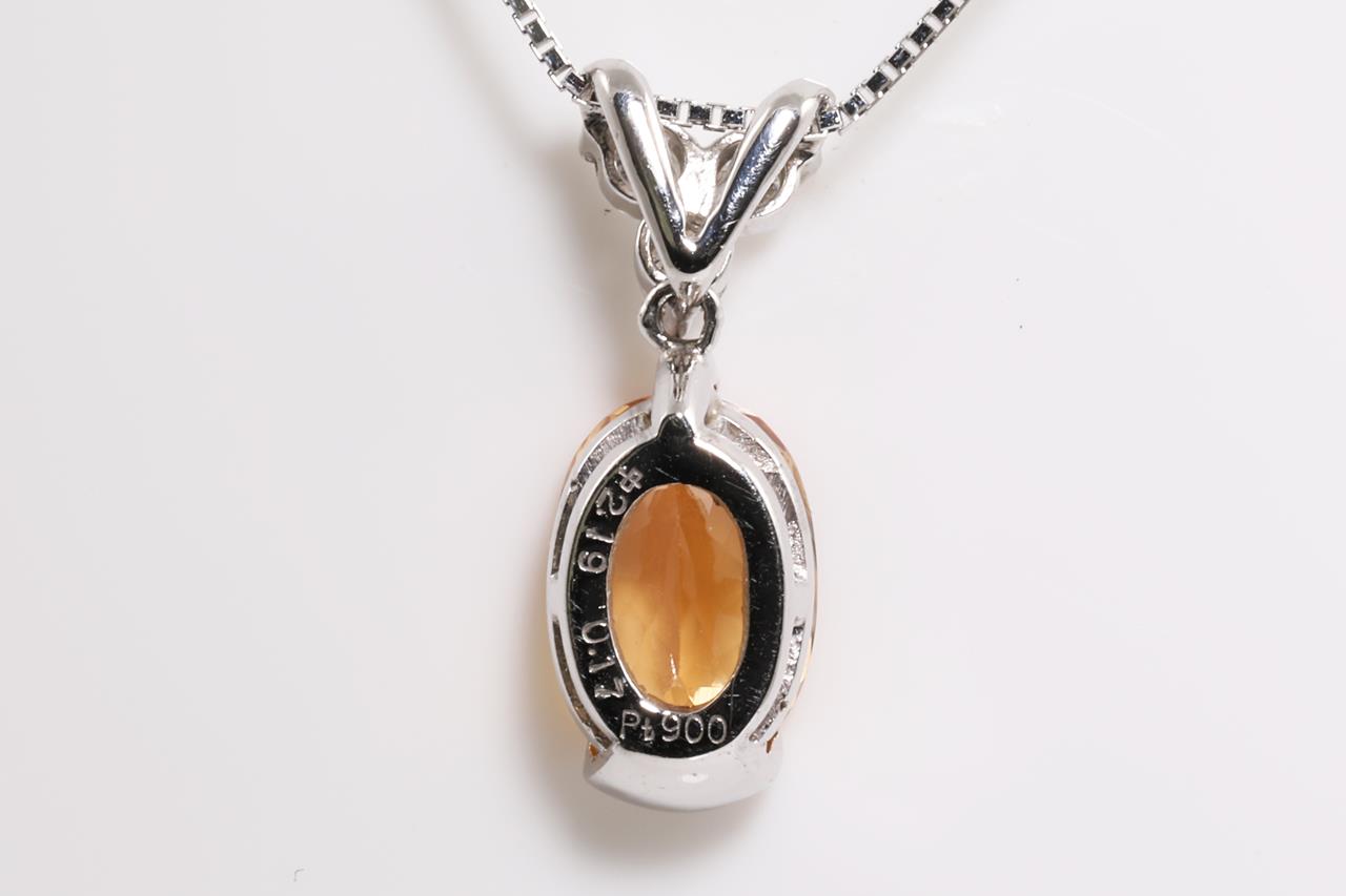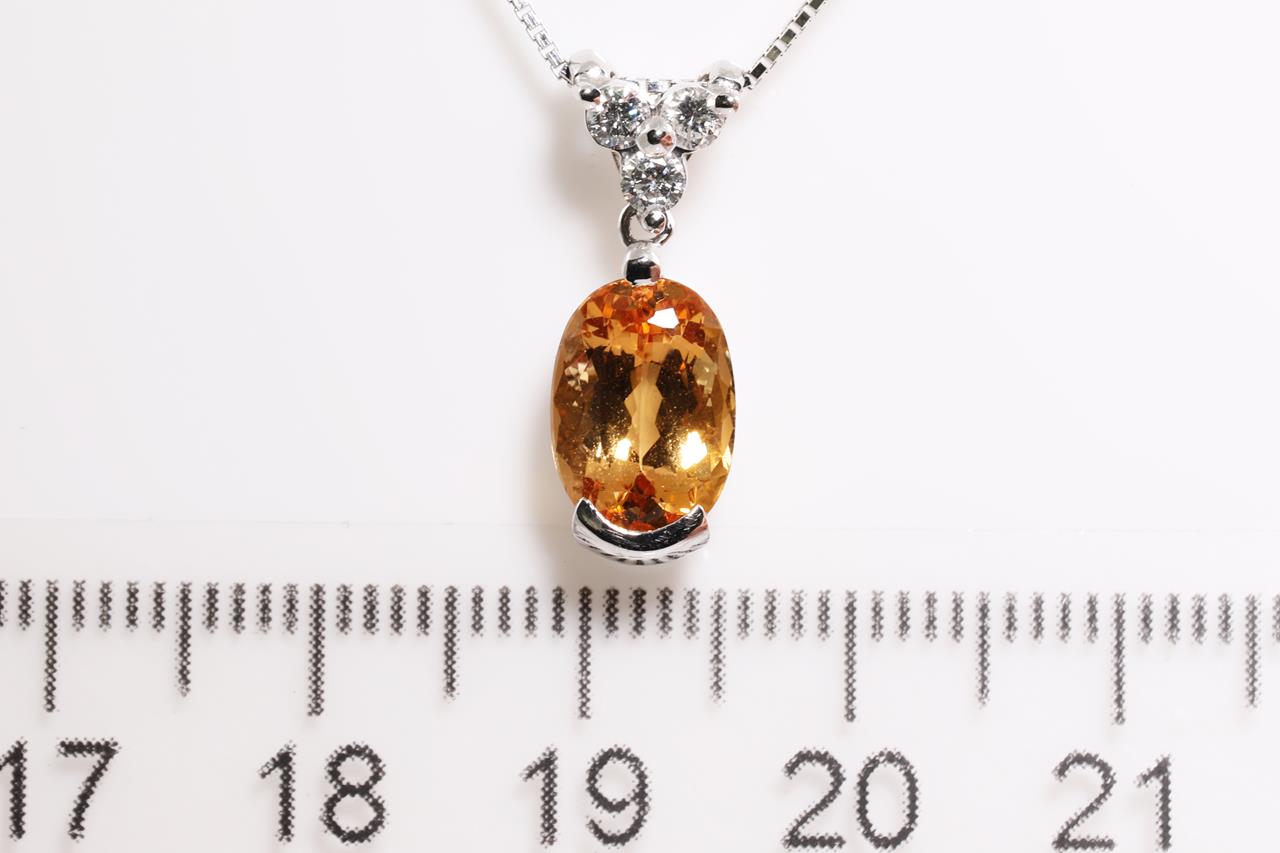 Imperial Topaz and Diamond Pendant with oval shape Imperial Topaz of 2.19cts and 3 round Diamonds totalling 0.17cts. Platinum. With 44cm 18ct white gold adjustable chain. Weight: 4.3g. (Pre-owned)