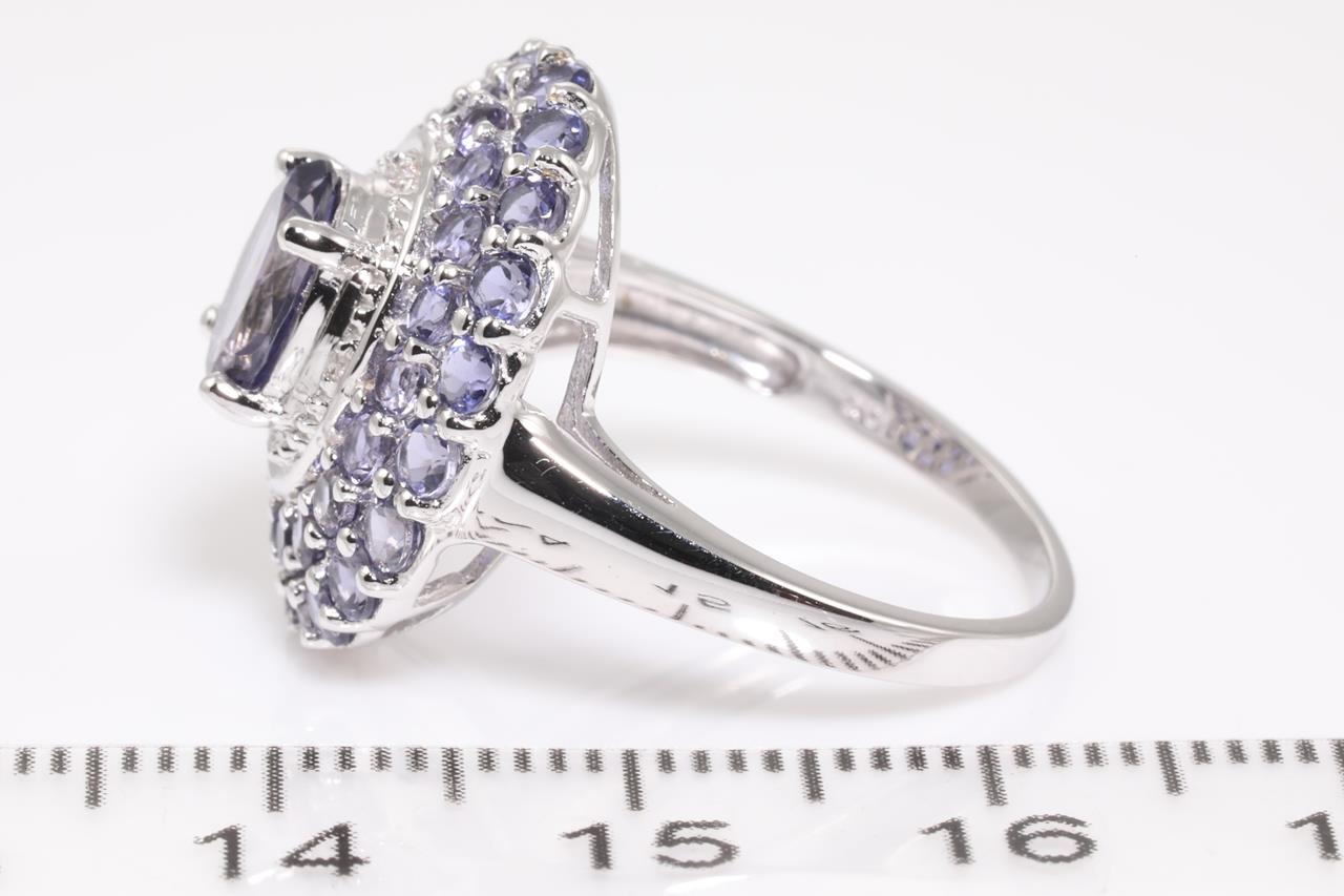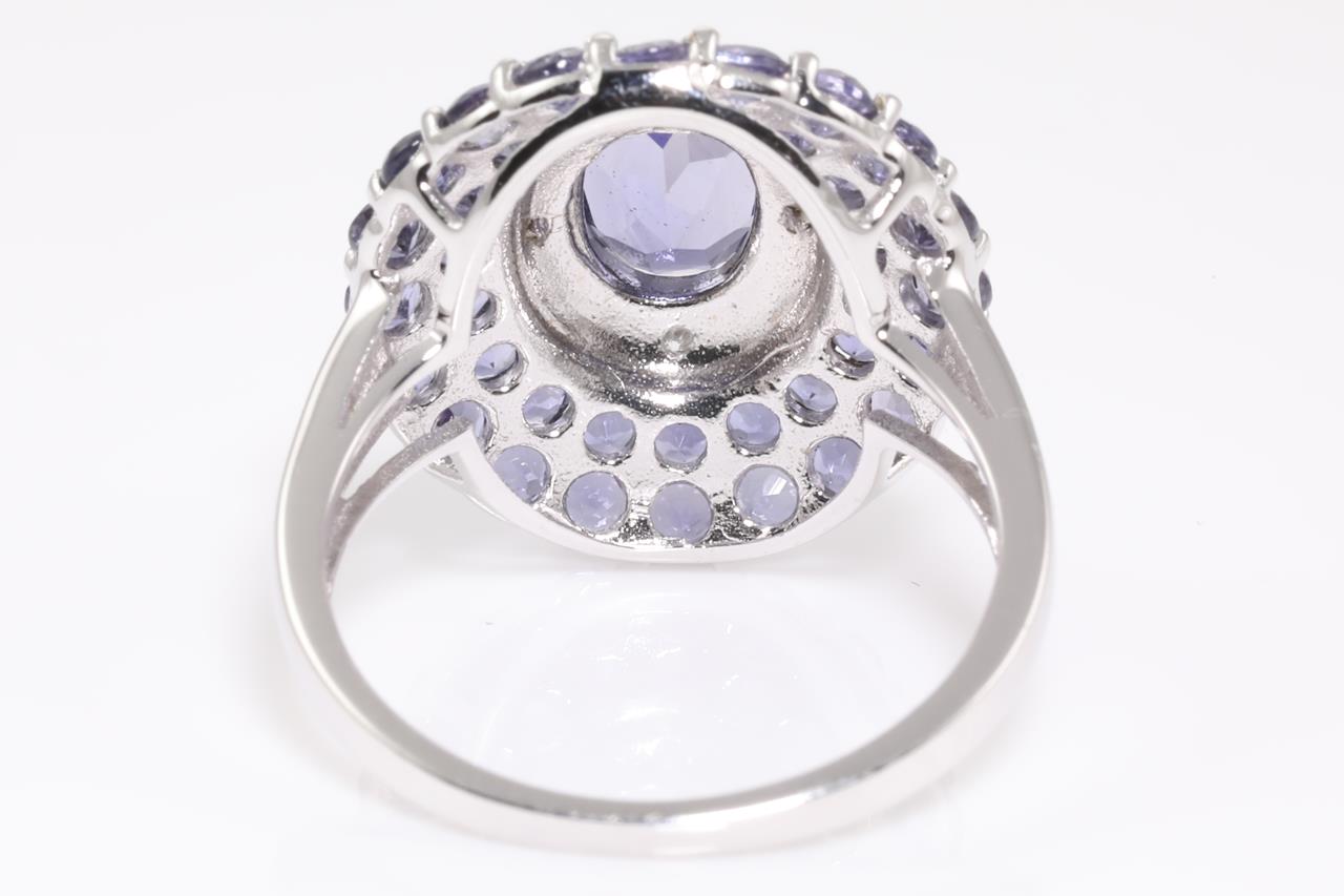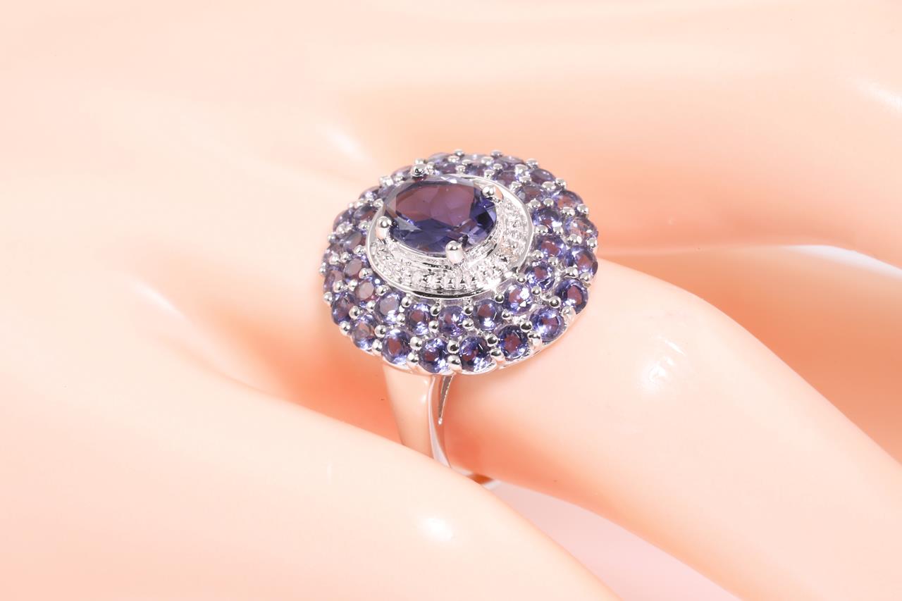 Iolite and Diamond Ring with centre oval Iolite of approximately 0.75ct, round Iolites and round Diamonds totalling approximately 0.04cts. 10ct white gold. Ring size N. Weight 4.2g. (Pre-owned)