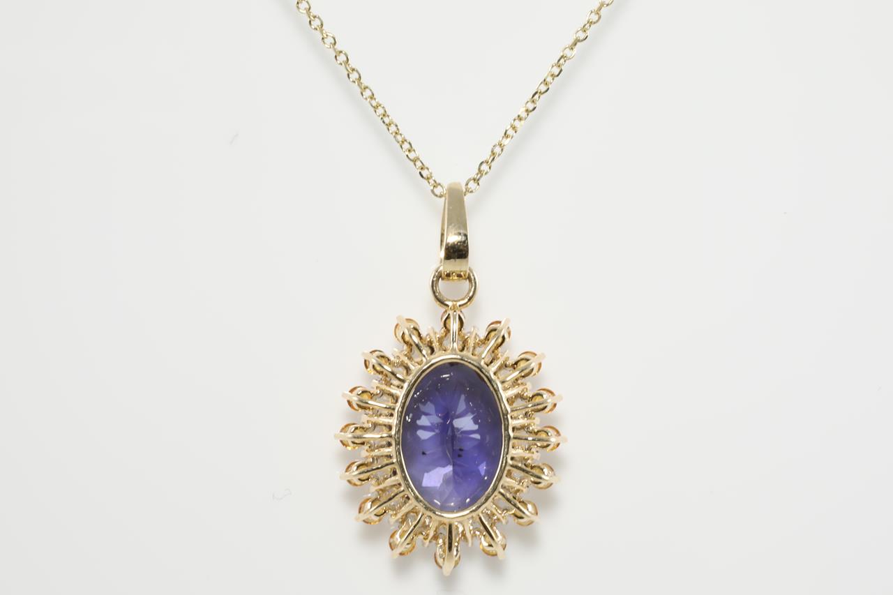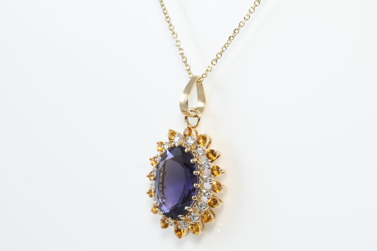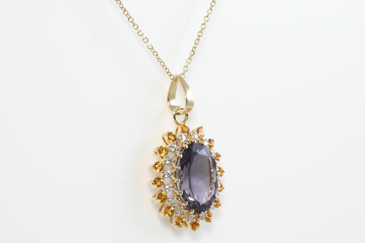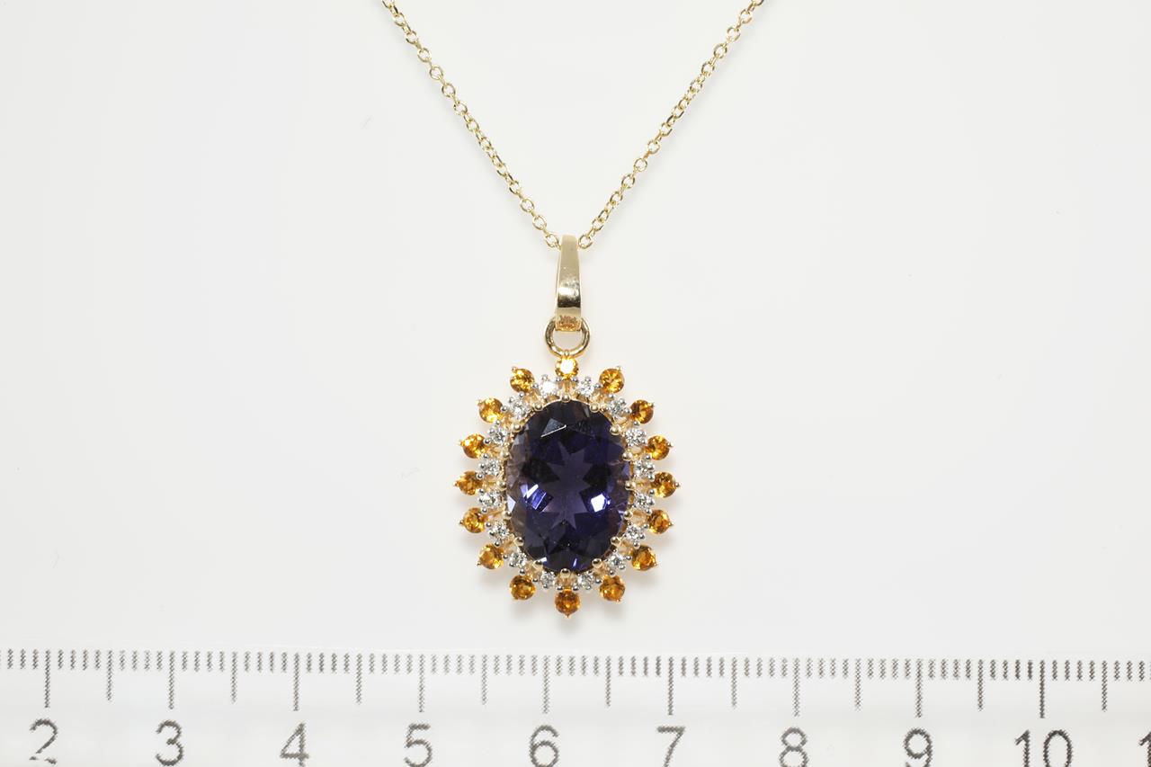 Iolite, Citrine and Diamond pendant with oval blue Iolite of 4.46ct, round Citrines totalling 0.55cts and Diamonds totalling 0.17cts. 14ct yellow gold with 14ct gold 45cm chain. Weight:5.4g (As New)