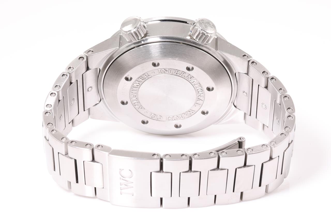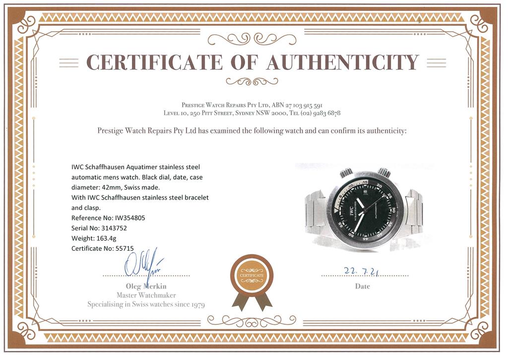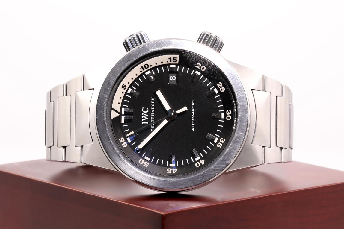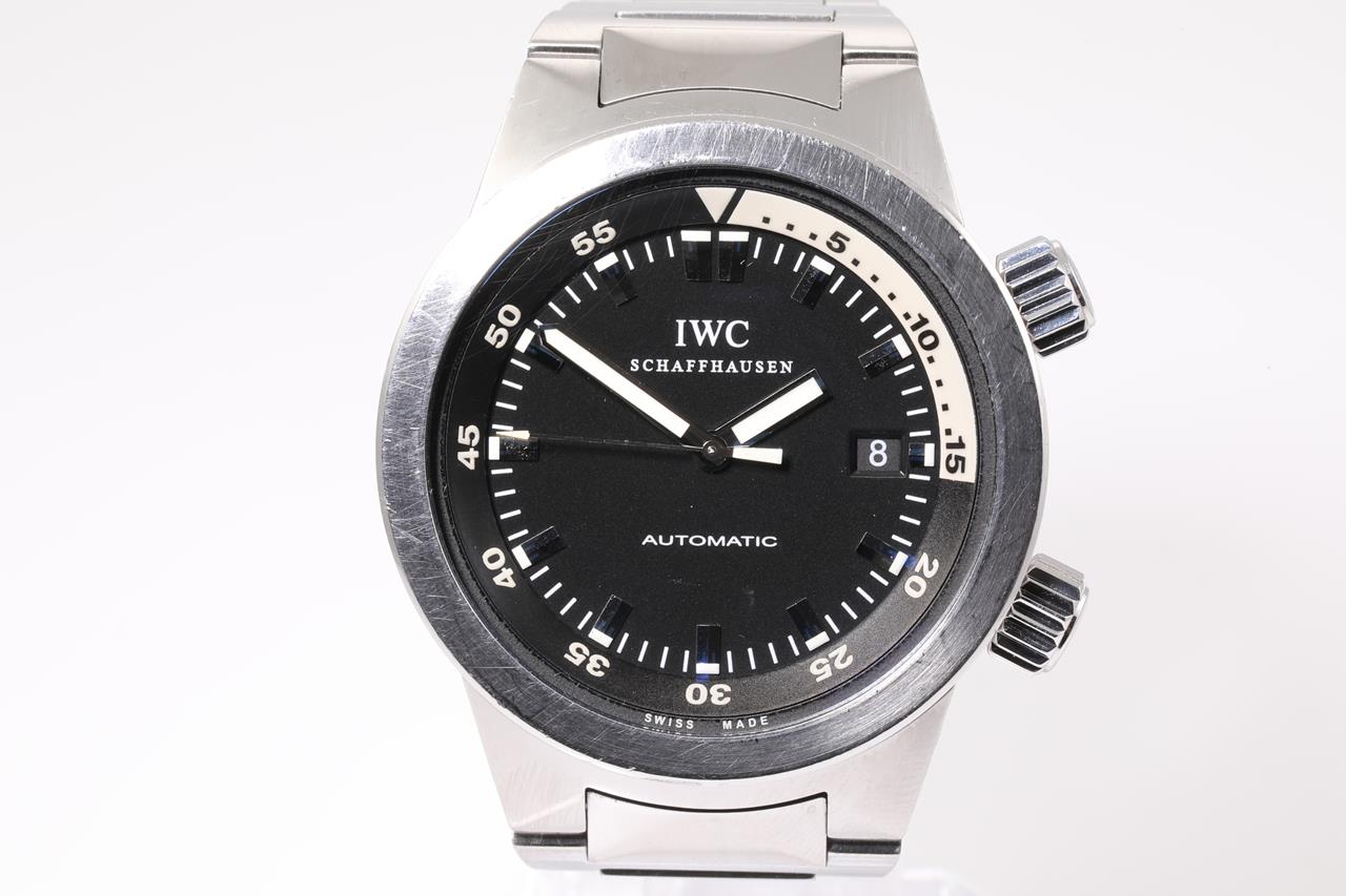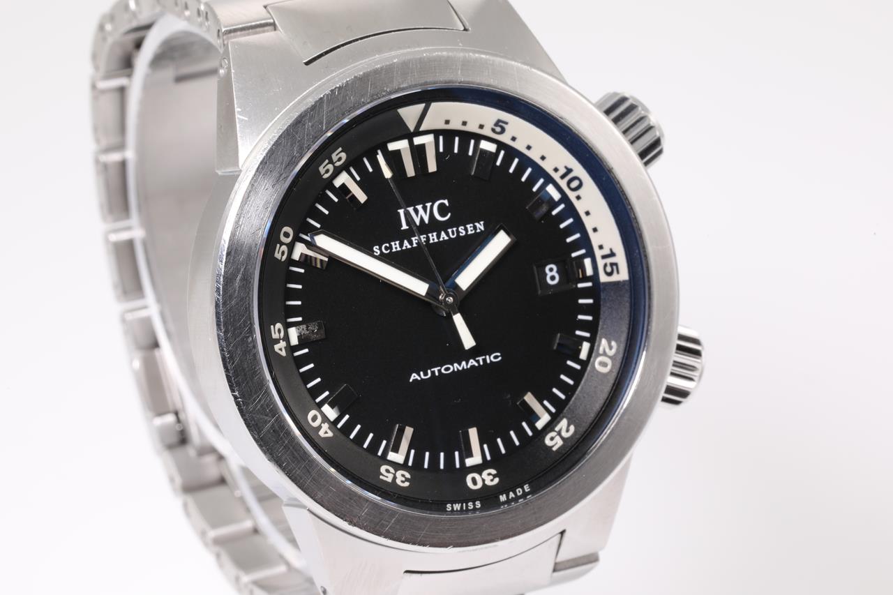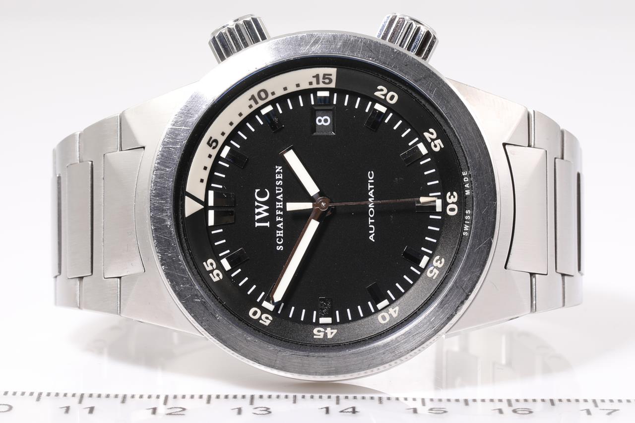 IWC Schaffhausen Aquatimer stainless steel automatic mens watch. Black dial, date, case diameter: 42mm, wrist size: 16cm, Swiss made. Ref# IW354805. With IWC Schaffhausen stainless steel bracelet and clasp. With certificate of authenticity. 3 month FSA warranty. (Pre-owned)