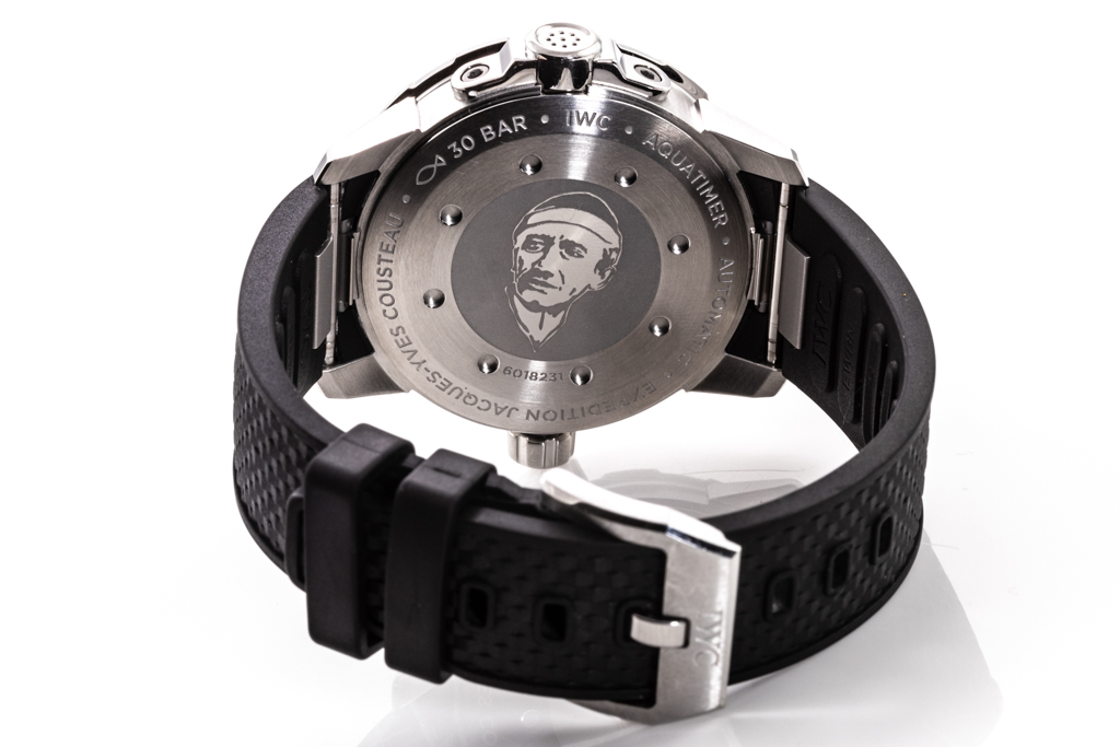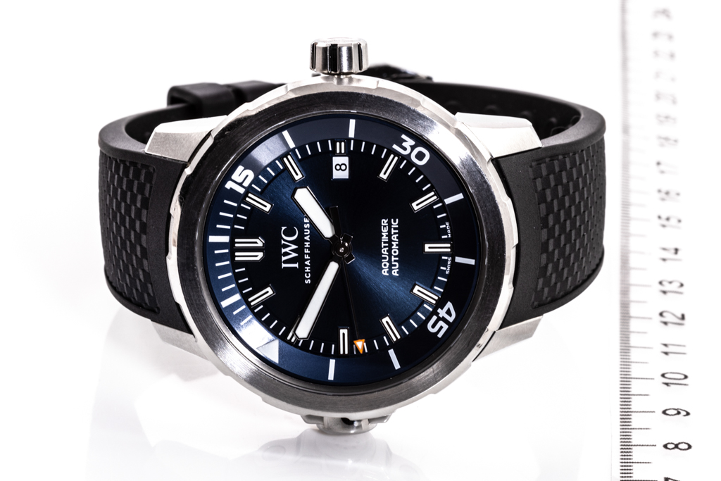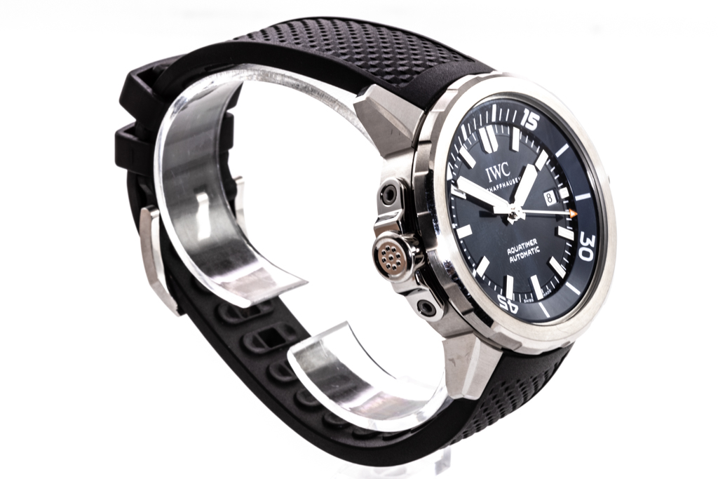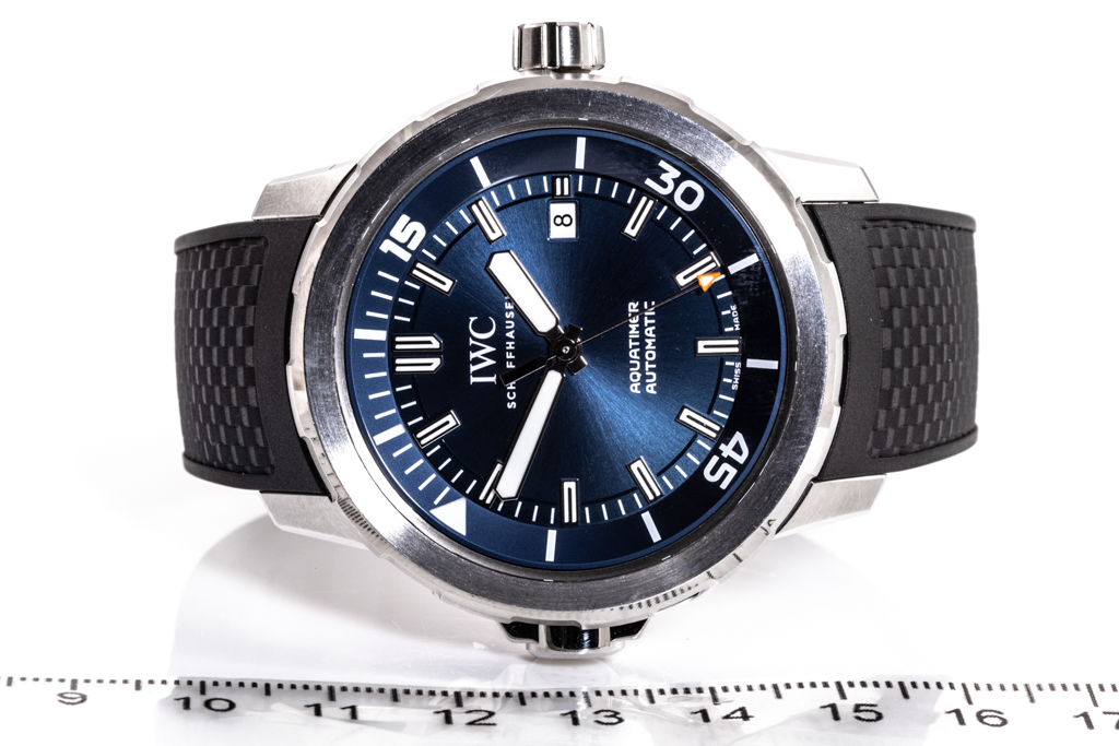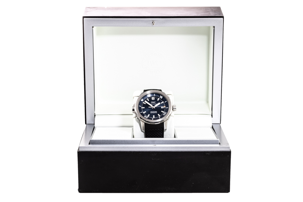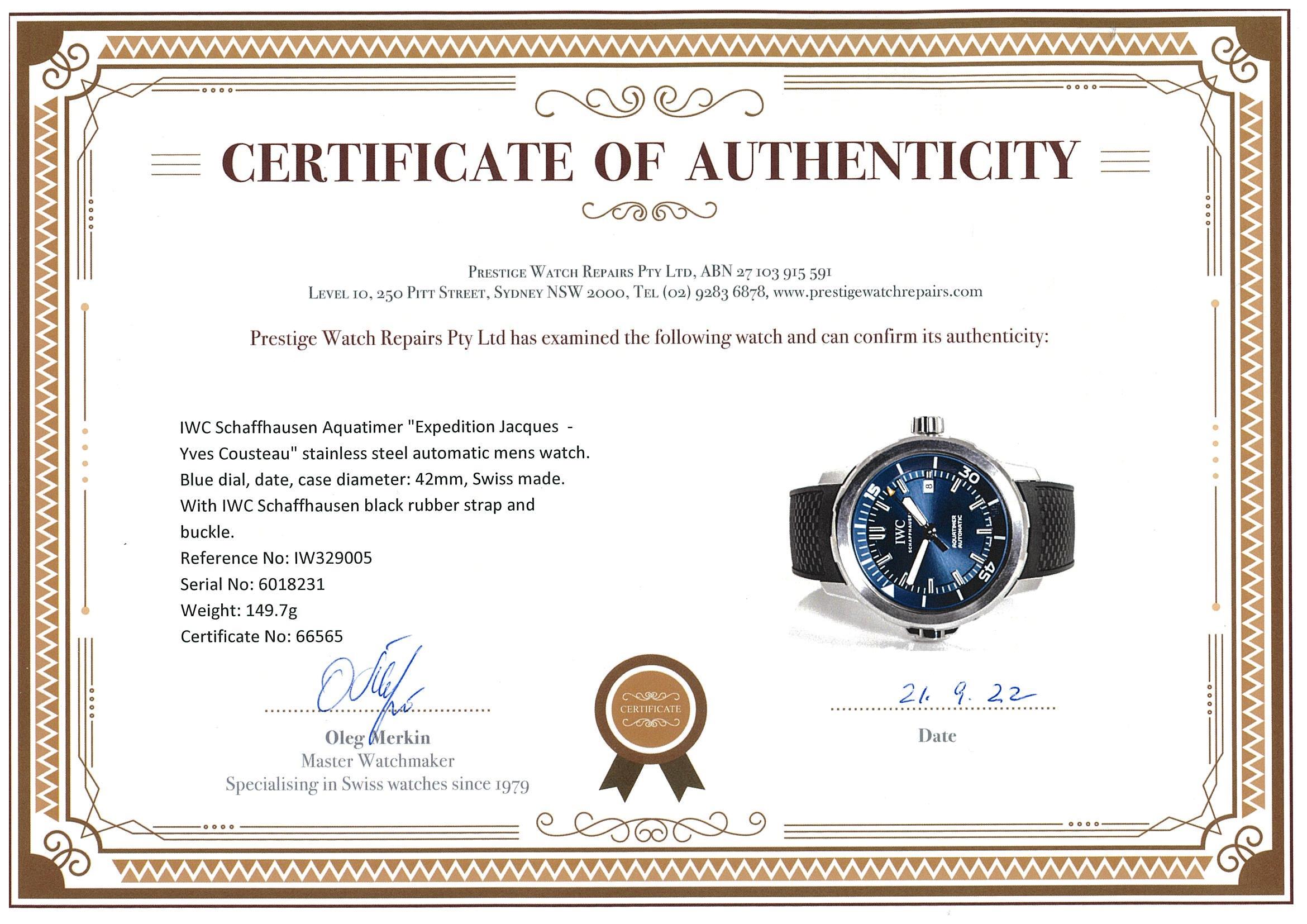 IWC Schaffhausen Aquatimer Expedition Jacques-Yves Cousteau stainless steel automatic mens watch. Blue dial, date, case diameter: 42mm, strap length: 21.5cm, Swiss made. Ref# IW329005. With IWC Schaffhausen black rubber strap and buckle. With Certificate of Authenticity, IWC Schaffhausen International Warranty Card dated 13/05/2016 and IWC Schaffhausen box. 3 month FSA warranty. (Pre-owned)