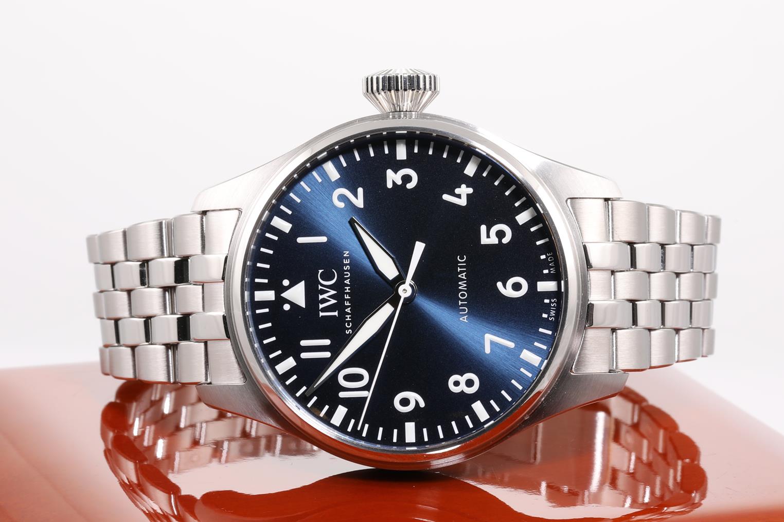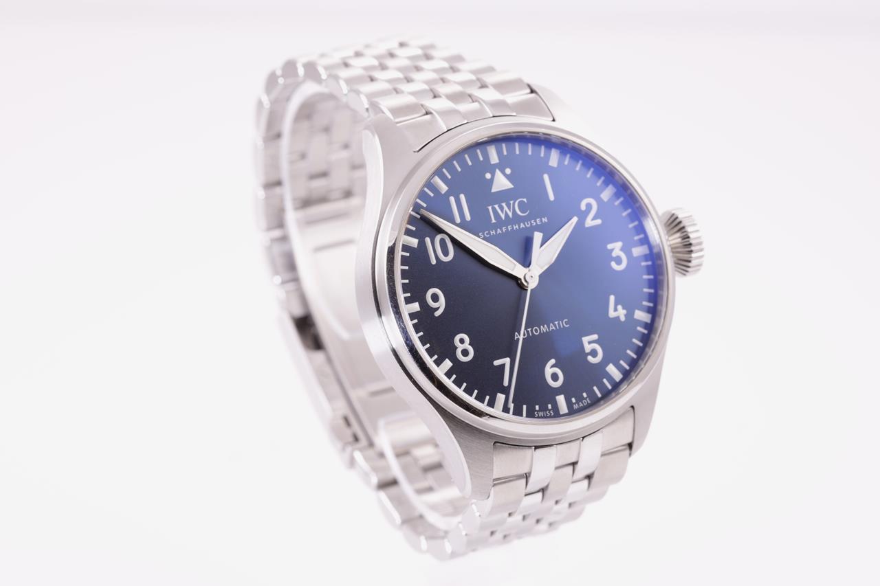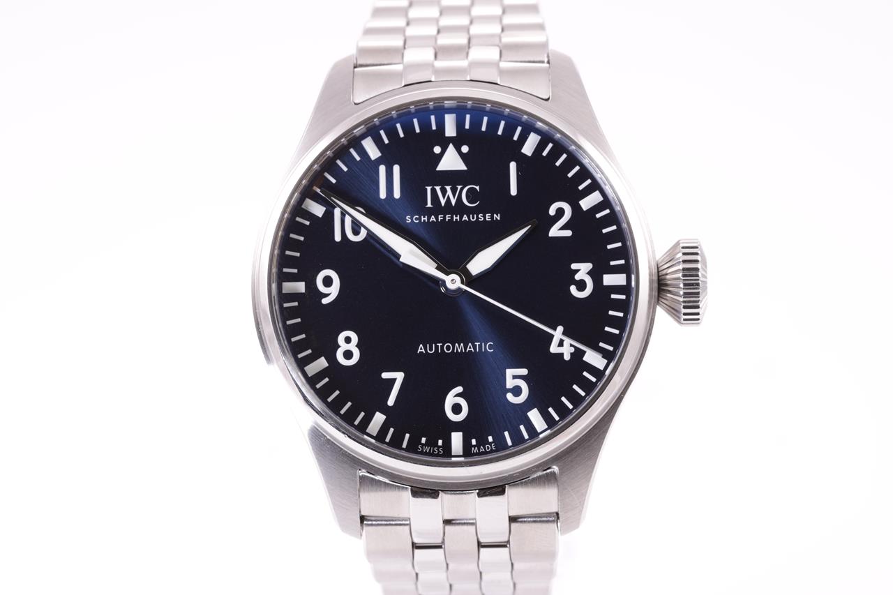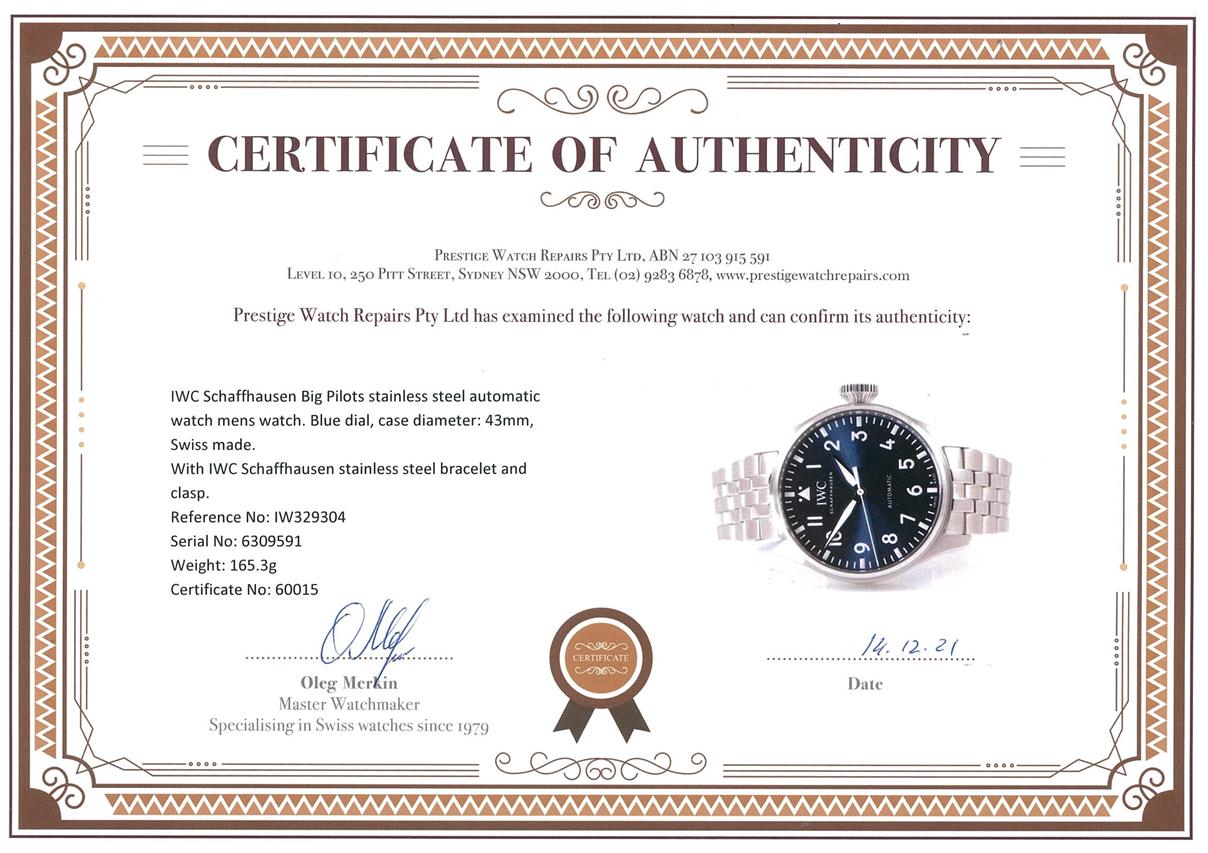IWC Schaffhausen Big Pilot's stainless steel automatic watch mens watch. Blue dial, case diameter: 43mm, wrist size: 19cm, Swiss made. Ref# IW329304. With IWC Schaffhausen stainless steel bracelet and clasp. With Certificate of Authenticity, IWC Schaffhausen International Warranty Card dated 22/08/2021 and IWC Schaffhausen box. 3 month FSA warranty. (Pre-owned)