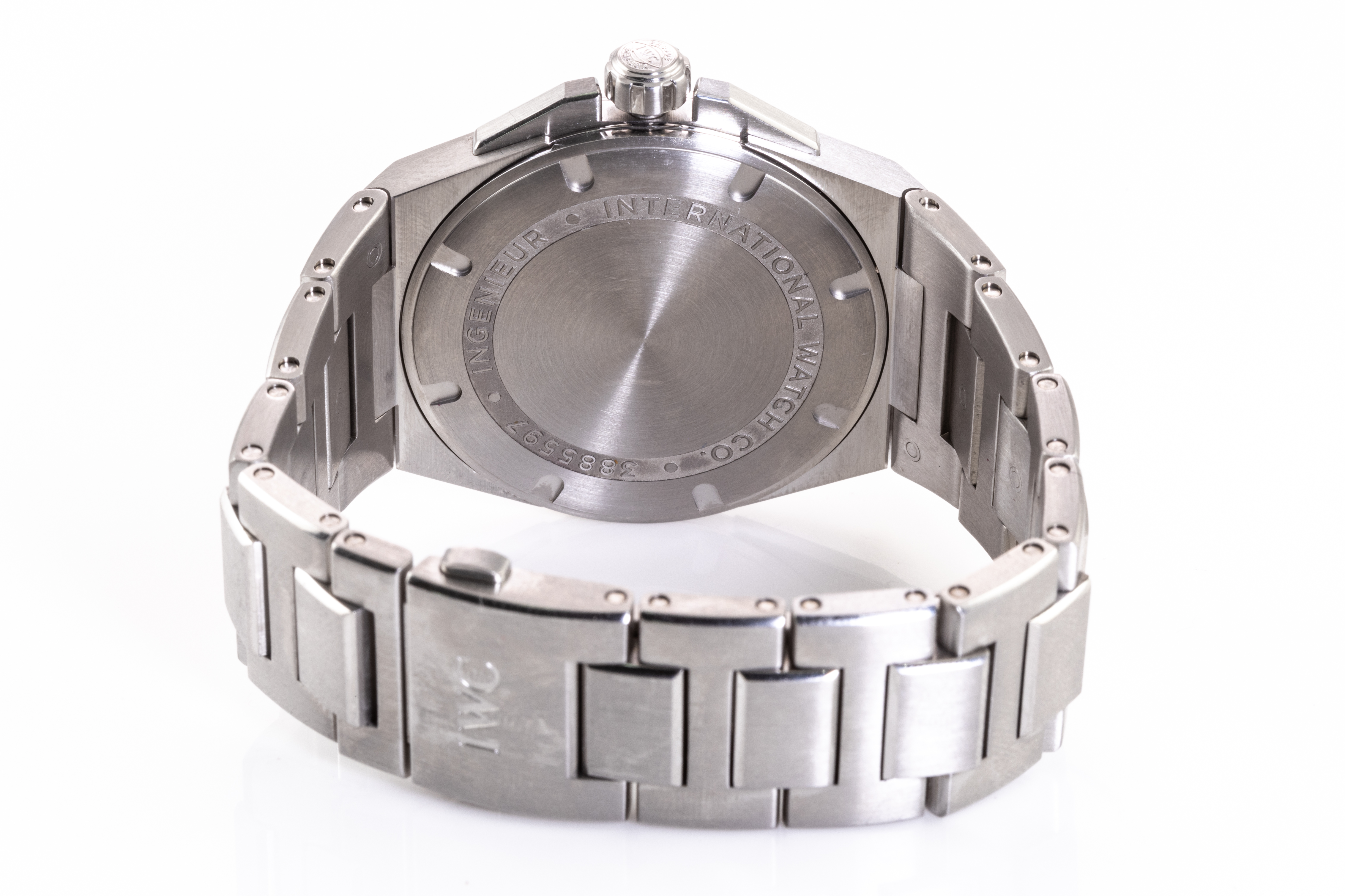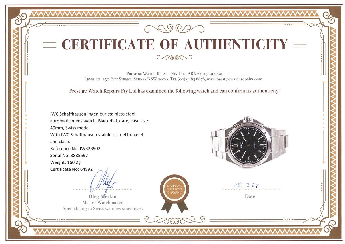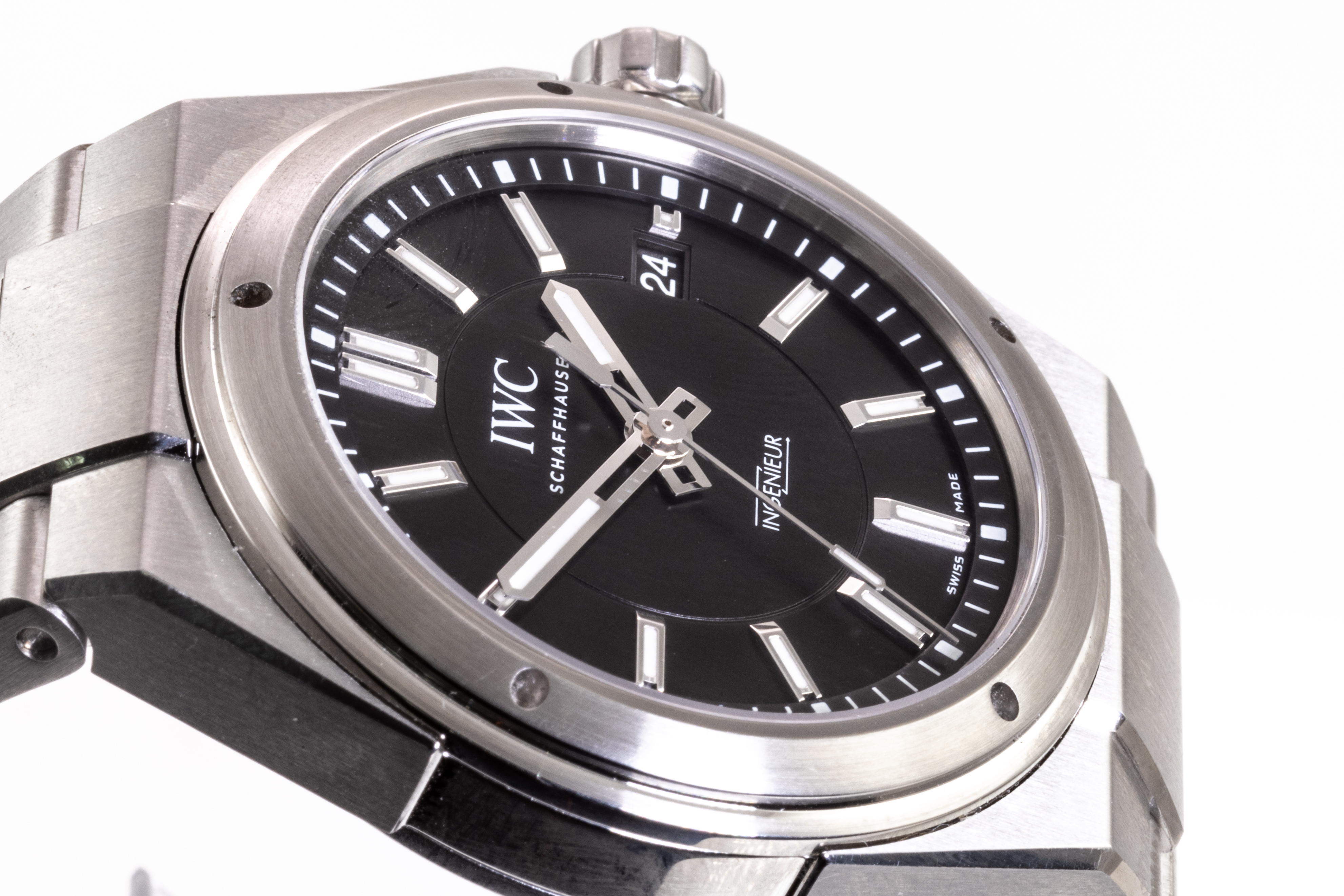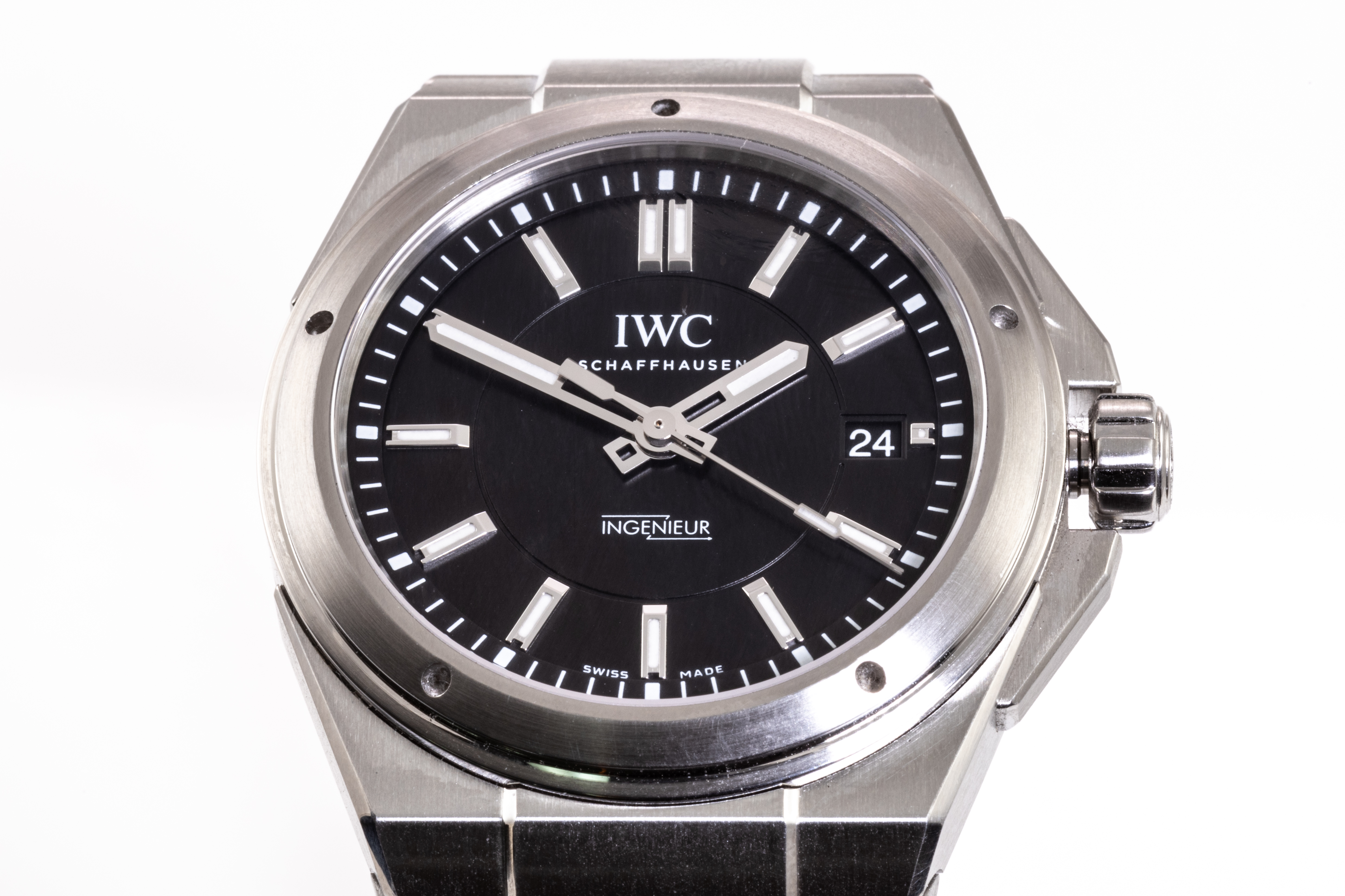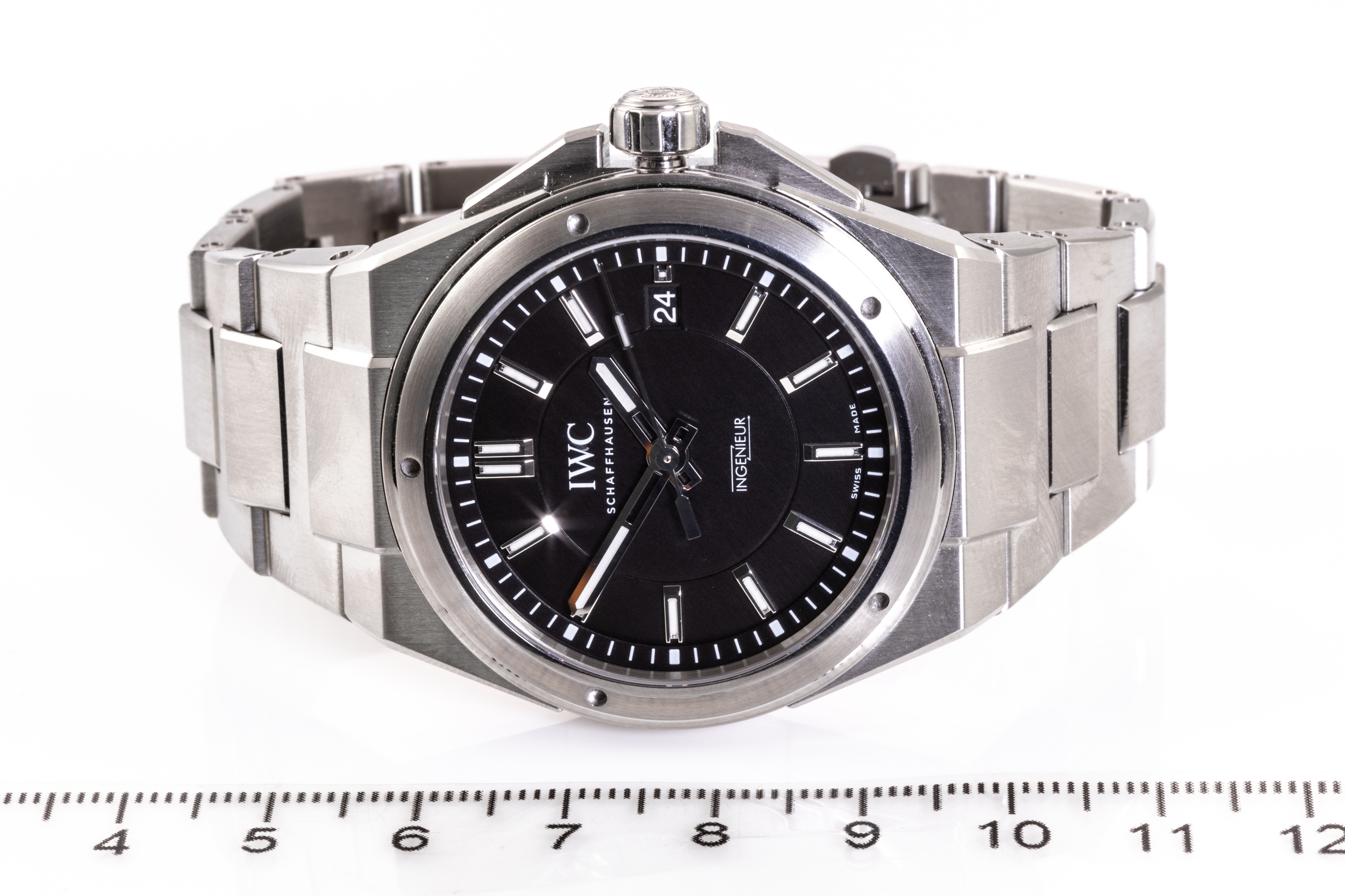 IWC Schaffhausen Ingenieur stainless steel automatic mens watch. Black dial, date, case size: 40mm, wrist size: 16cm, Swiss made. Ref# IW323902. With IWC Schaffhausen stainless steel bracelet and clasp. With Certificate of Authenticity, IWC Schaffhausen International Guarantee Card dated 19/05/2013. 3 month FSA warranty. (Pre-owned)