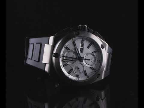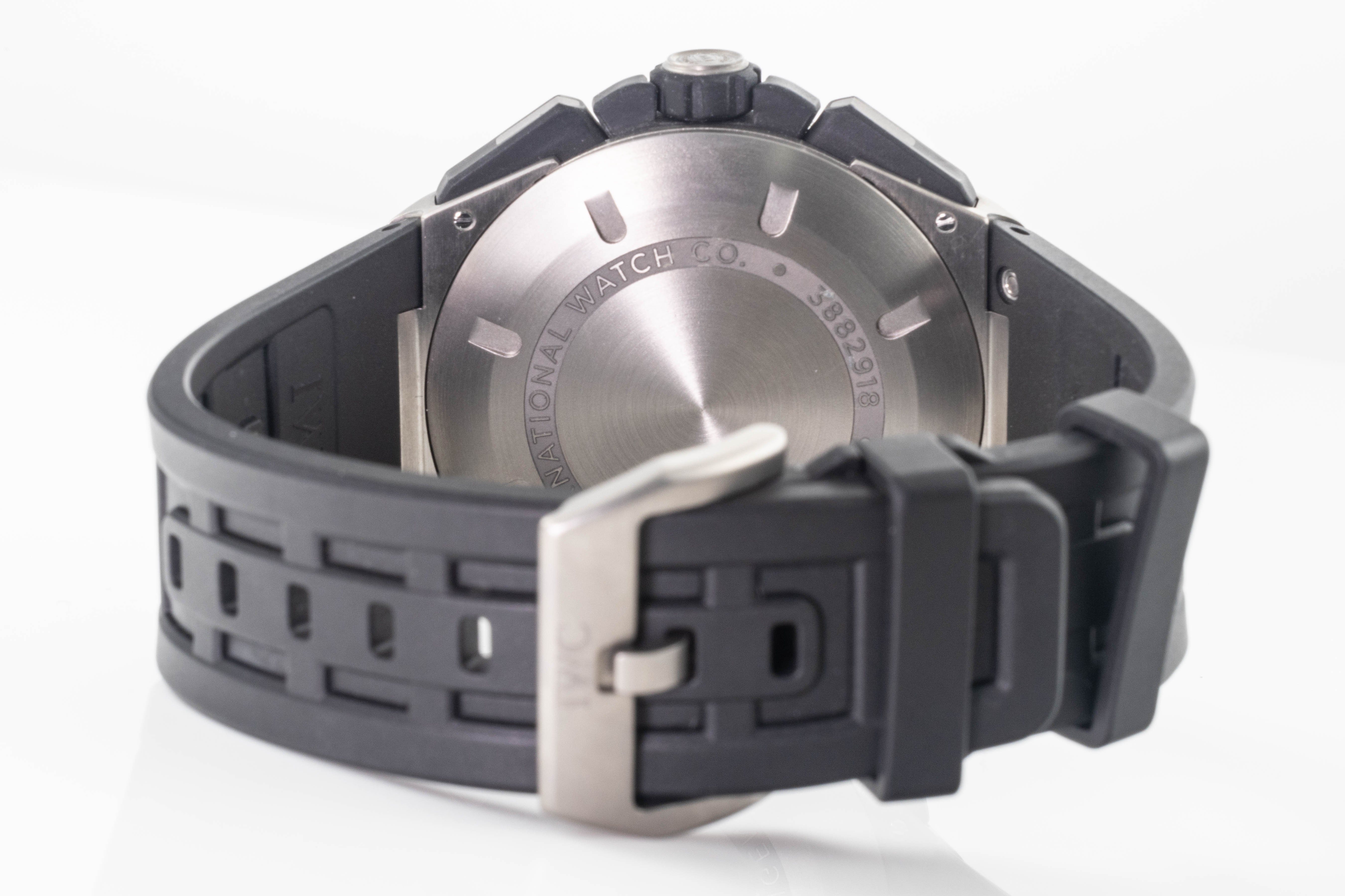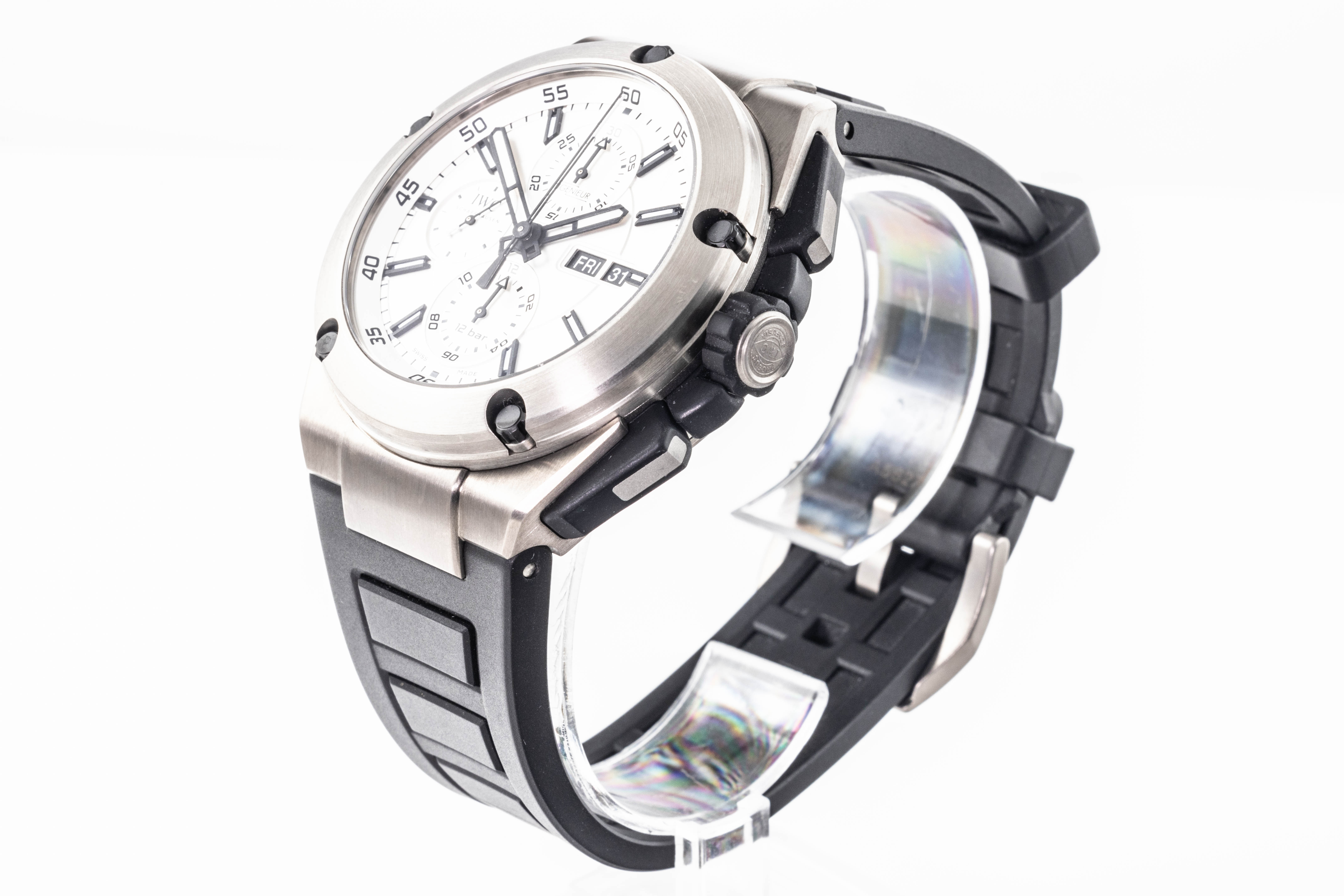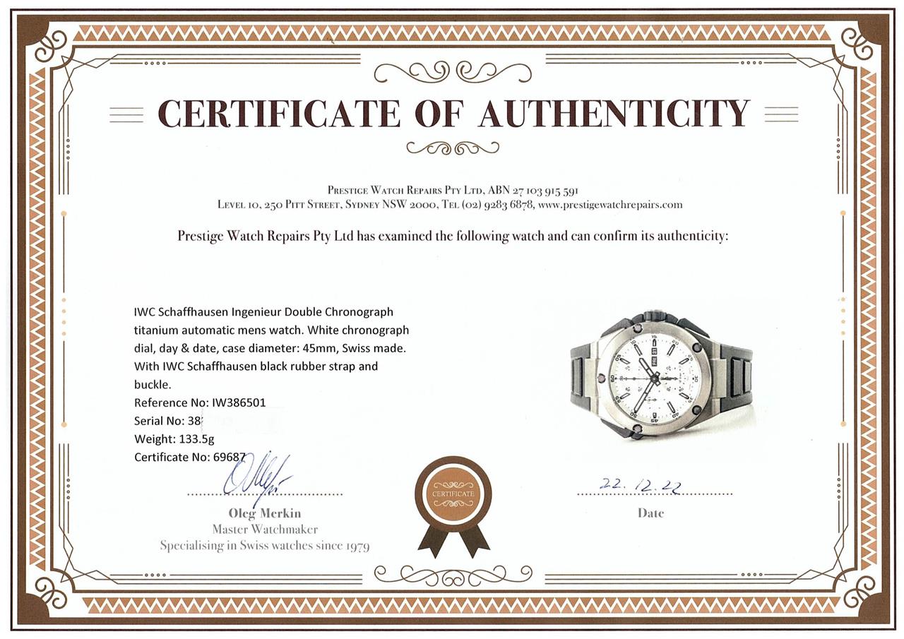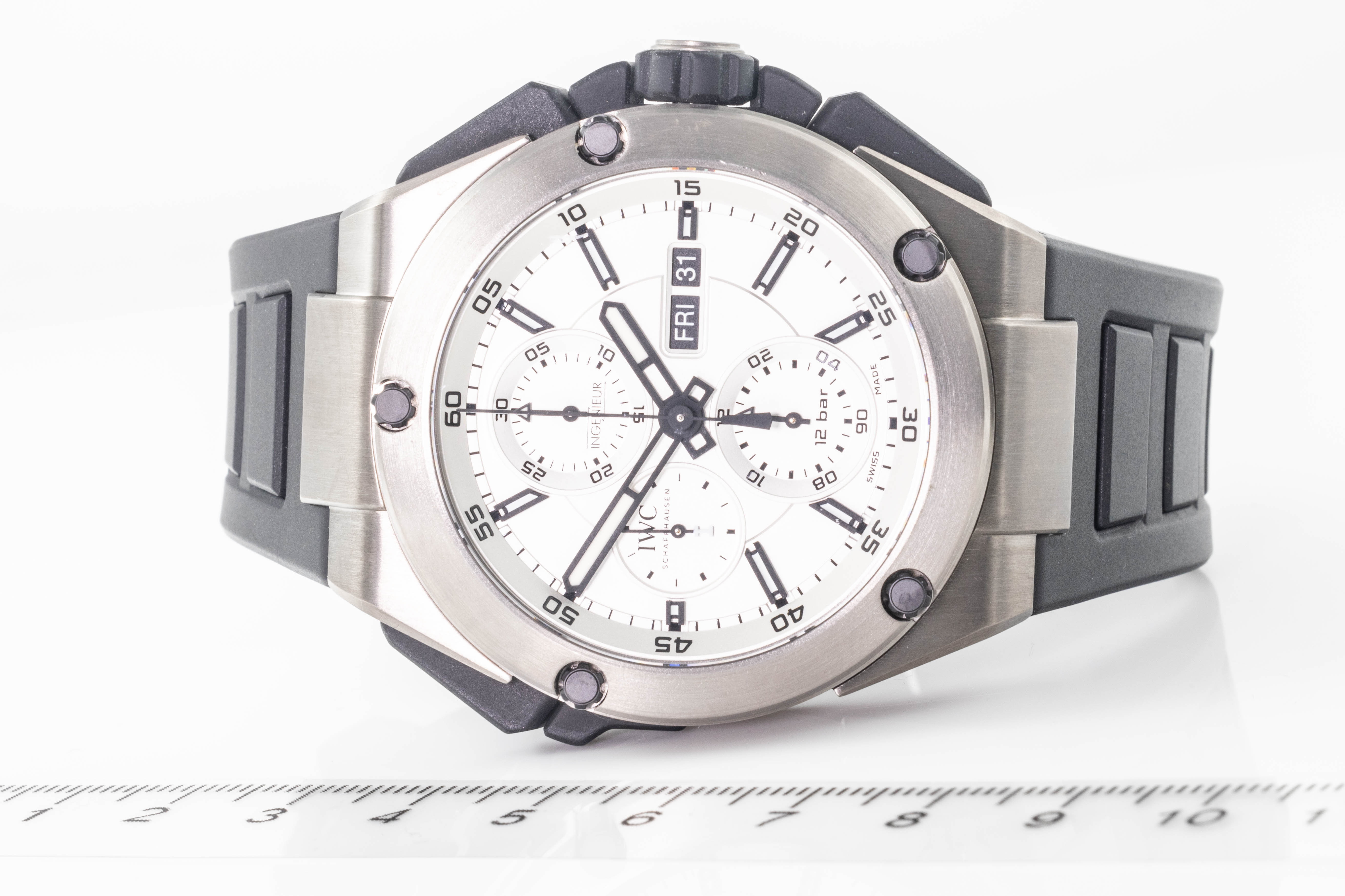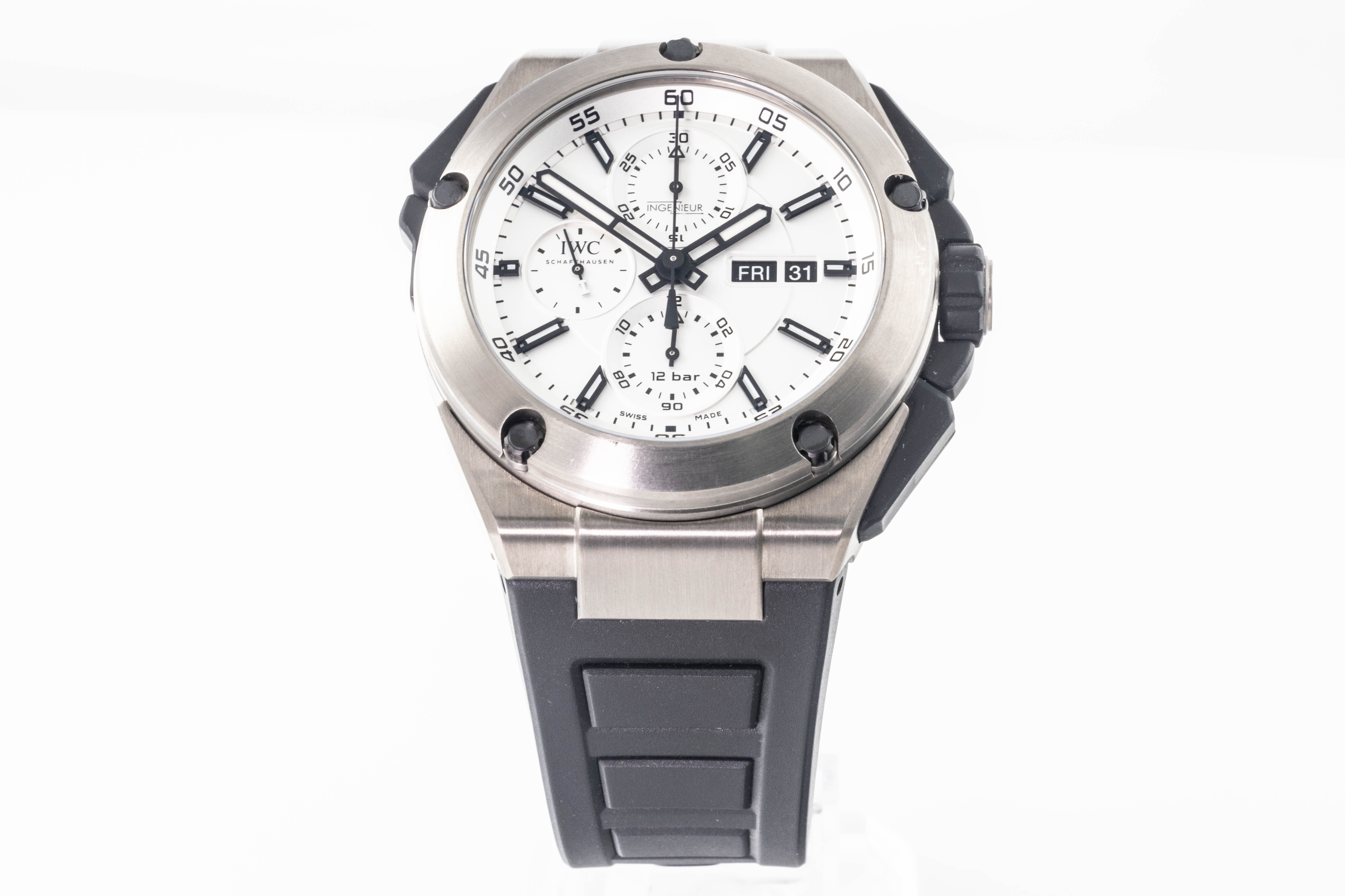 IWC Schaffhausen Ingenieur Double titanium automatic men's watch. White chronograph dial, day & date, case diameter: 45mm, strap length: 20cm, Swiss made. Ref# IW386501. With IWC Schaffhausen black rubber strap and buckle. With Certificate of Authenticity. 3 month FSA warranty. (Pre-owned)
