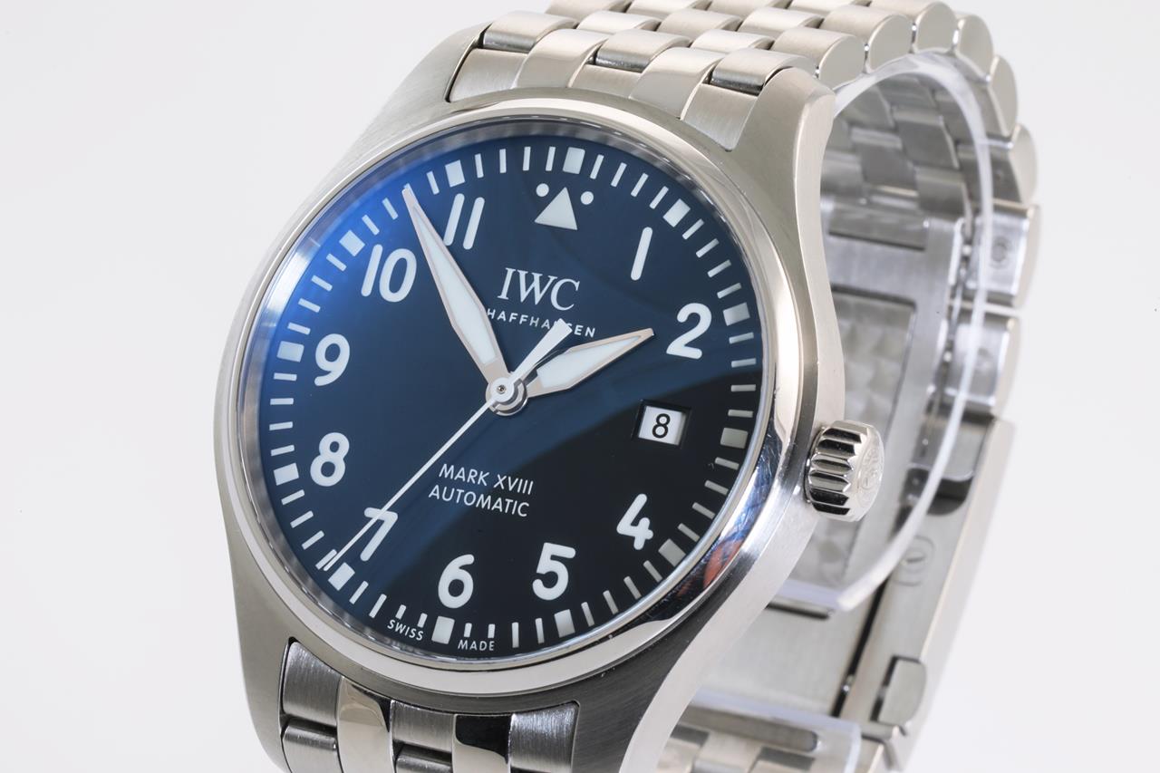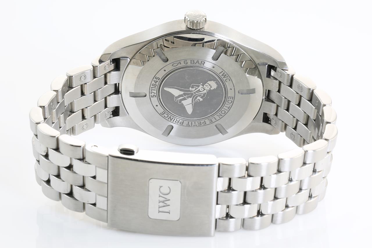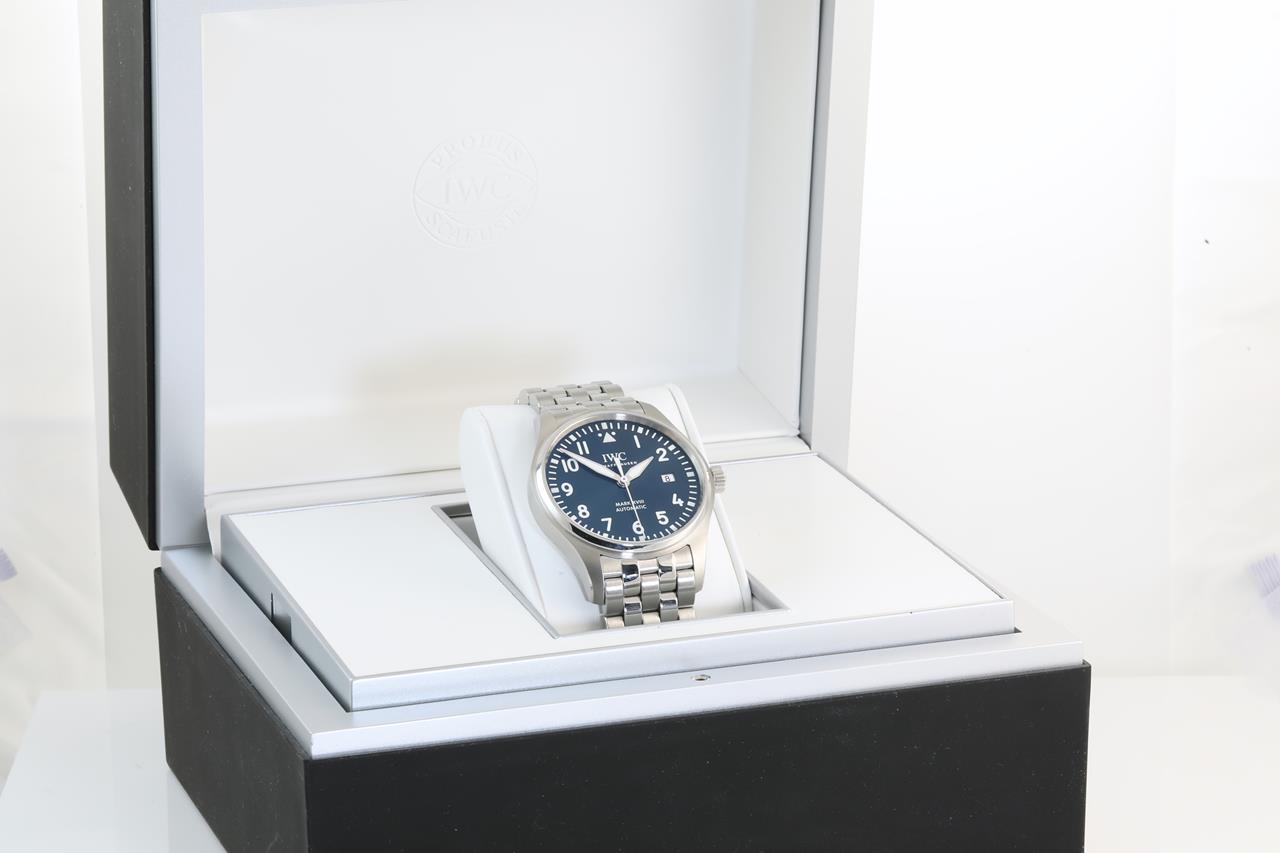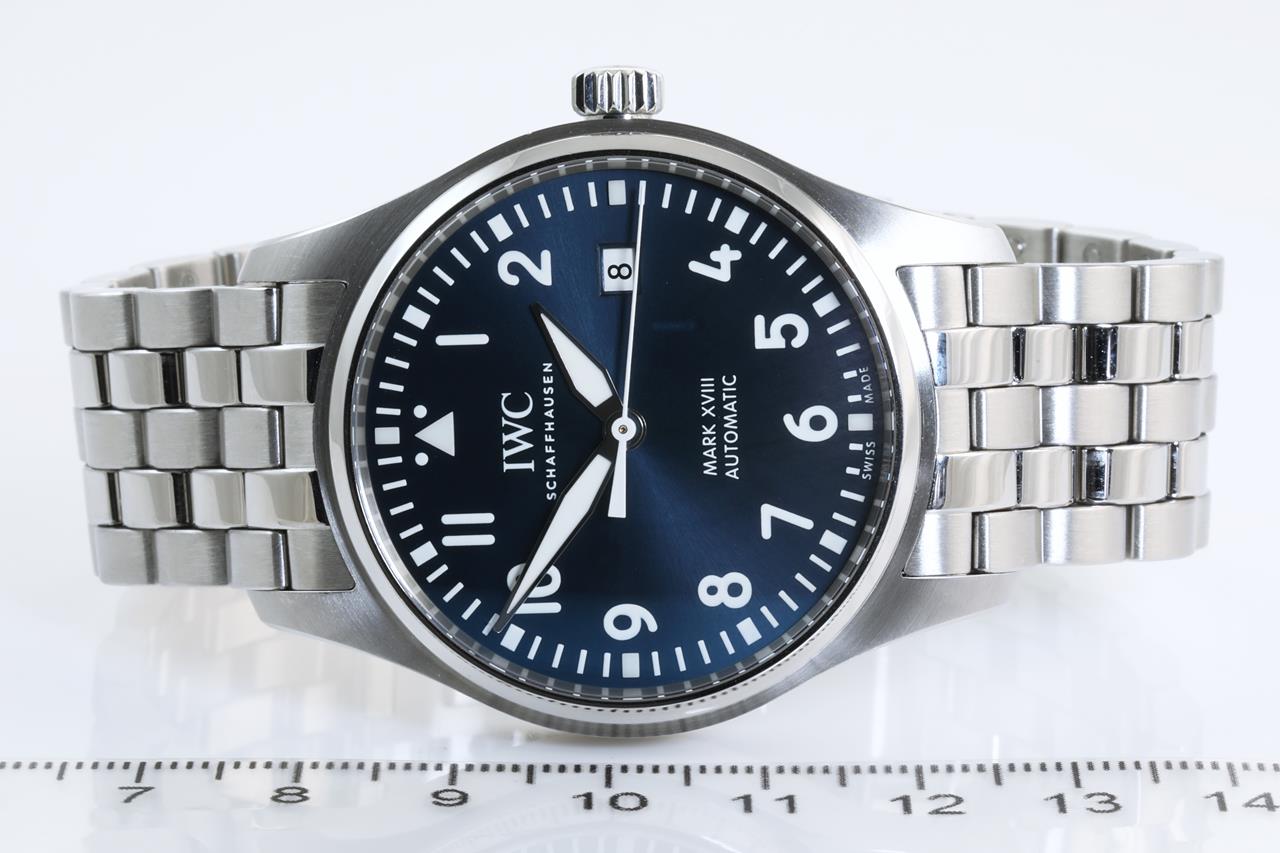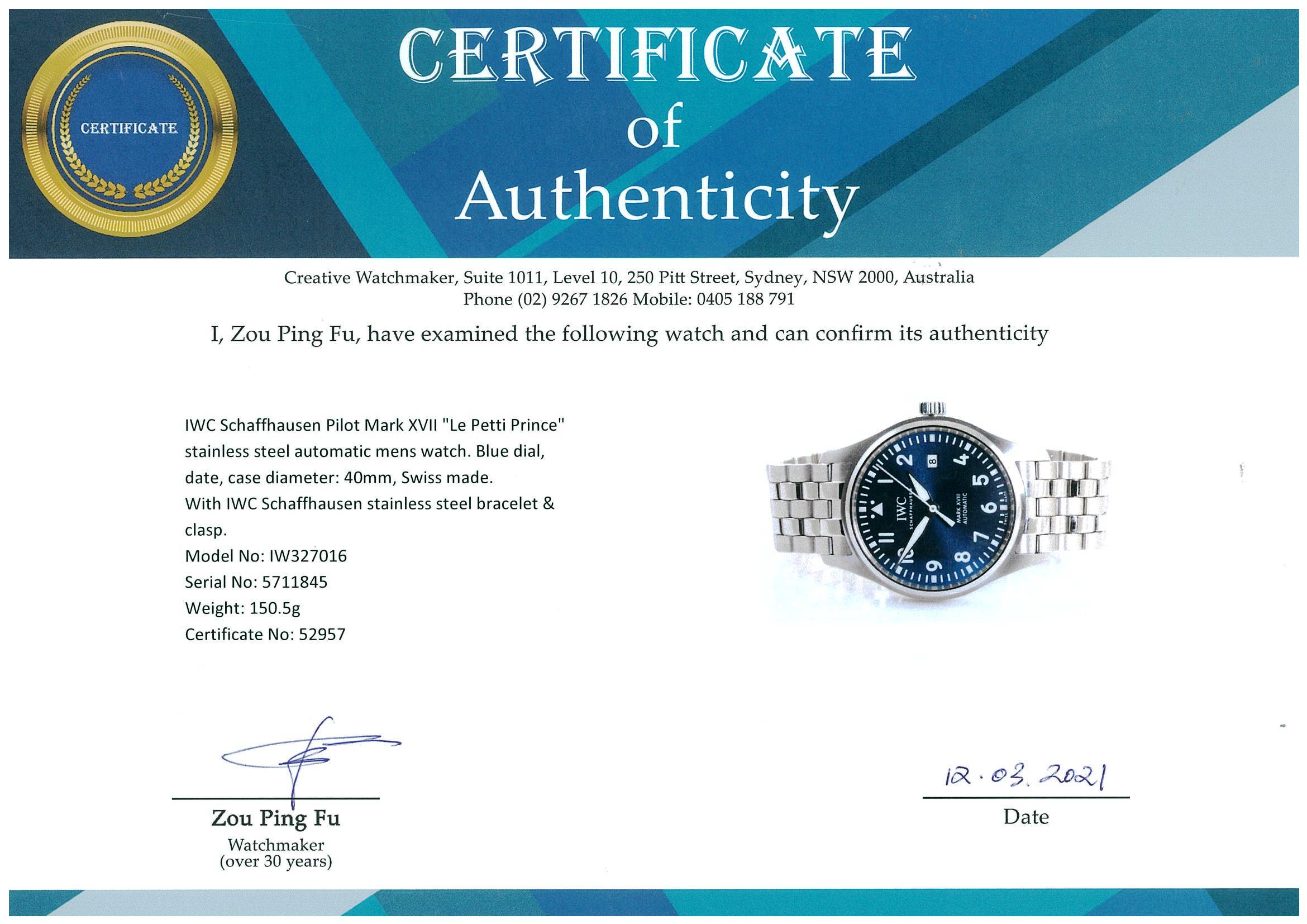 IWC Schaffhausen Pilot Mark XVII Le Petti Prince stainless steel automatic mens watch. Blue dial, date, case diameter: 40mm, wrist size: 18cm, Swiss made. Ref #IW327016. With IWC Schaffhausen stainless steel bracelet and clasp. With Certificate of Authenticity. With IWC Schaffhausen international limited warranty card dated 4.12.2018 inside IWC Schaffhausen box. 3 month FSA warranty. (Pre-owned)