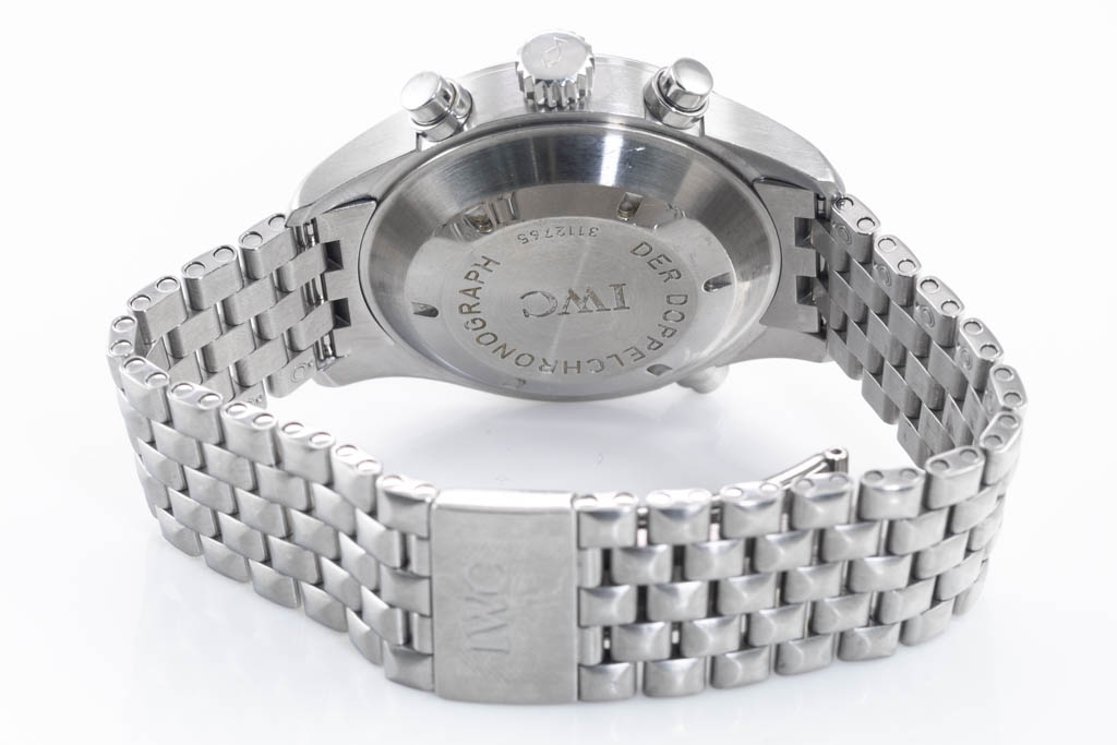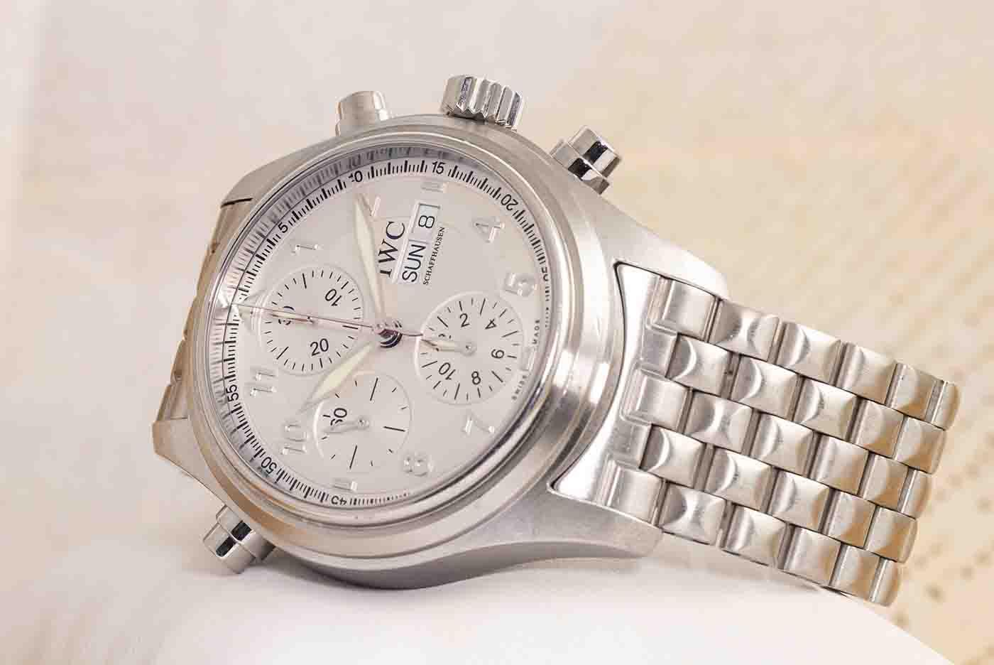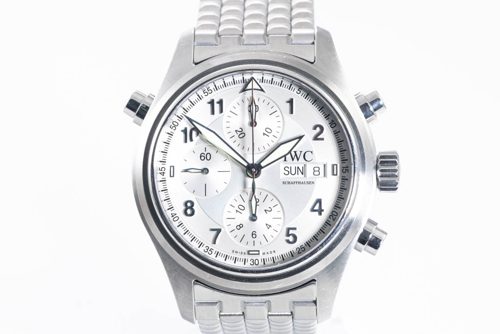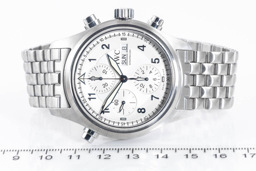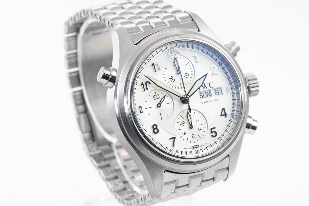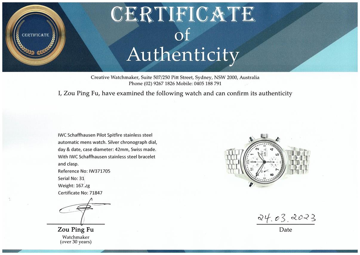 IWC Schaffhausen Pilot Spitfire stainless steel automatic mens watch. Silver chronograph dial, day & date, case diameter: 42mm, wrist size: 18cm, Swiss made. Ref# IW371705. With IWC Schaffhausen stainless steel bracelet and clasp. With Certificate of authenticity. 3 month FSA warranty. (Pre-owned)