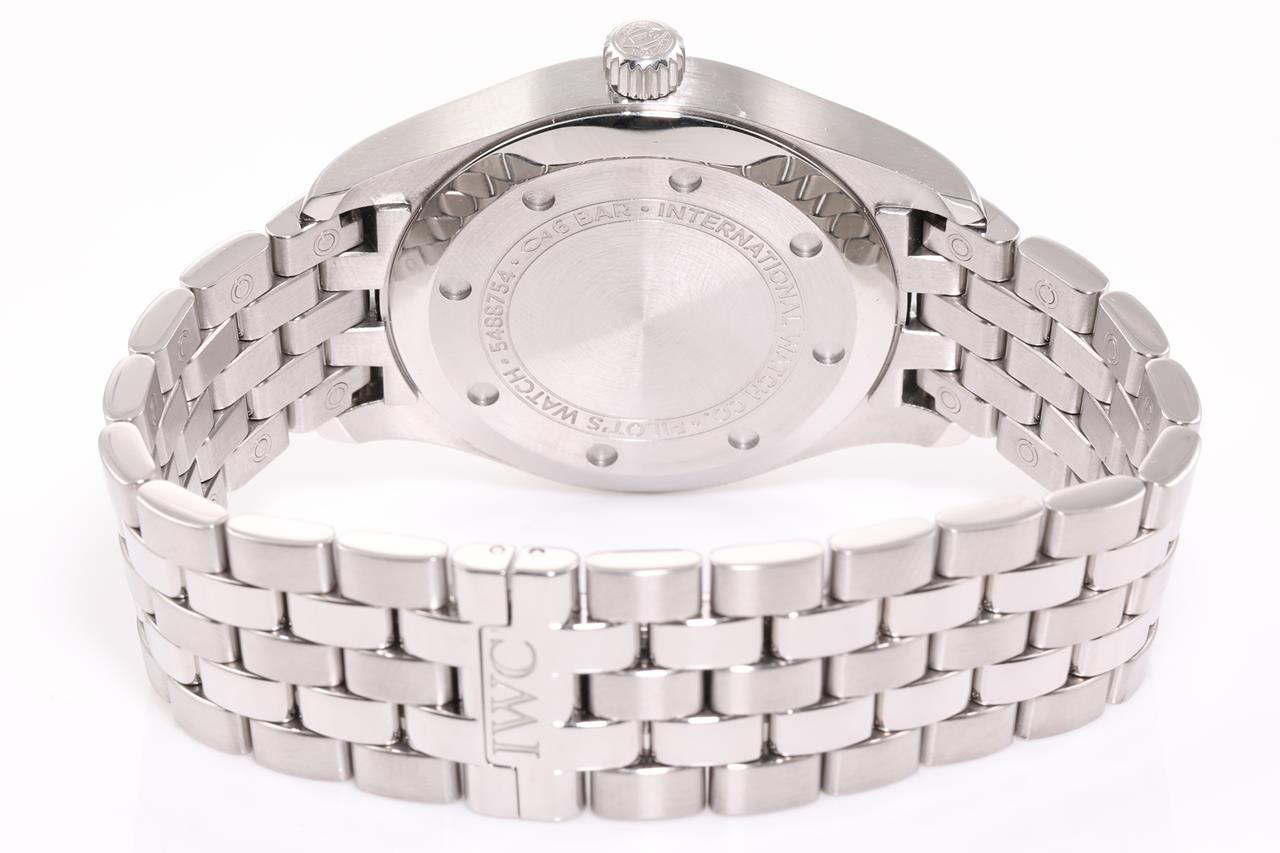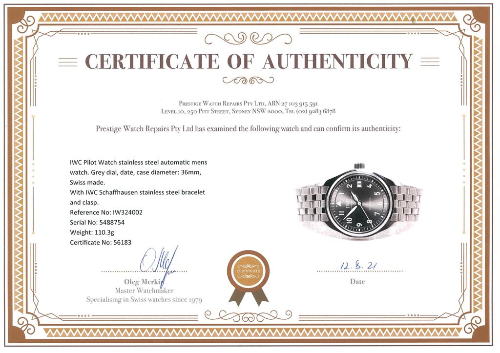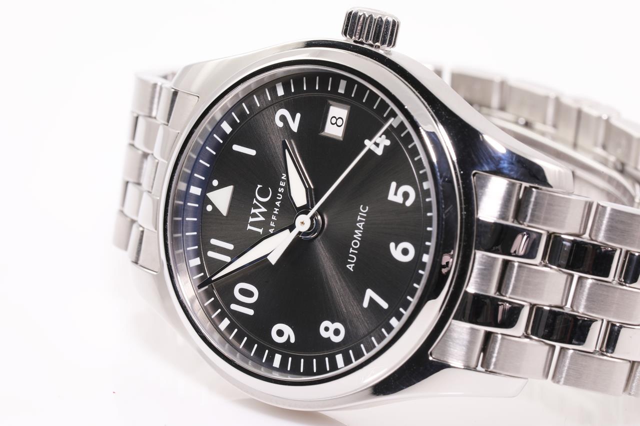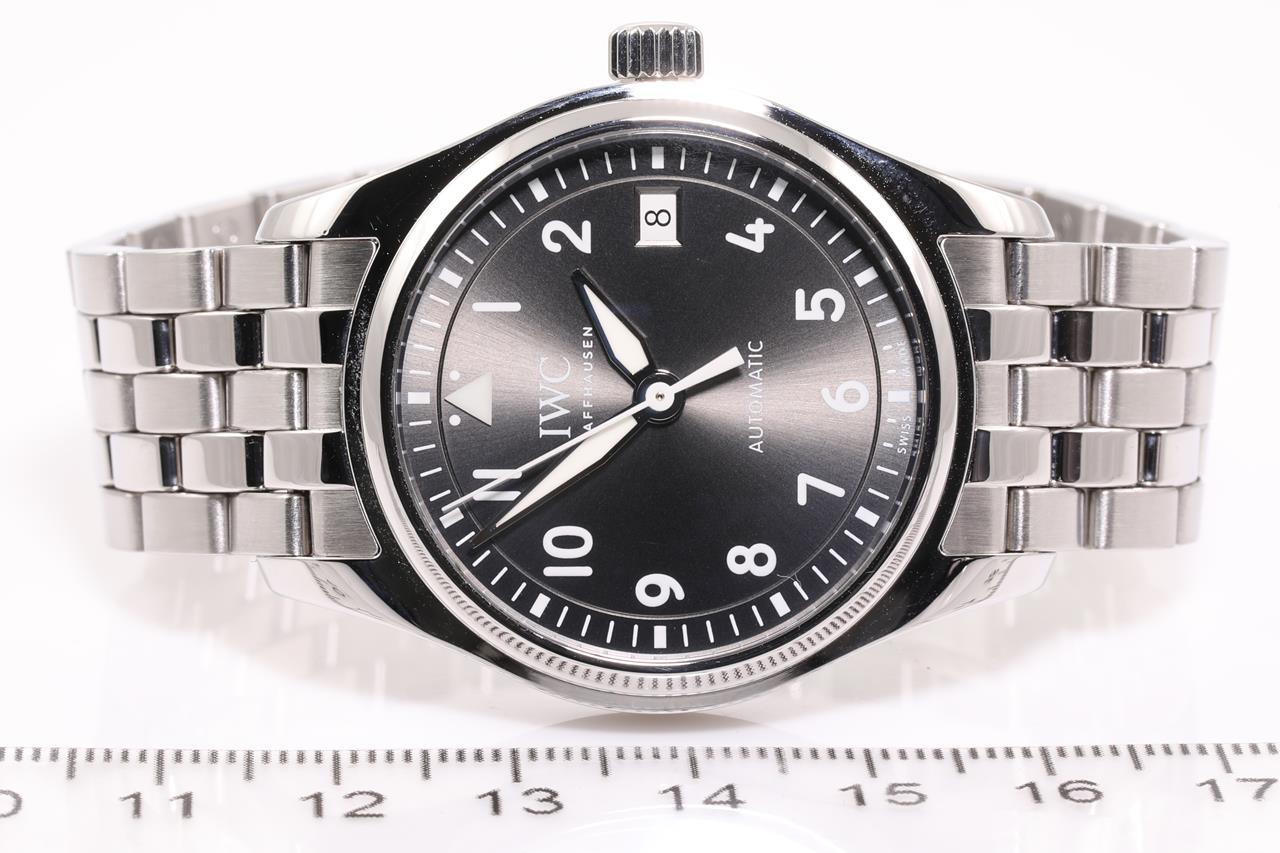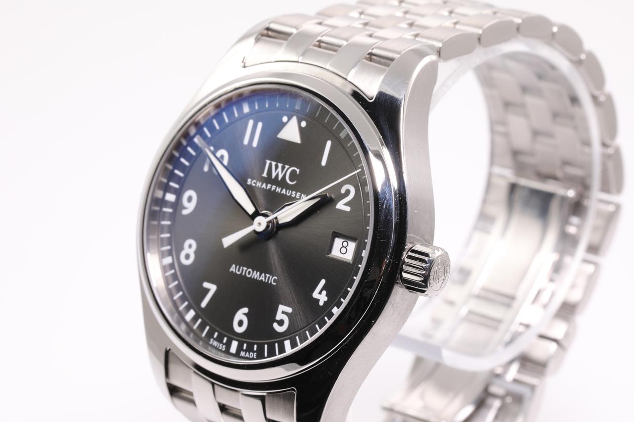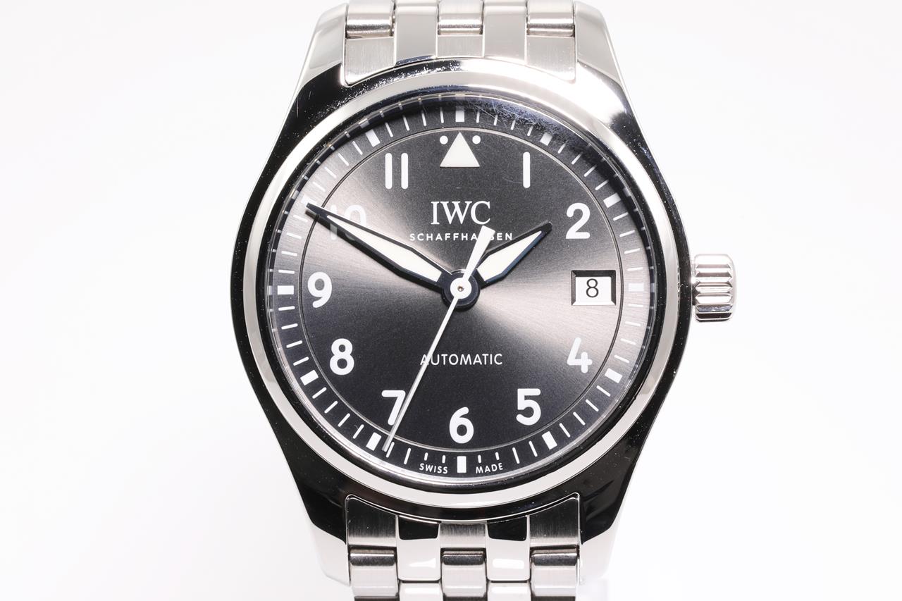 IWC Pilot Watch stainless steel automatic mens watch. Grey dial, date, case diameter: 36mm, wrist size: 16cm, Swiss made. Ref# IW324002. With IWC Schaffhausen stainless steel bracelet and clasp. With certificate of authenticity, IWC international warranty card dated 19/04/2016 and IWC Schaffhausen box. 3 month FSA warranty. (Pre-owned)