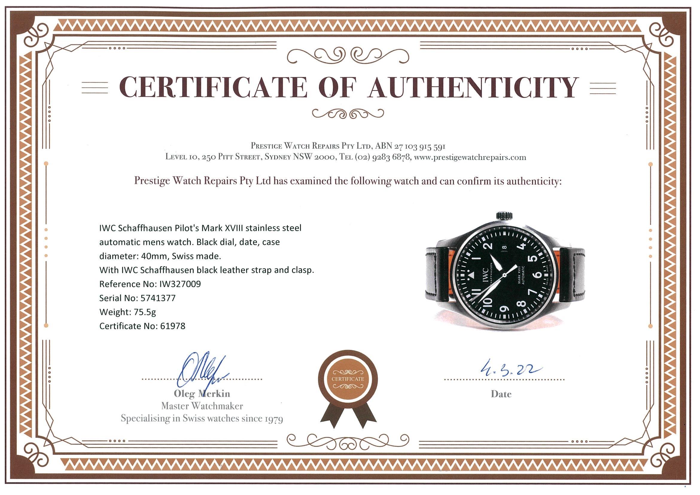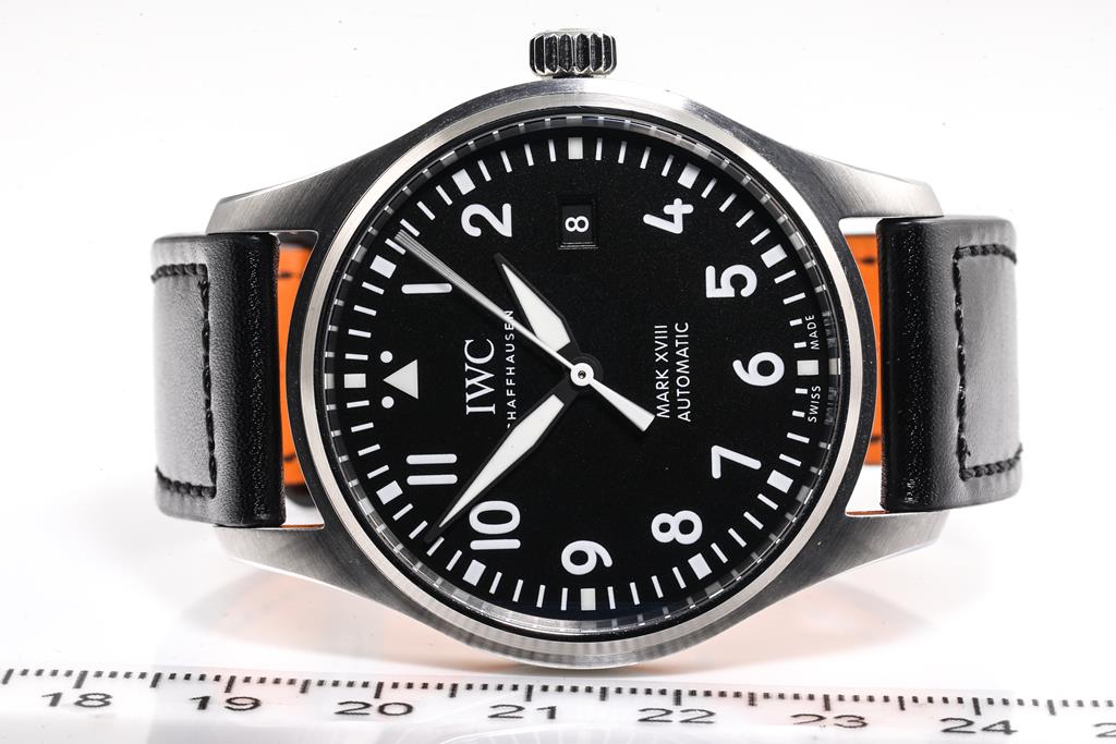 IWC Schaffhausen Pilot's Mark XVIII stainless steel automatic mens watch. Black dial, date, case diameter: 40mm, length: 21cm, Swiss made. Ref# IW327009. With IWC Schaffhausen black leather strap and clasp. With Certificate of Authenticity, IWC International Limited Warranty Card dated 14/6/2019 and IWC Schaffhausen box. and 3 month FSA warranty. (Pre-owned)