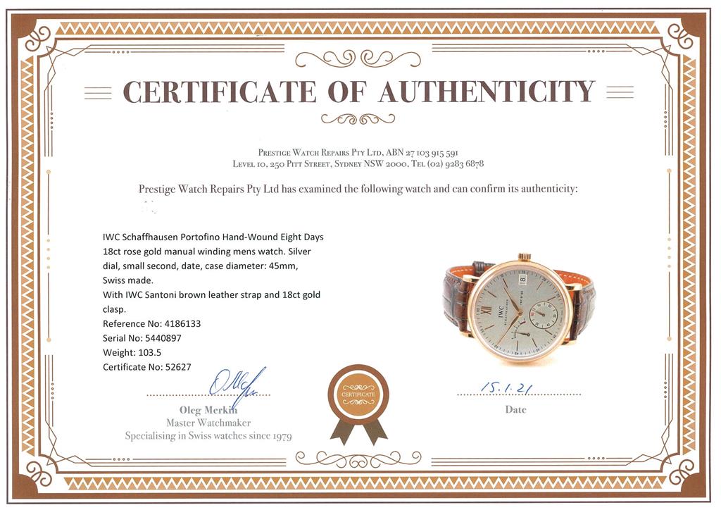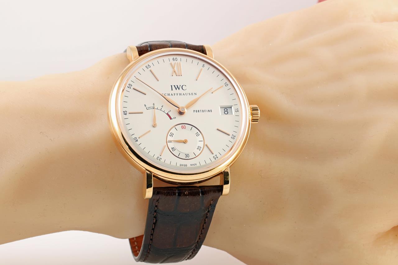 IWC Schaffhausen Portofino Hand-Wound Eight Days 18ct rose gold manual winding mens watch. Silver dial, small second, date, case diameter: 45mm, length: 21cm, Swiss made. Ref #4186133. With IWC Santoni brown leather strap and 18ct gold clasp. With certificate of authenticity, copy of Kennedy valuation and IWC Schaffhause box. 3 month FSA warranty. (Pre-owned)