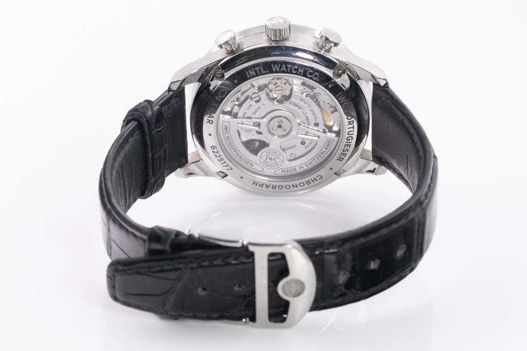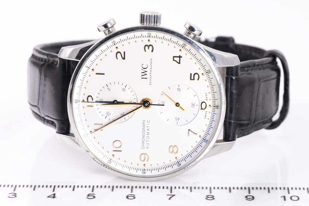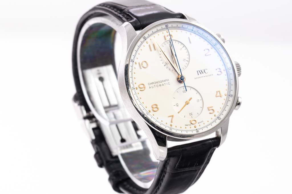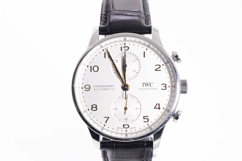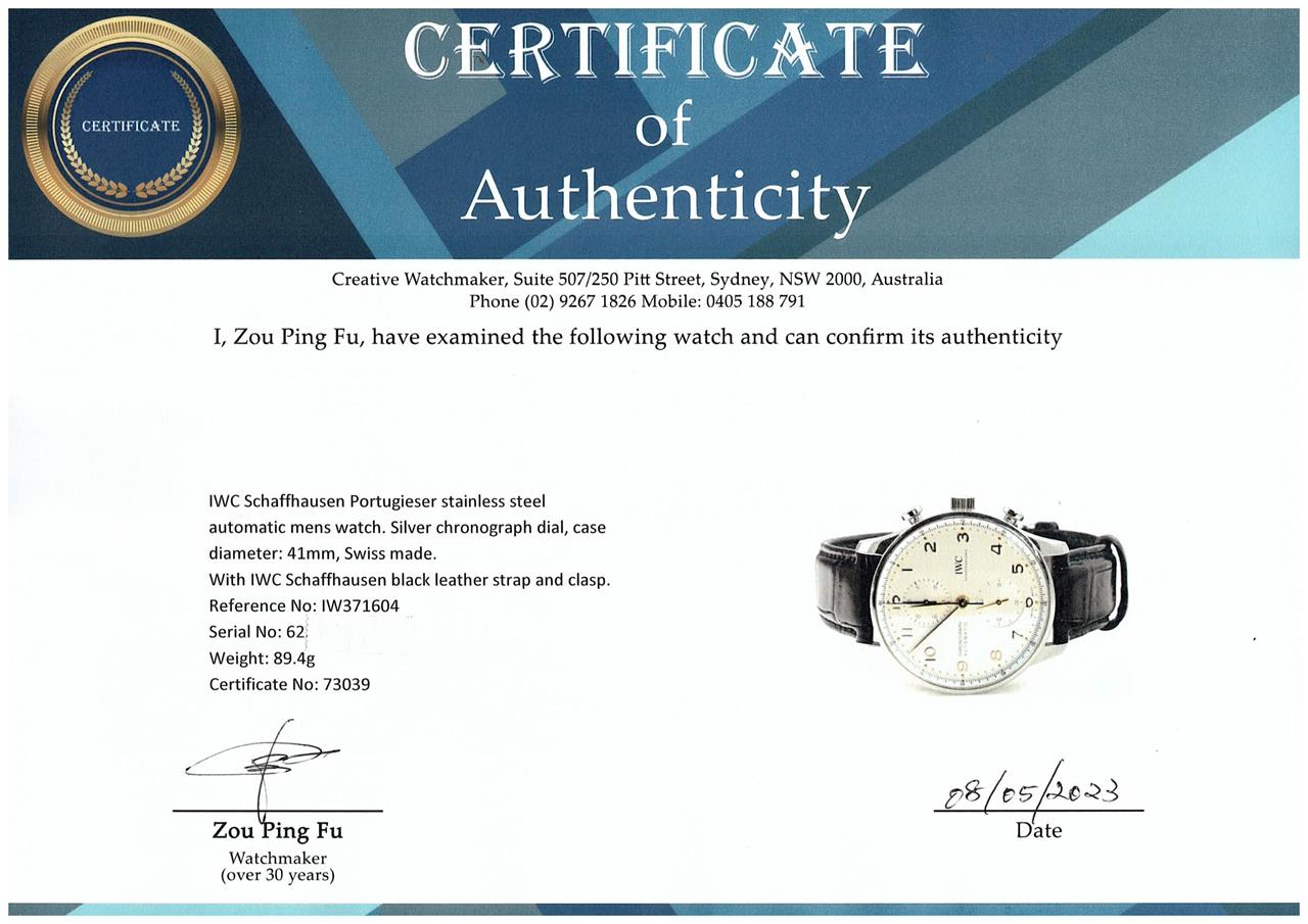 IWC Schaffhausen Portugieser stainless steel automatic mens watch. Silver chronograph dial, case diameter: 41mm, adjustable max wrist size: 20cm, Swiss made. Ref# IW371604. With IWC Schaffhausen black leather strap and clasp. With IWC Schaffhausen international Warranty Card dated 02/03/2021, Certificate of Authenticity and IWC Schaffhausen box. 3 month FSA warranty. (Pre-owned)