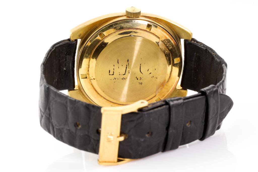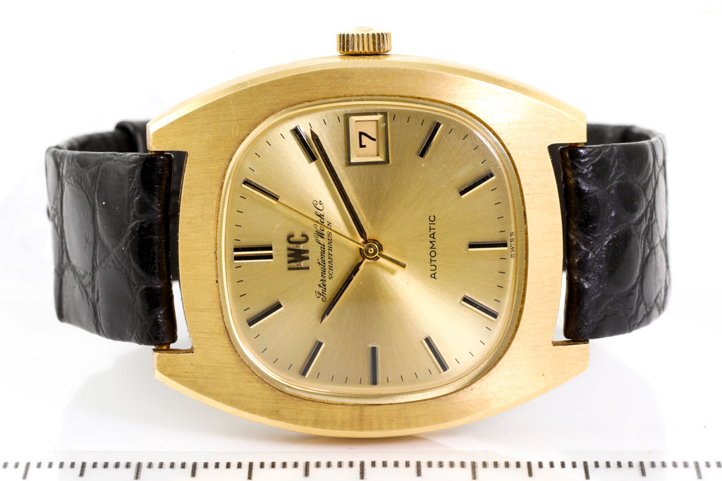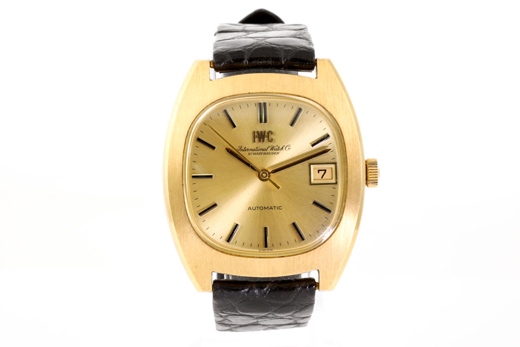 IWC Schaffhausen 18ct yellow gold automatic watch. Gold dial, date, case diameter: 35mm x 42mm, strap length: 19cm, Swiss made. Ref# 1872. With IWC black leather strap and buckle. With Certificate of Authenticity. 3 month FSA warranty (Pre-owned)