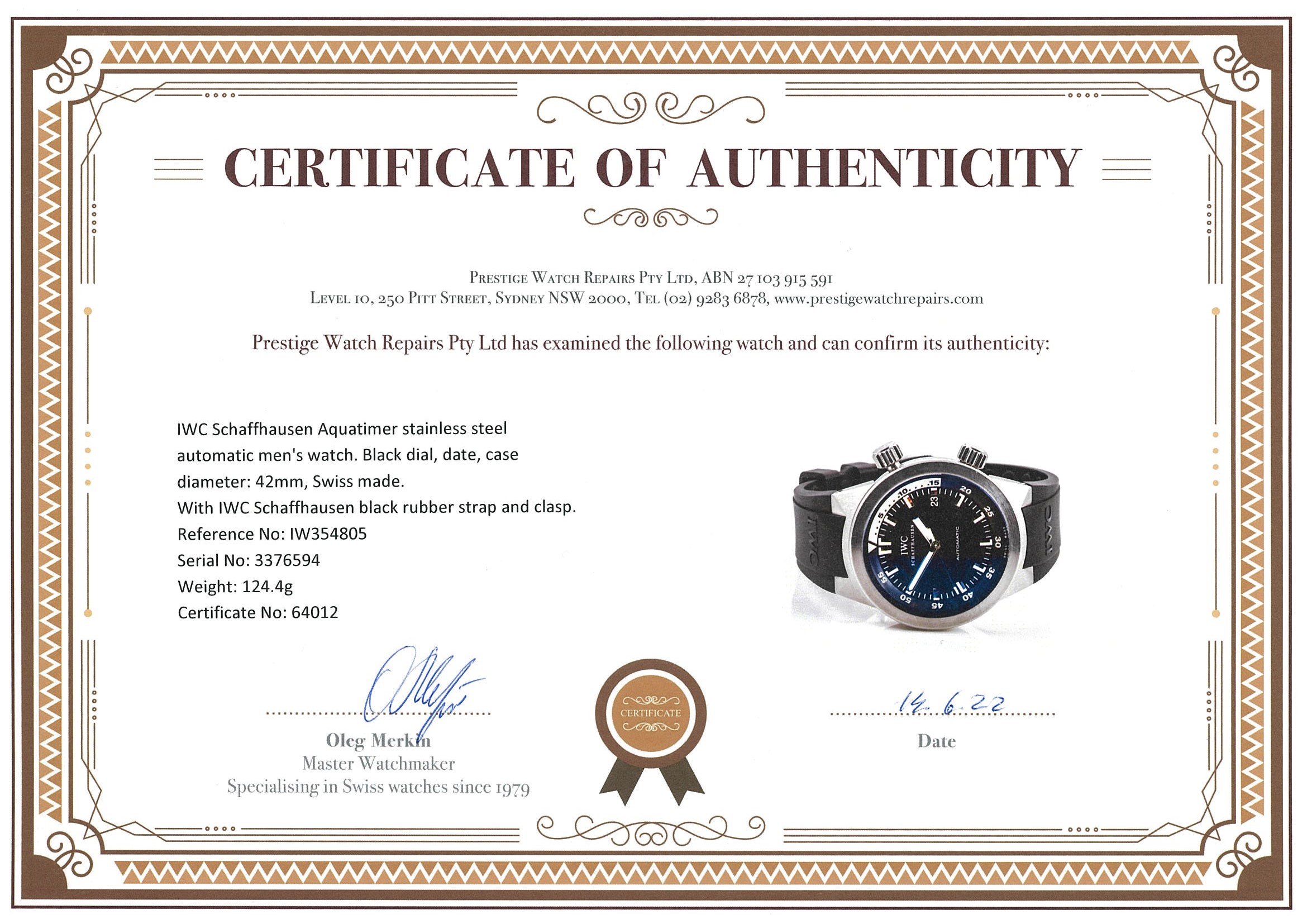 IWC Schaffhausen Aquatimer stainless steel automatic men's watch. Black dial, date, case diameter: 42mm, length: 19.5cm, Swiss made. Ref# IW354805. With IWC Schaffhausen black rubber strap and clasp. With Certificate of authenticity. 3 month FSA warranty. (Pre-owned)
