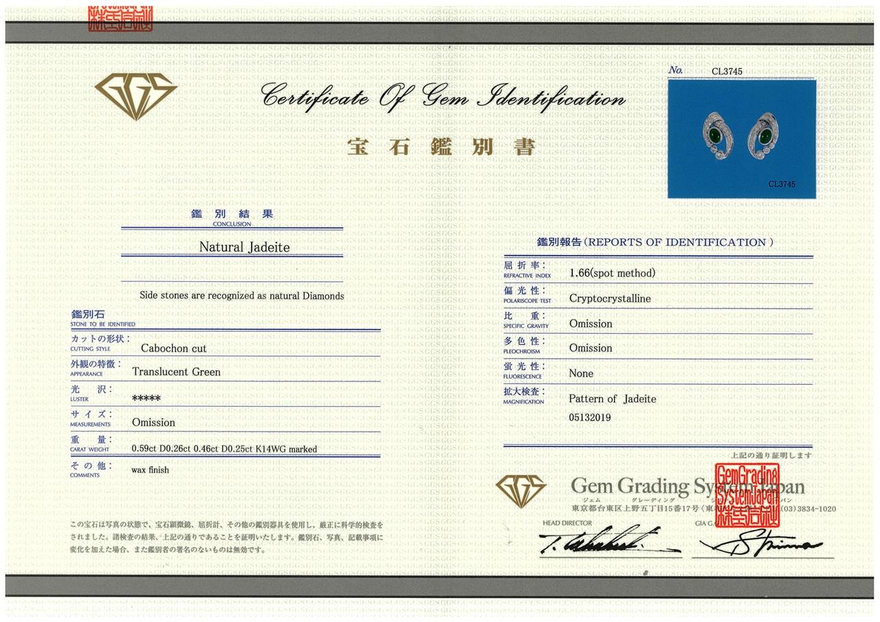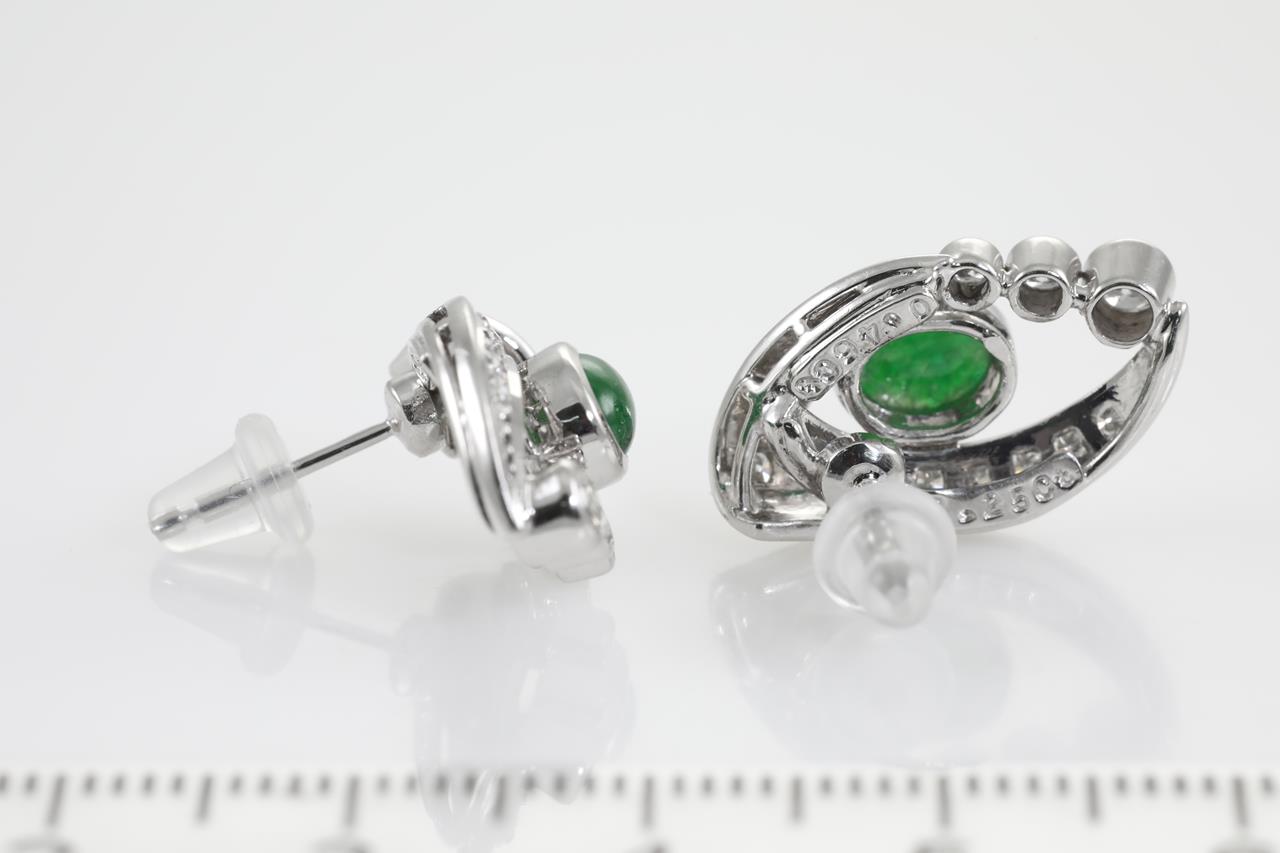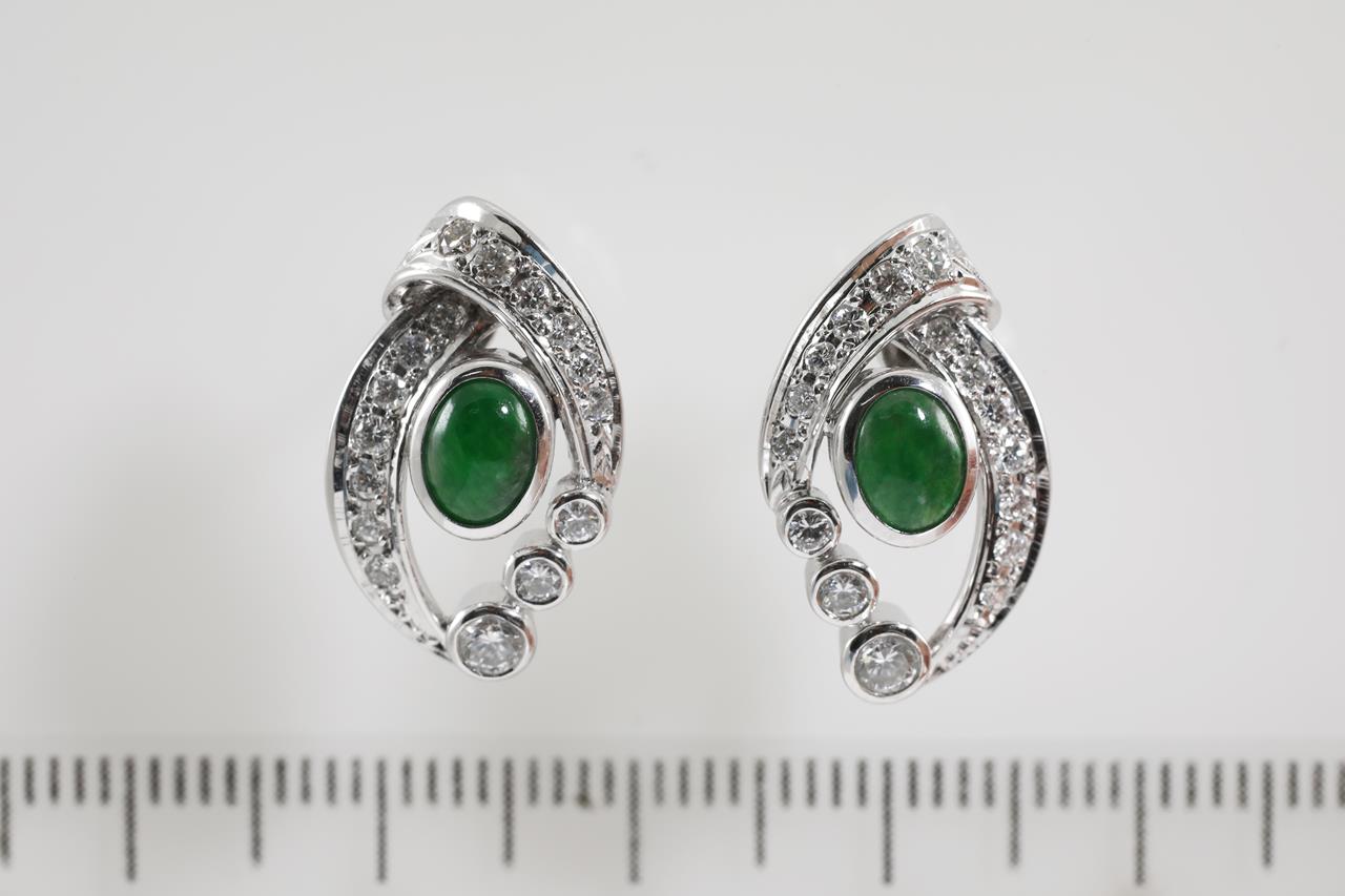 Jade and Diamond earrings with oval cabochon cut Jadeite Jade totalling 1.05cts (with Gem identification report #CL3745) and Diamonds totalling 0.51cts (Estimated grading: G SI). 14ct white gold with silicon backs. (Pre-owned)
