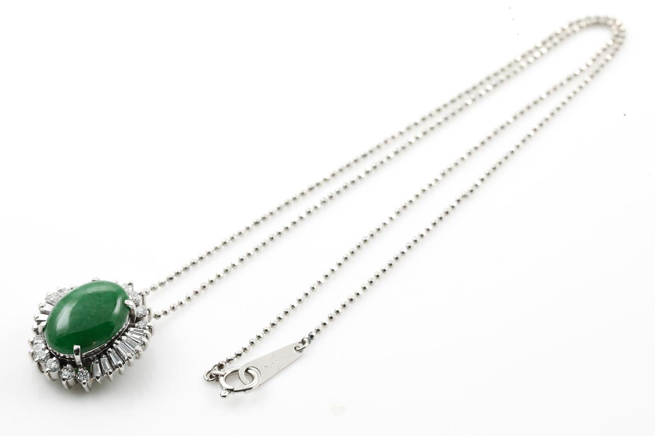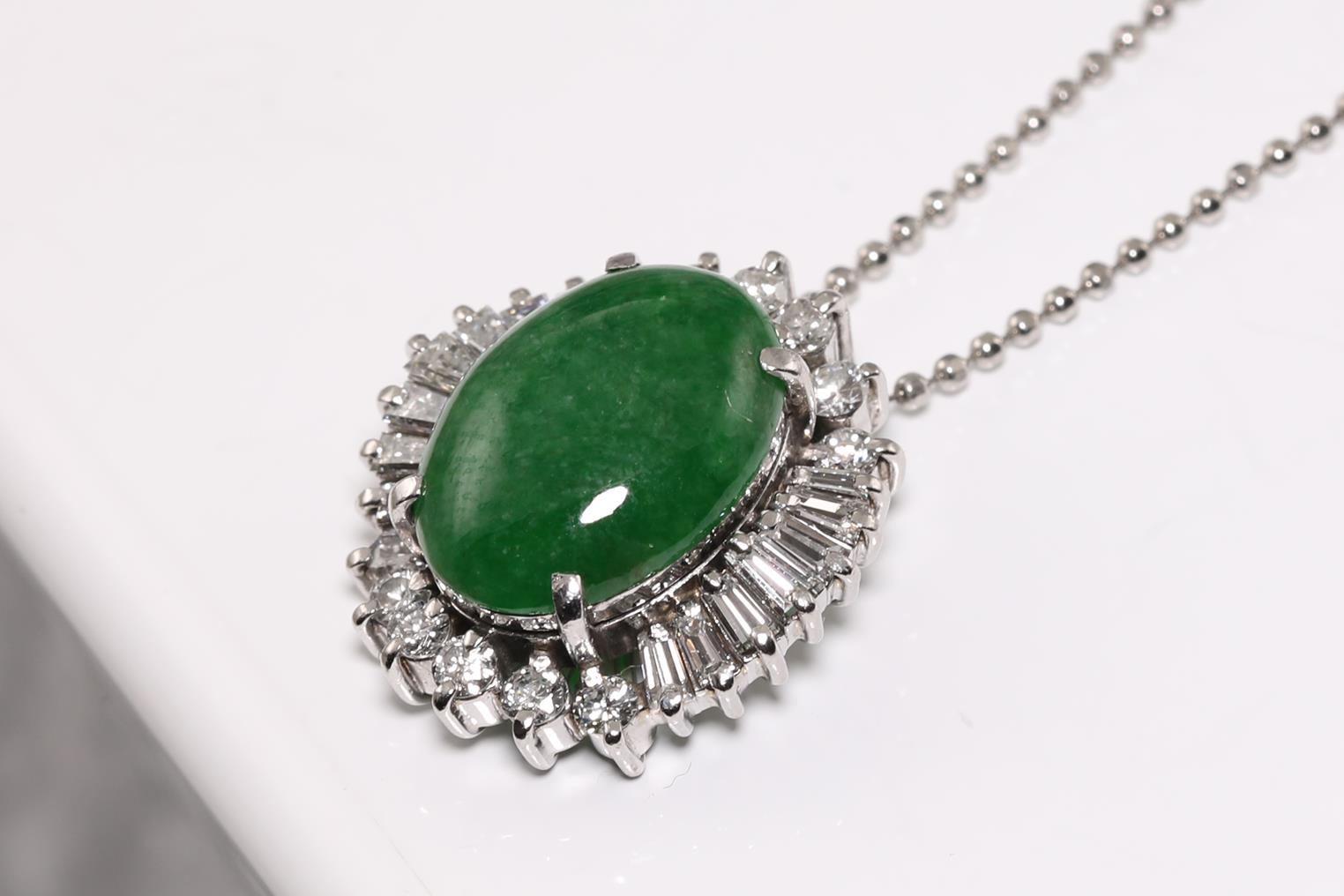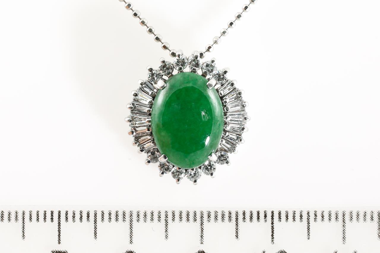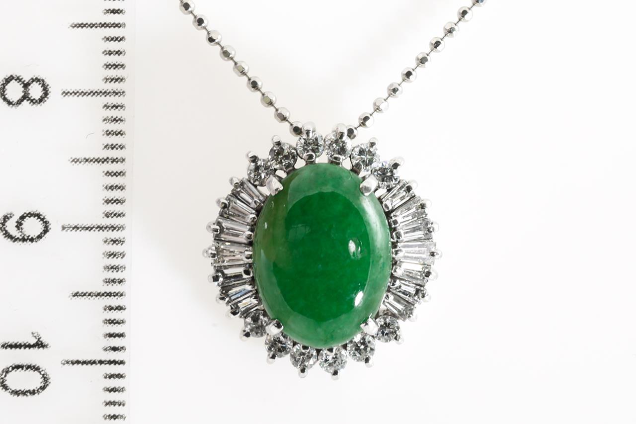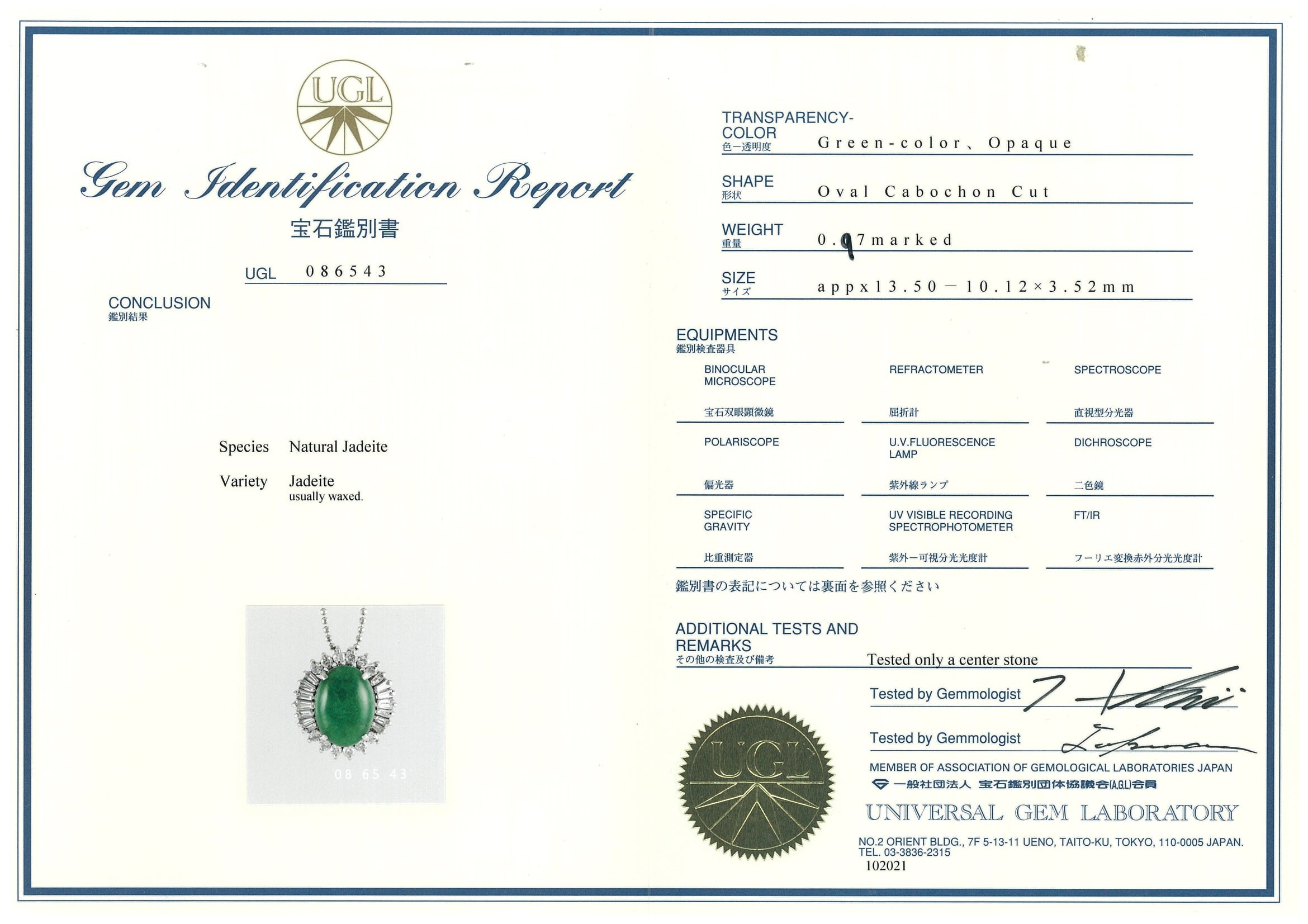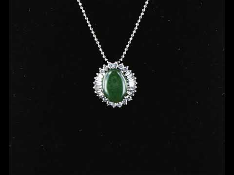 Jade and Diamond pendant with an oval cabochon cut Natural green Type A Jadeite Jade of 13.5mm x 10.12mm x 3.52mm and Diamonds totalling 0.97cts (Estimated grading: G-H VS-SI). Platinum with 40cm chain. With Gem Identification report #086543. Weight: 9.9g. (Pre-owned)