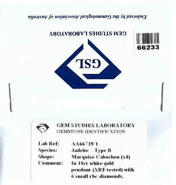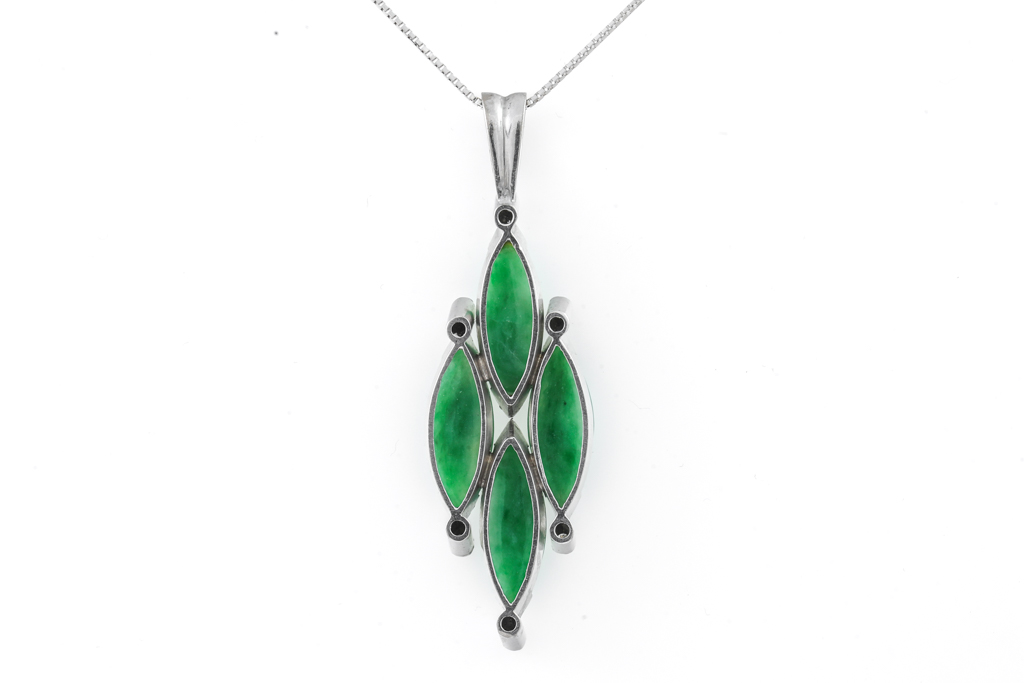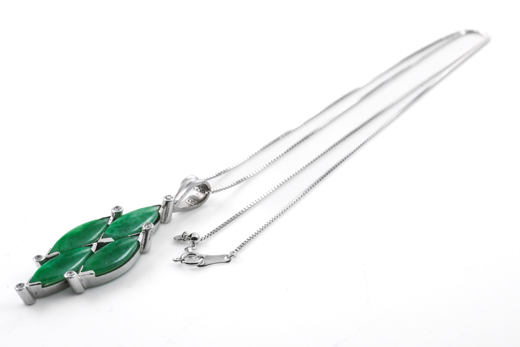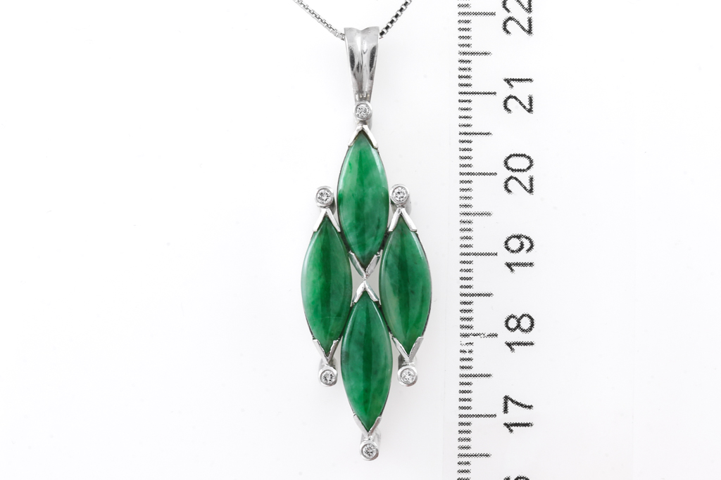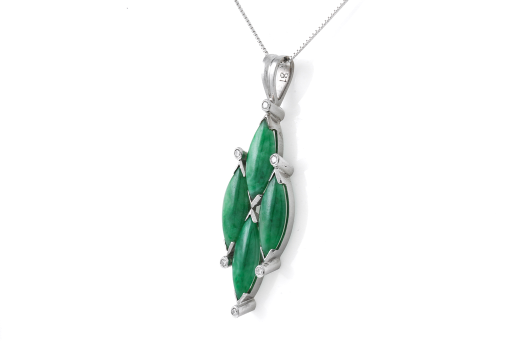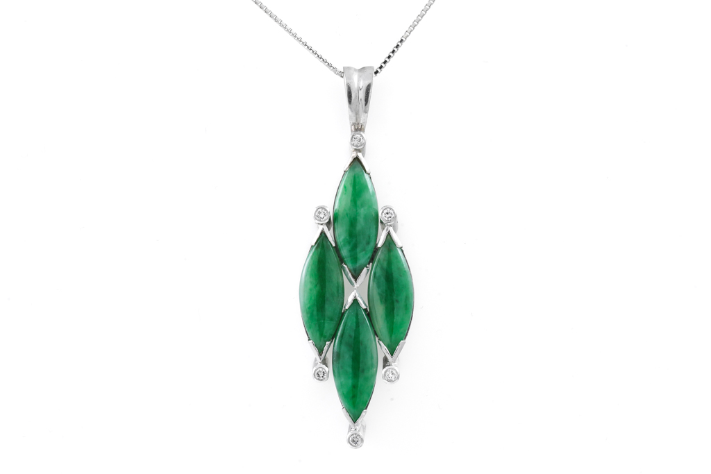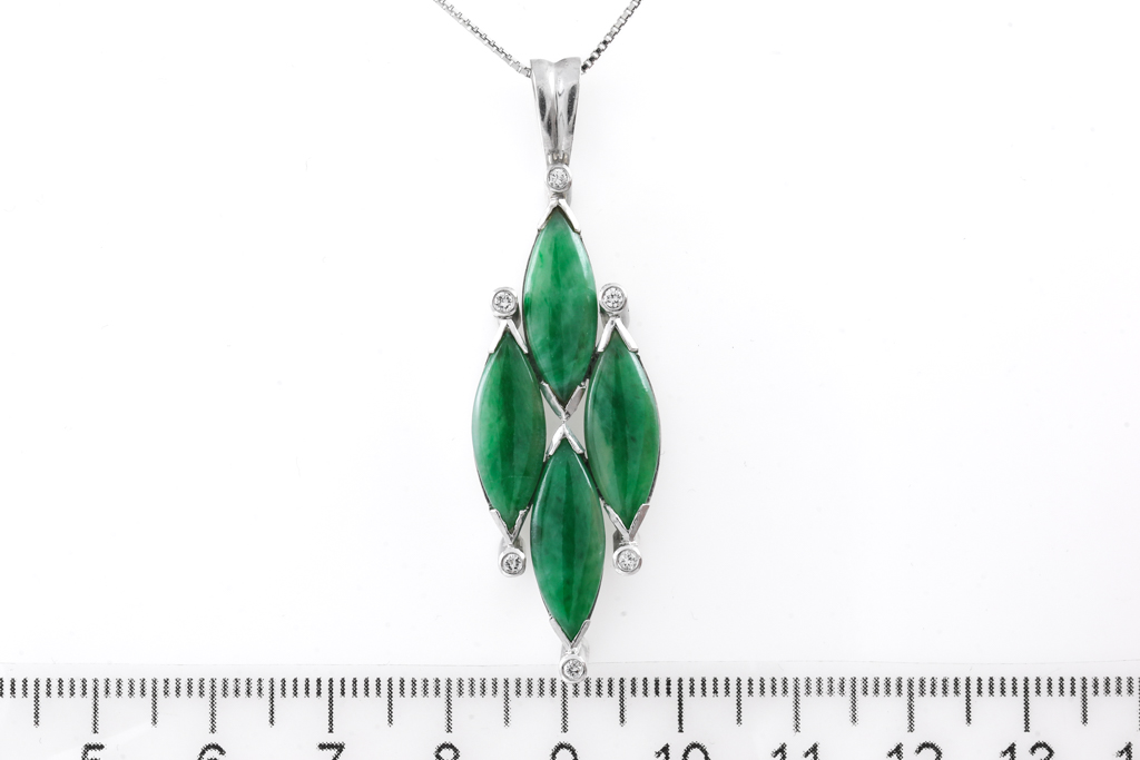 Jade and Diamond pendant with 4 marquise shape cabochon cut green Jadeite Jade - Type B (size: 16.5mmx6.5mmx2.4mm each) and round Diamonds totalling 0.12cts. 18ct white gold with 18ct adjustable 44cm chain. Weigth: 10.6g. With GSL Gemstone Memo #AA66739/1 (Pre-owned)