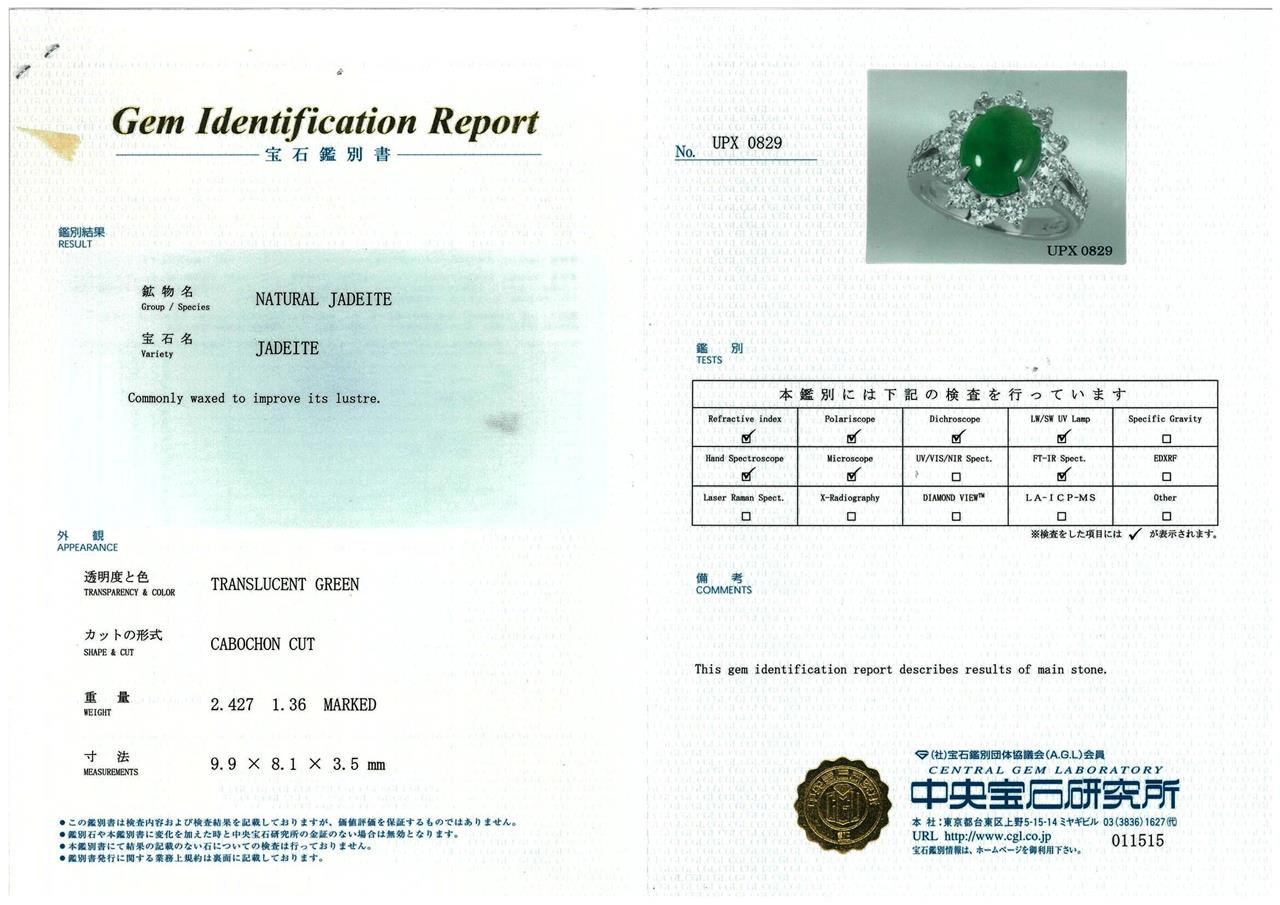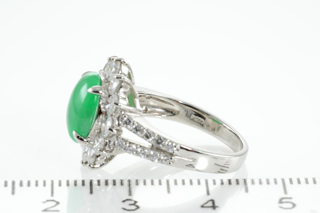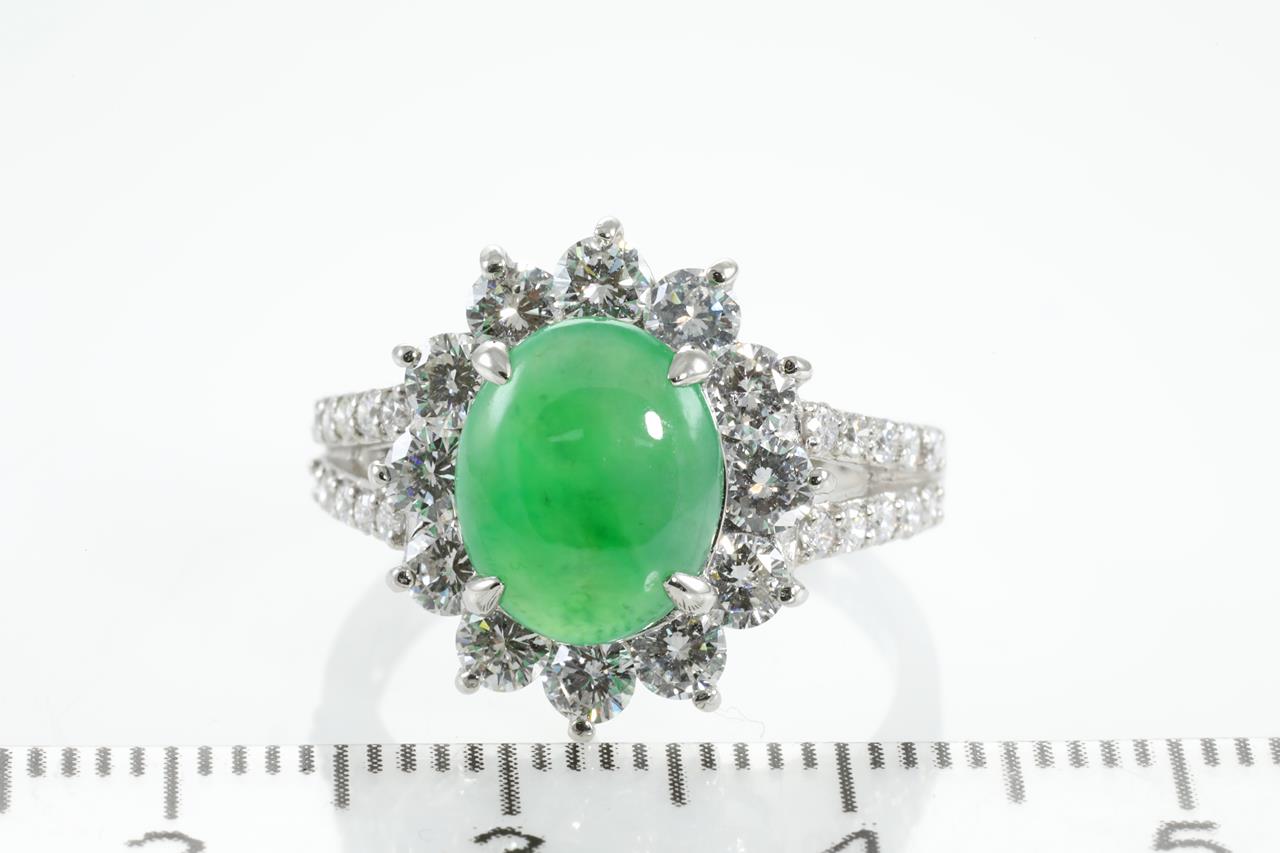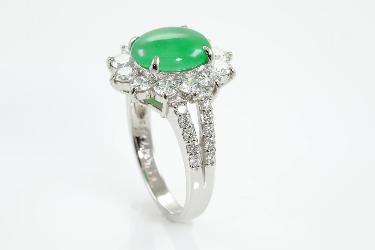 Jade and Diamond ring with oval cabochon cut translucent green natural Jadeite Jade of 2.42ct (With Gem Identification Report #UPX 0829) and Diamonds totalling 1.36cts (Estimated grading: G-H SI). Platinum, ring size L. Weight: 6.9g (Pre-owned)