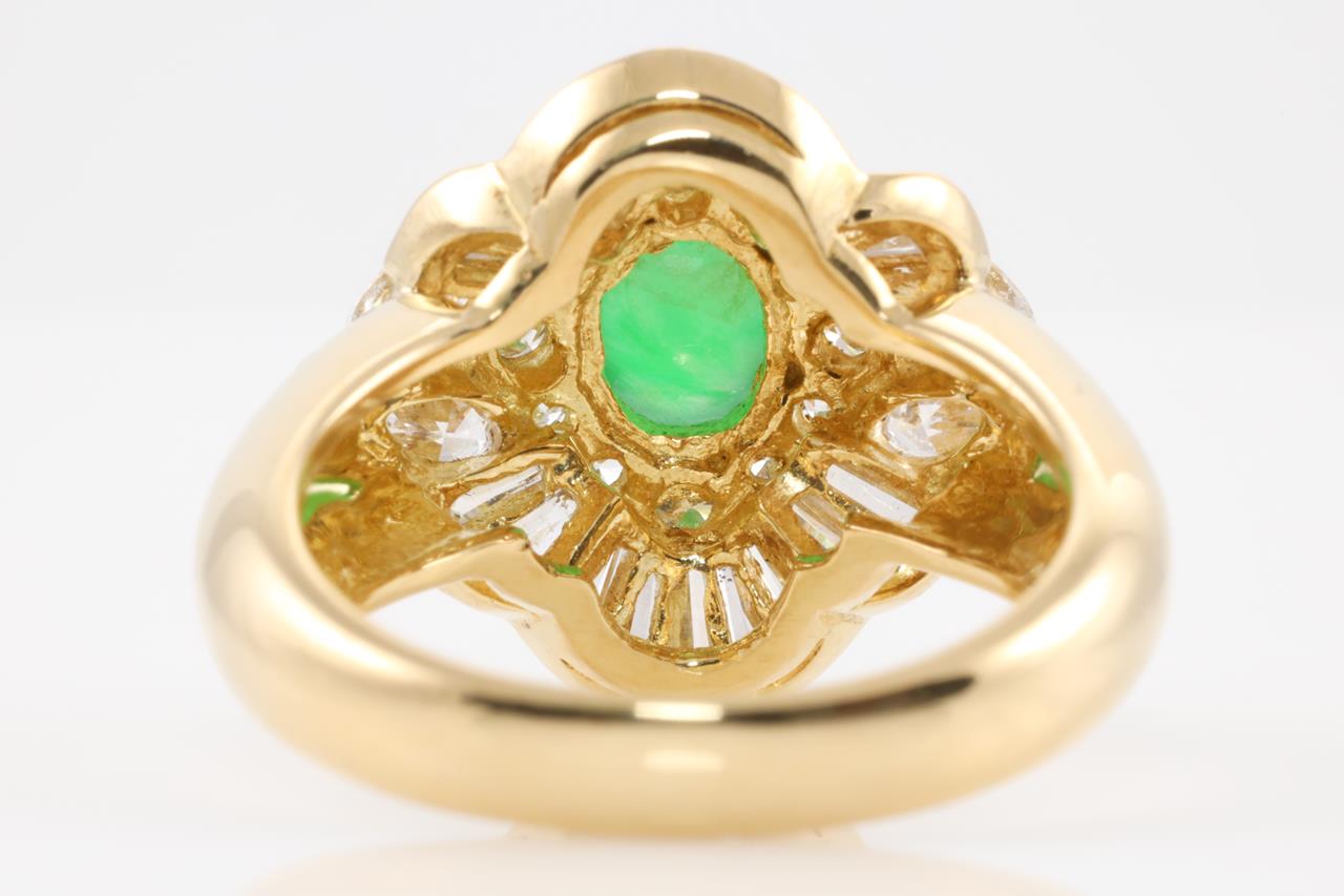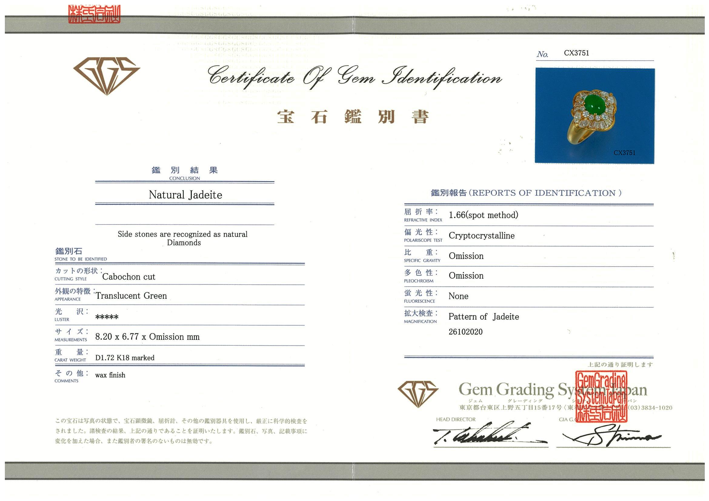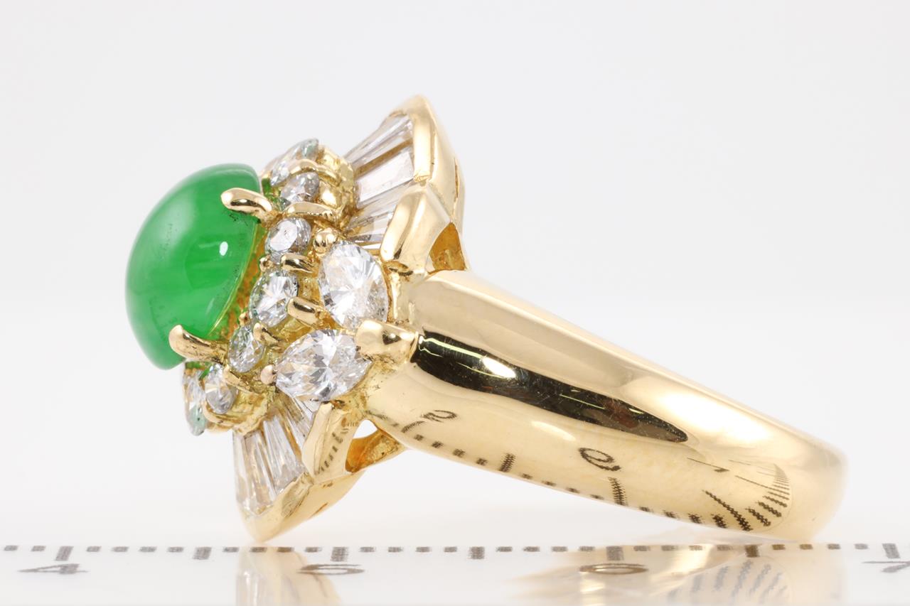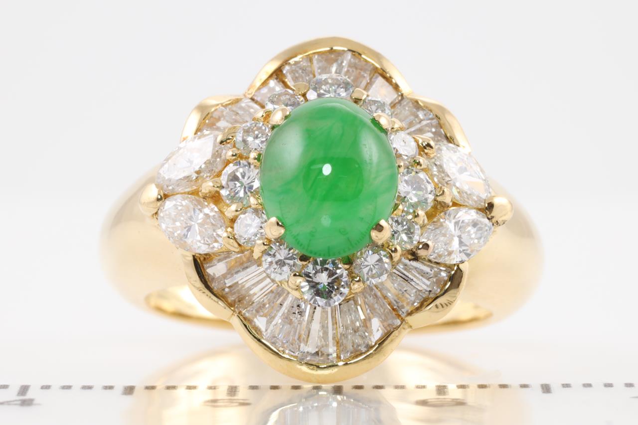 Jade and Diamond ring with oval cabochon cut Translucent green natural Jadeite Jade of 2.10ct and Diamonds totalling 1.72cts (Estimated grading: G-H VS). 18ct yellow gold. Ring size N – Note resizing up is not recommended, can only be resized down with ring clip. Certificate #413706. Weight: 8.9g. (Pre-owned)