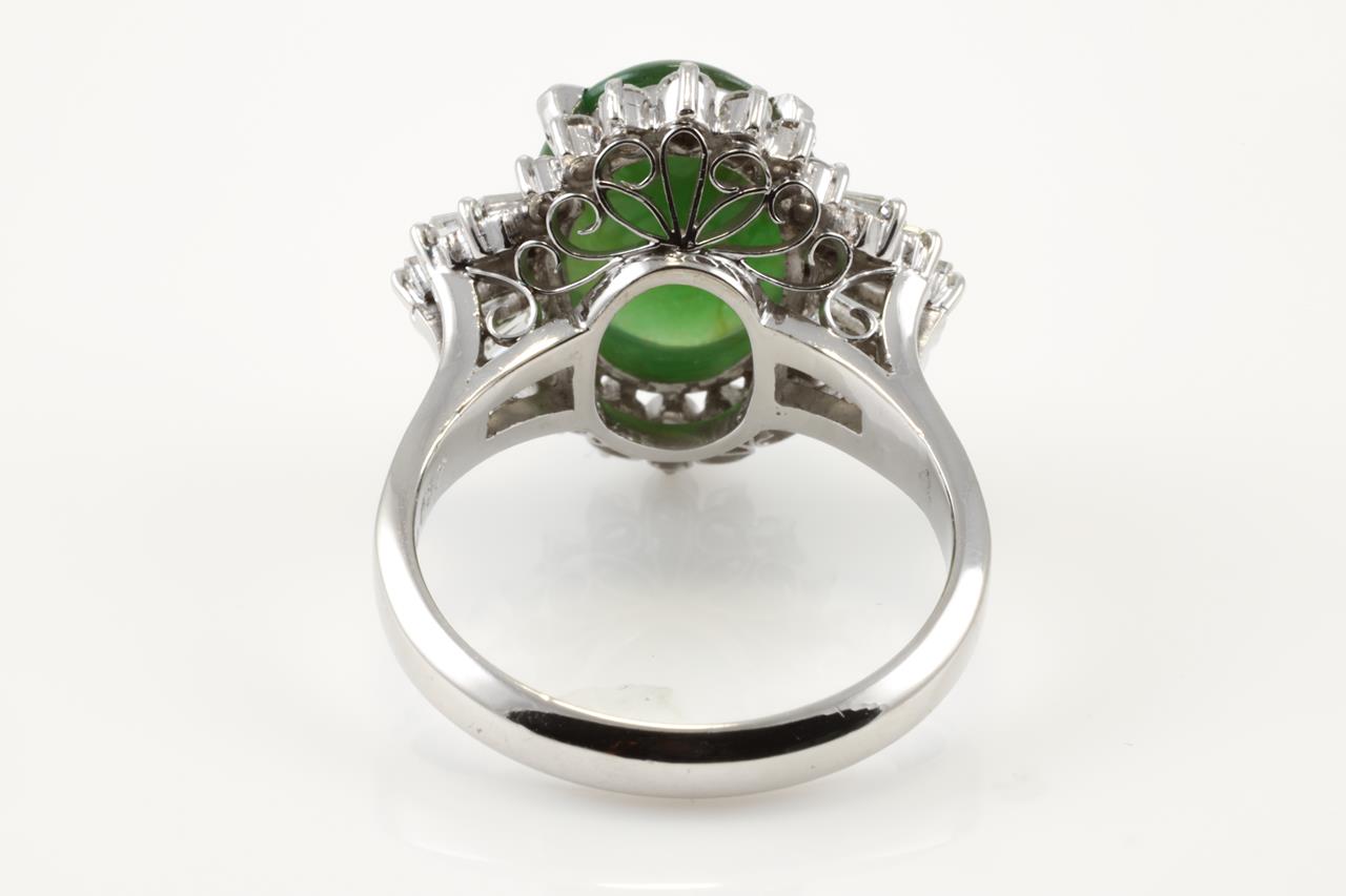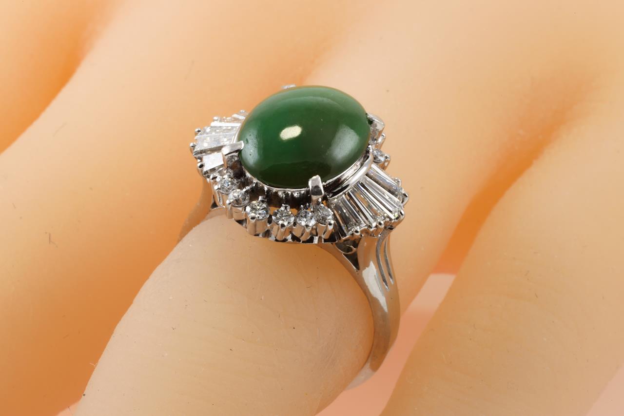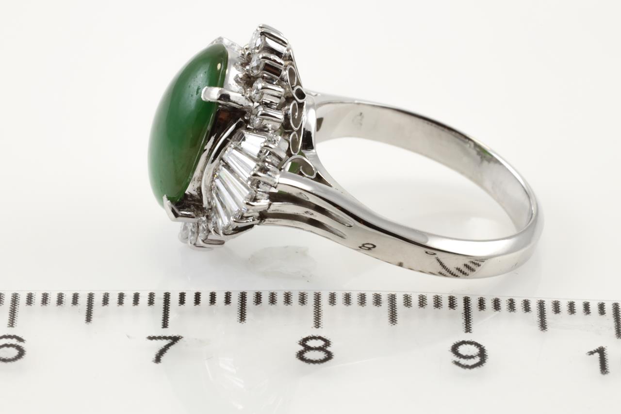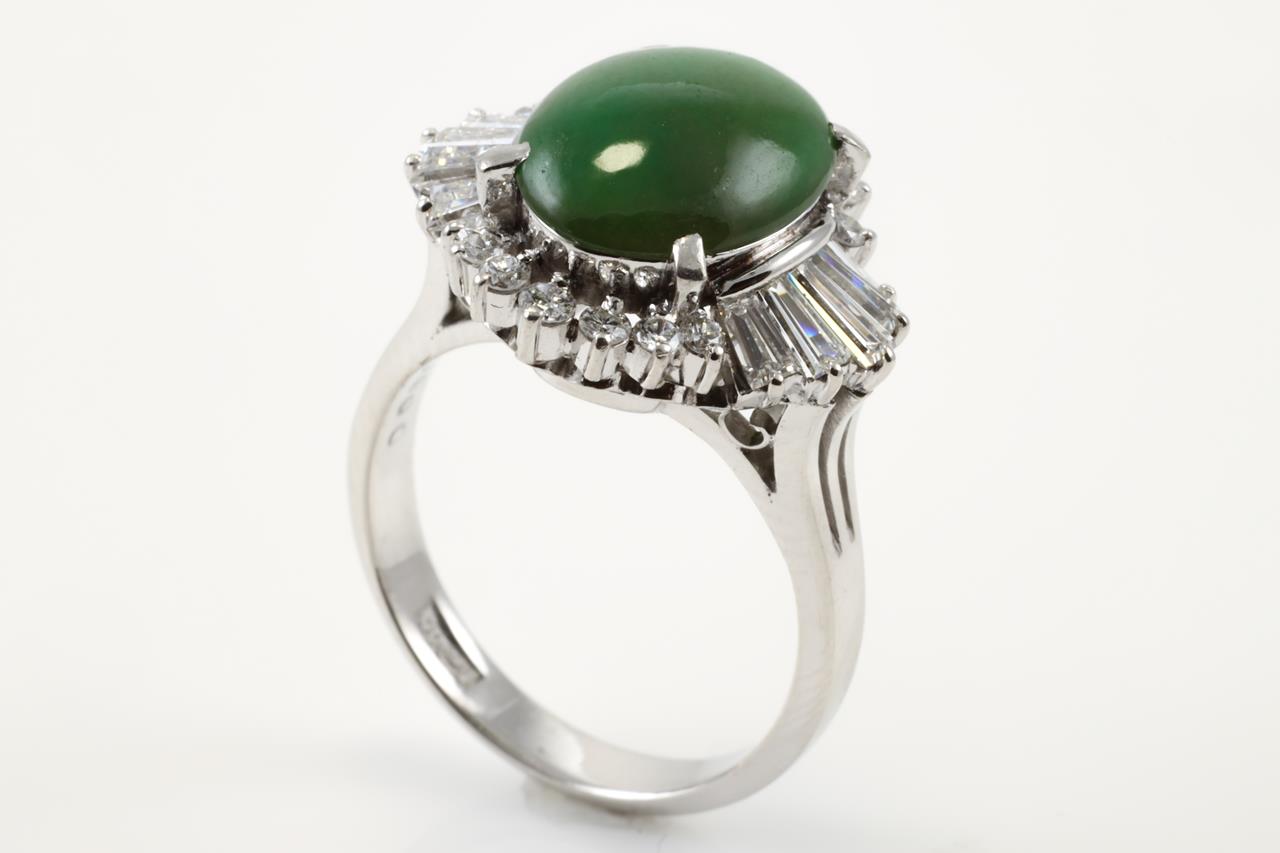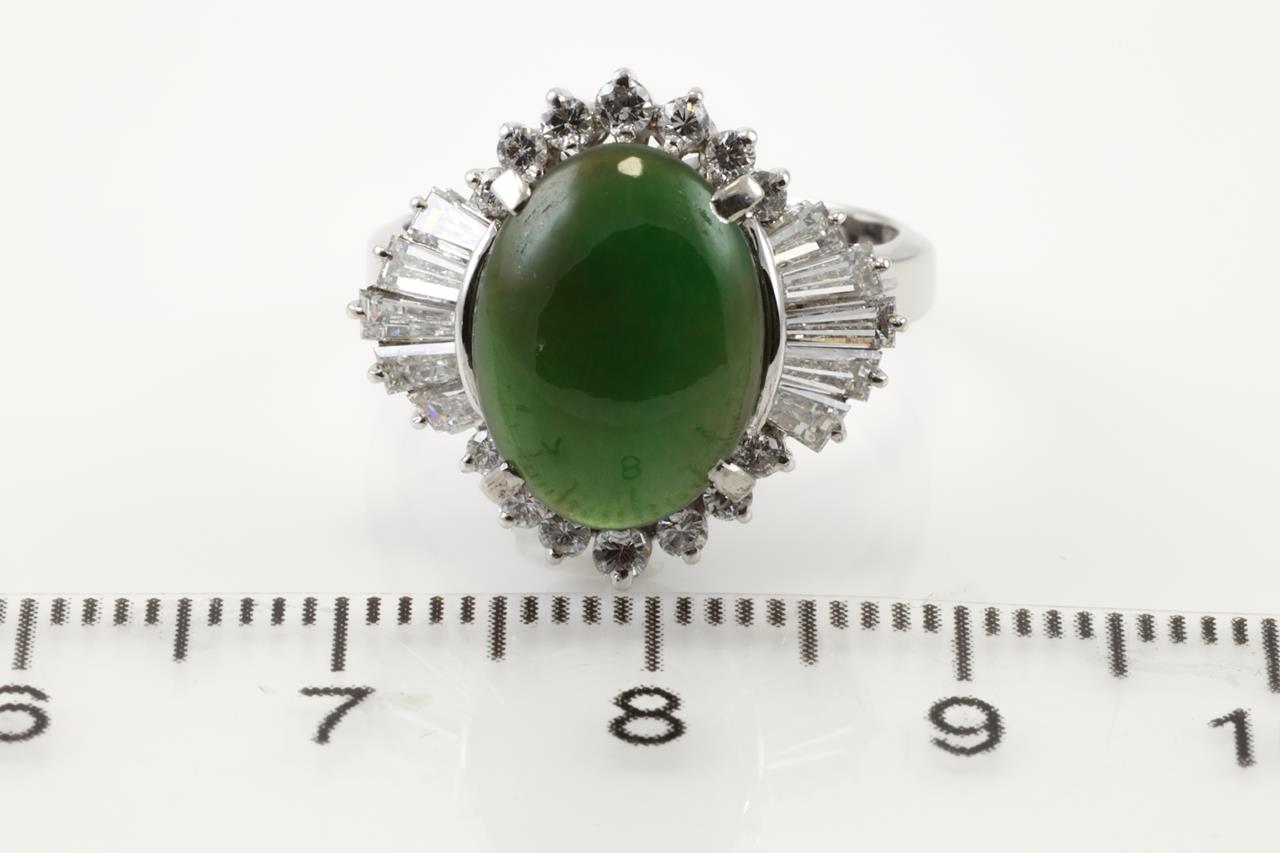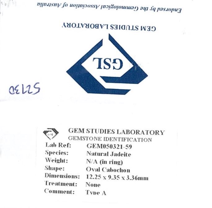 Jade and Diamond ring with a natural Type A Jadeite Jade of 12.25 x 9.35 x 3.36mm (with GSL memo #GEM050321-59) and Diamonds totalling 0.87cts (Estimated grading: H-I SI). Platinum. Ring size: L. Weight: 7.9g (Pre-owned)