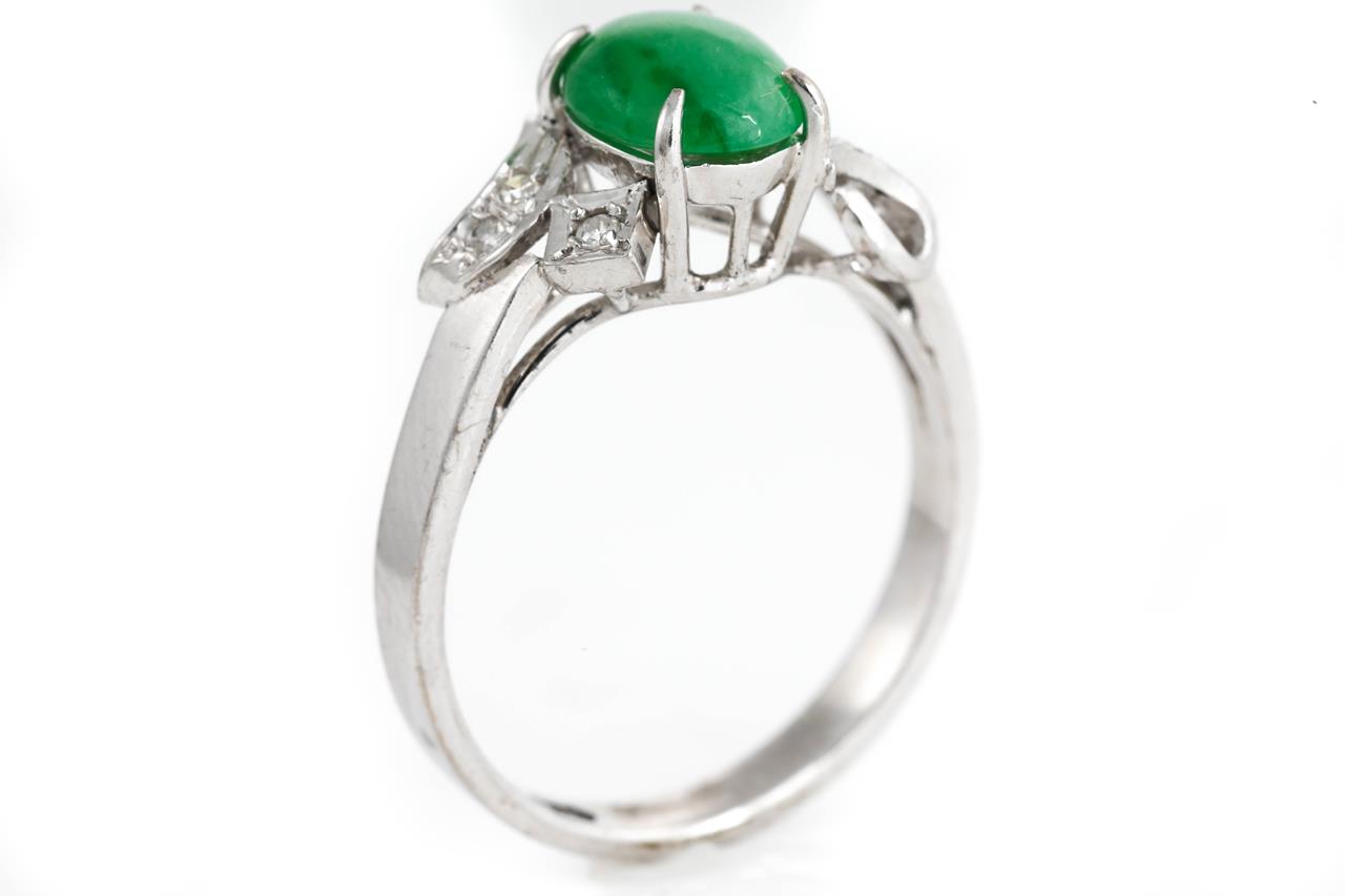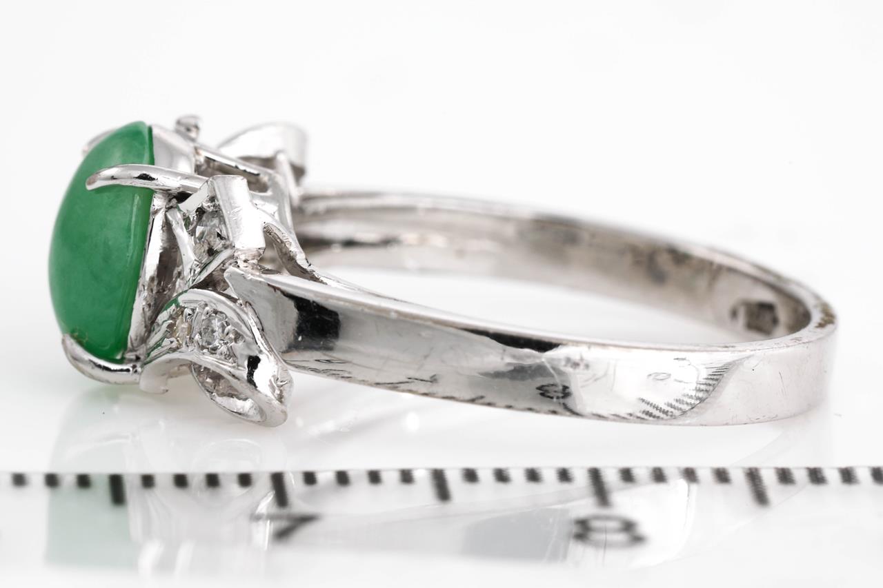 Jade and Diamond Ring with centre cabochon cut Jadeite Jade of approximately 1.00cts with round Diamonds totalling approximately 0.12cts. 14ct white gold. Ring size M 1/2. Weight 3.3g. (As New)