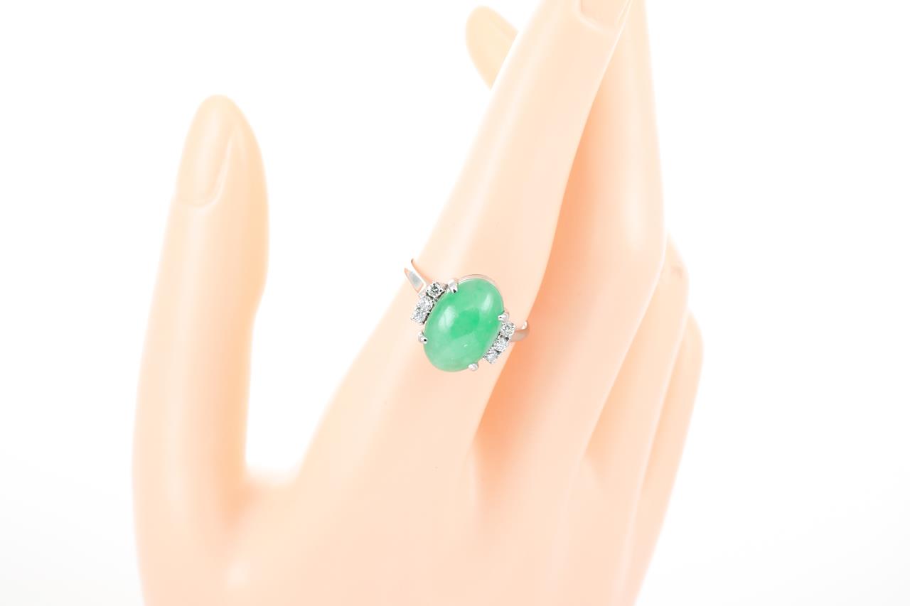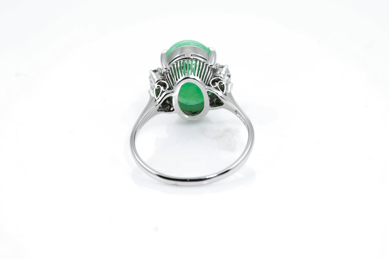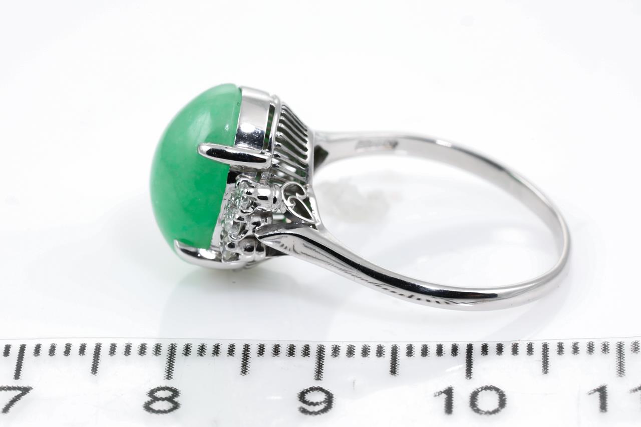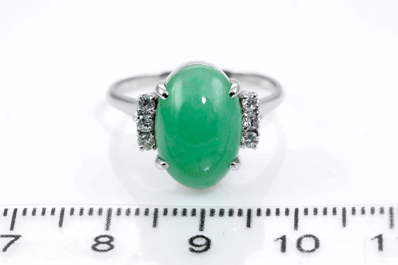 Jade and Diamond ring with centre oval cabochon cut Type A natural Jadite Jade of 13.7mm x 9.3mm x 7.5mm and round Diamonds totalling 0.18cts. Platinum. Ring size: O1/2. Weight: 5.8g. (Pre-owned)