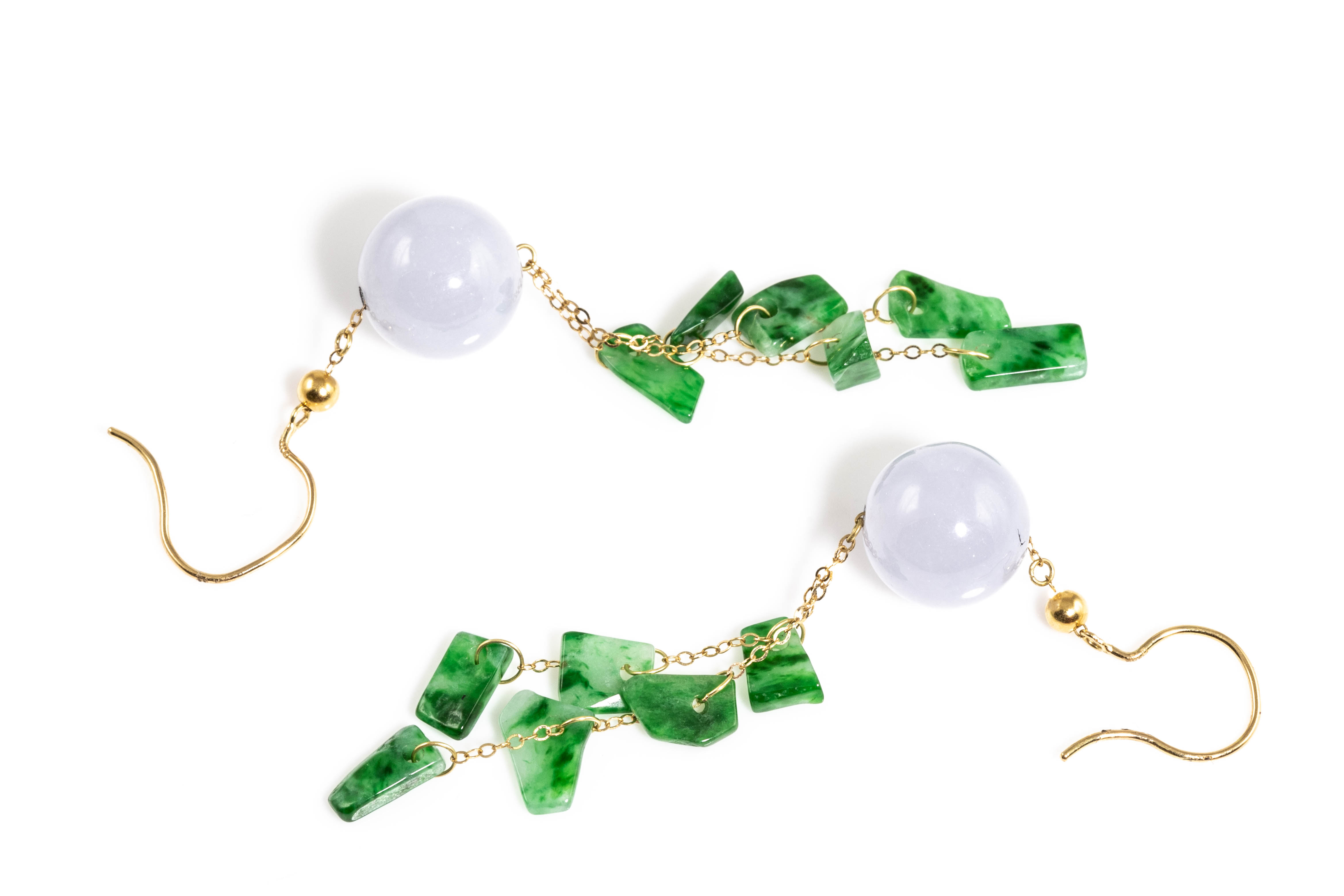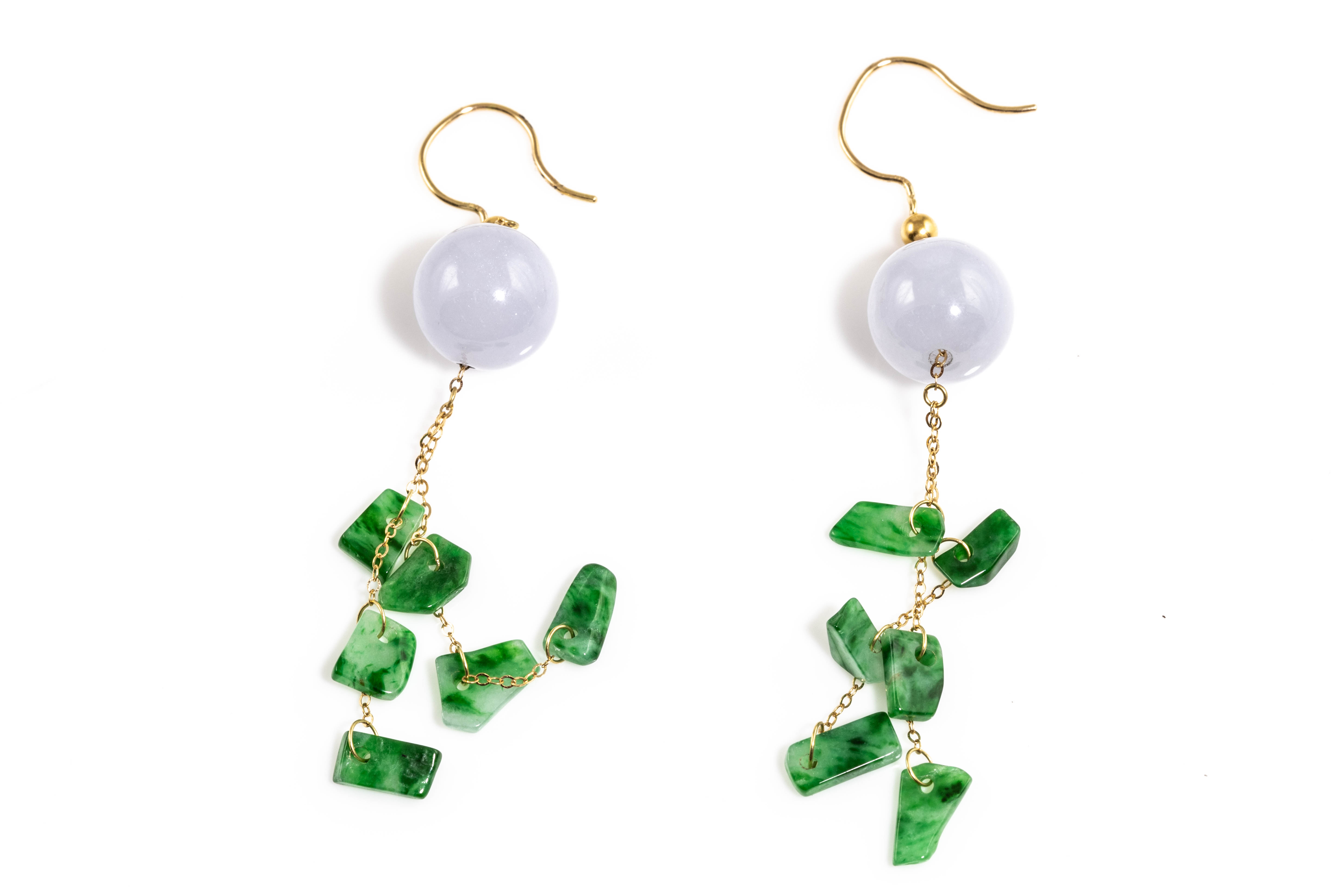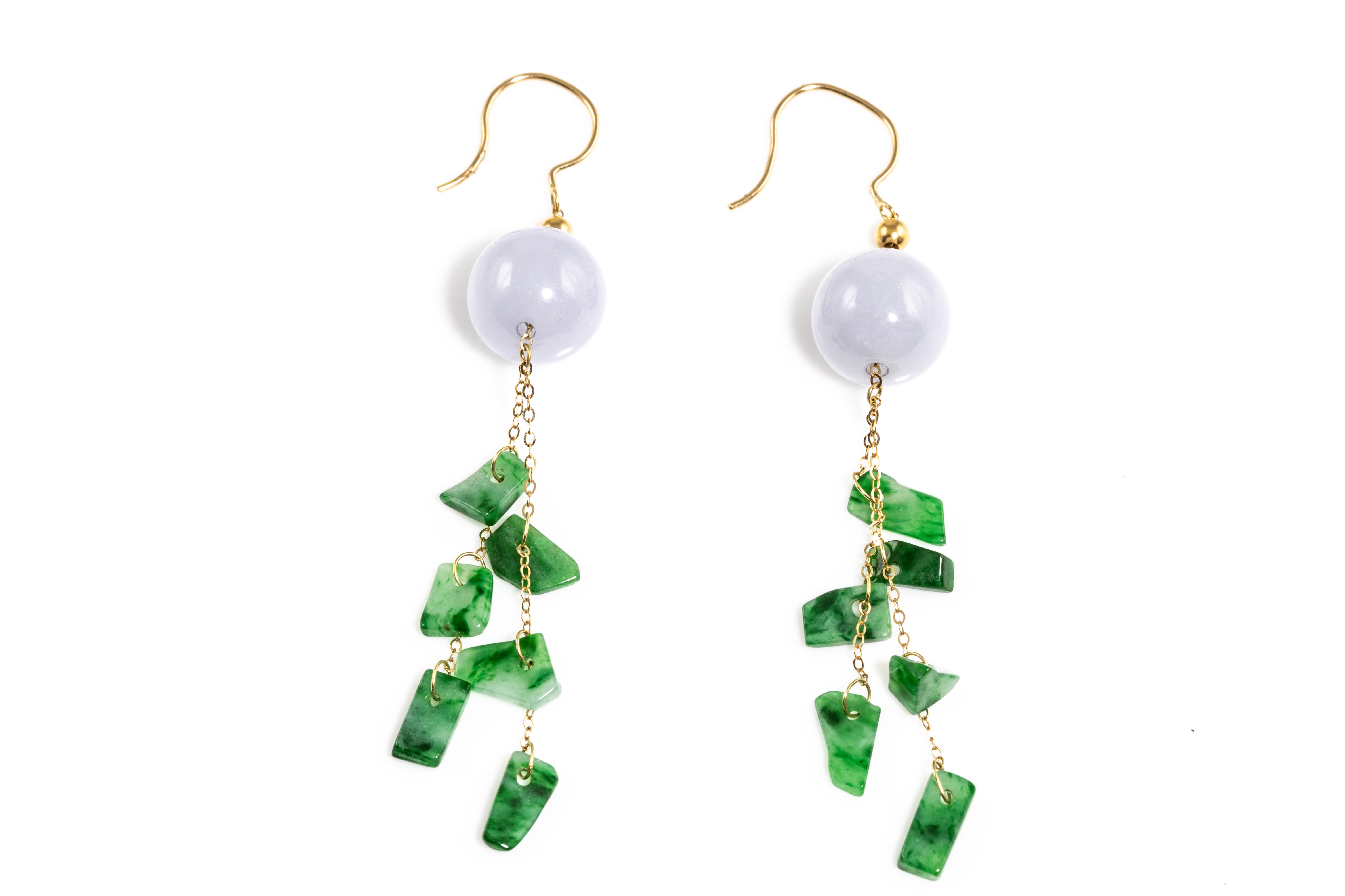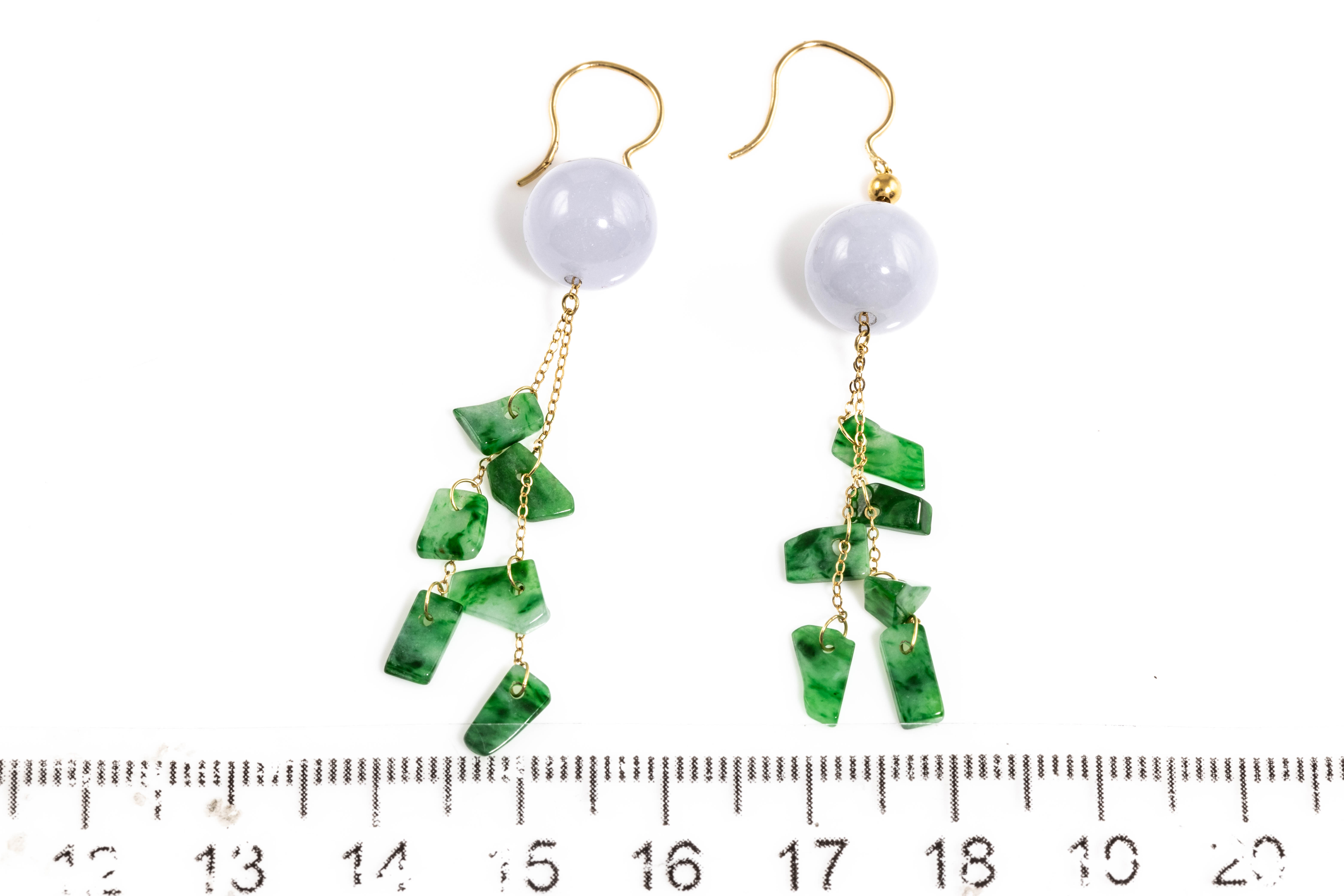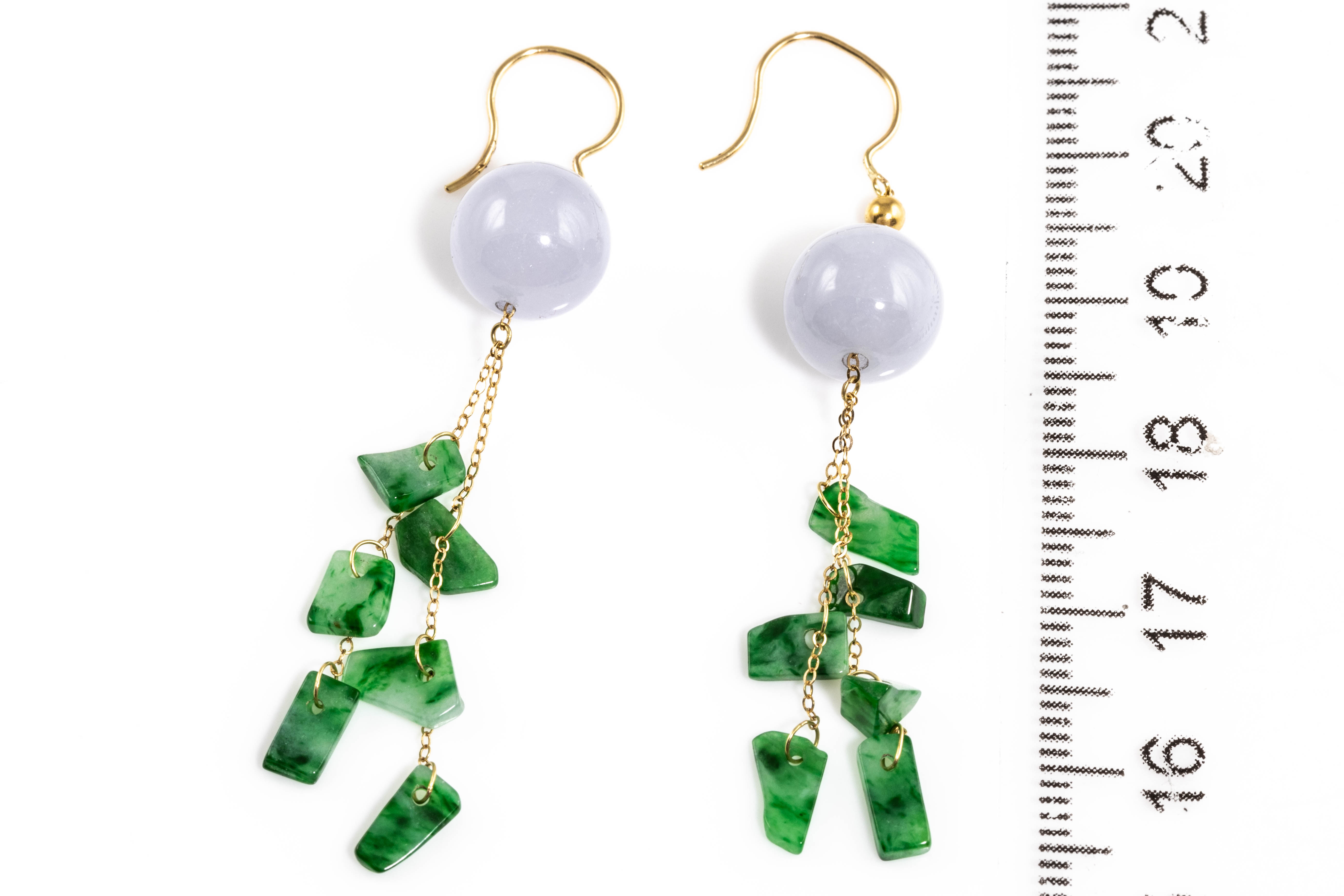 Jade dangle earrings with Lavender natural Jadeite Jade beads - type A and light to deep green Jadeite Jade. 18ct yellow gold. Weight 4.3g. (As New)