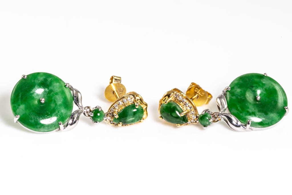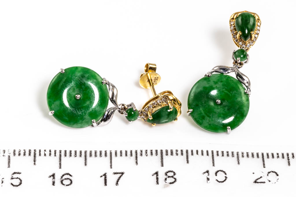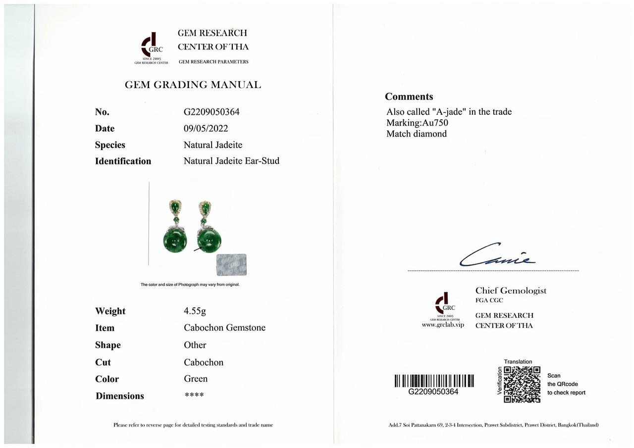 Jade drop Earrings with Natural deep green Jade Jadeite - type A (with Gem report) and Diamonds totalling approximately 0.02cts. 18ct white and yellow gold. Weight 4.5g. (As New)