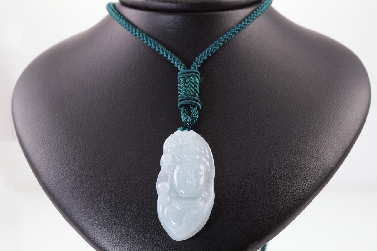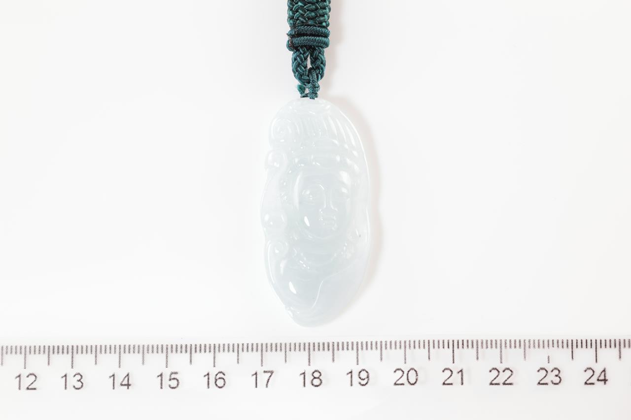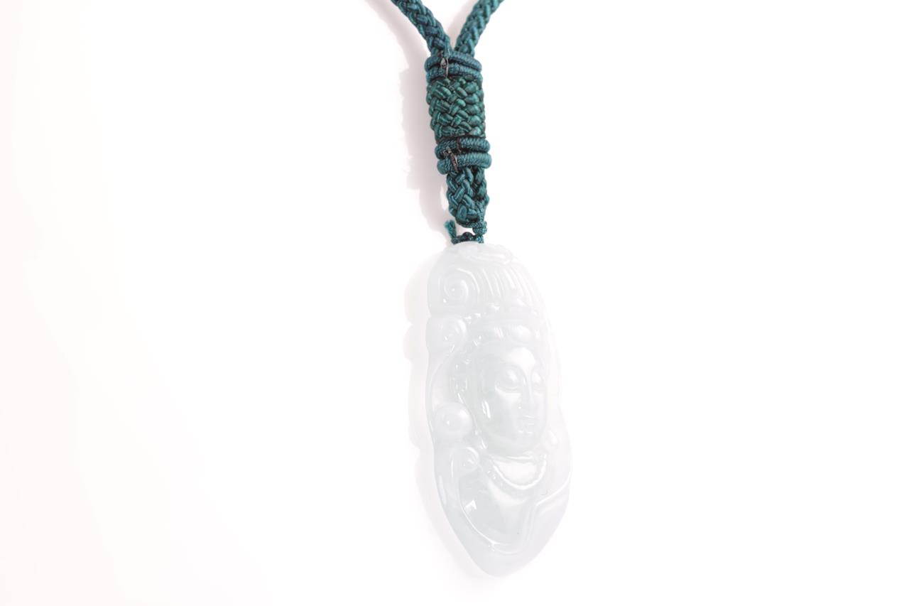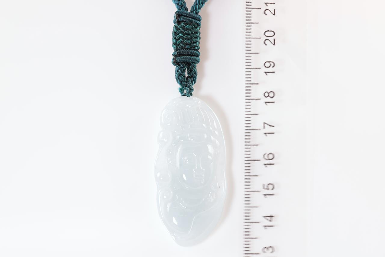 Jade Pendant with carved Qin Yin translucent light green natural Jadeite Jade - Type A. Pendant dimensions 4.7 x 2.3 x 0.5cm. With Cord, length: 64cm. Weight: 17.2g (As New)