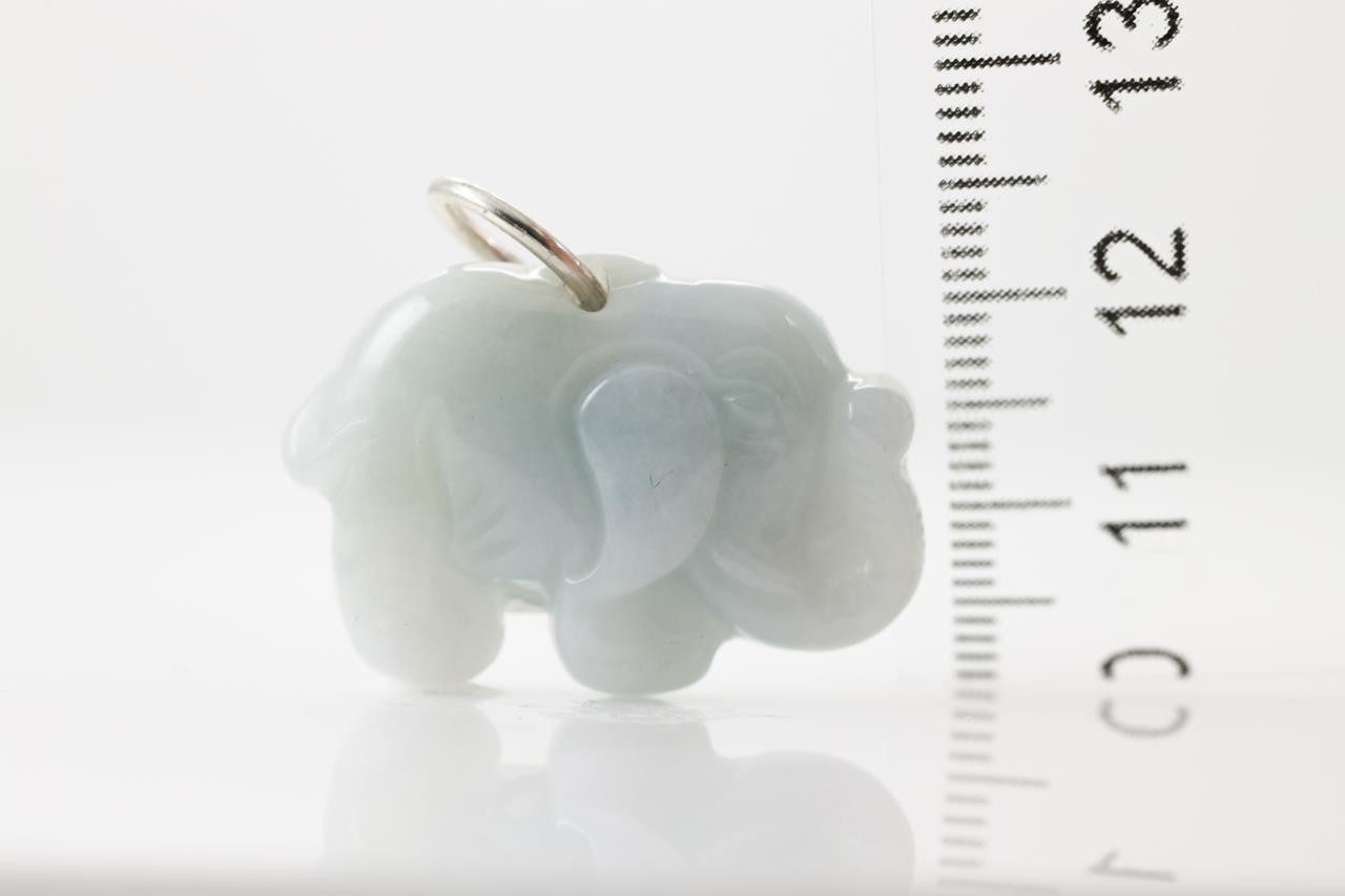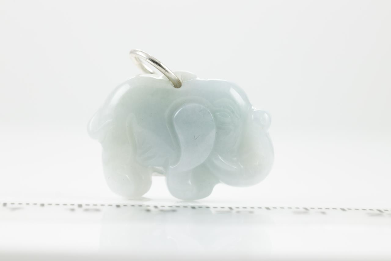 Jade Pendant with carved elephant light green Jadeite Jade. Dimensions 2.5 x 1.8 x 0.4cm. With silver bale. Weight: 5.4g. (As New)