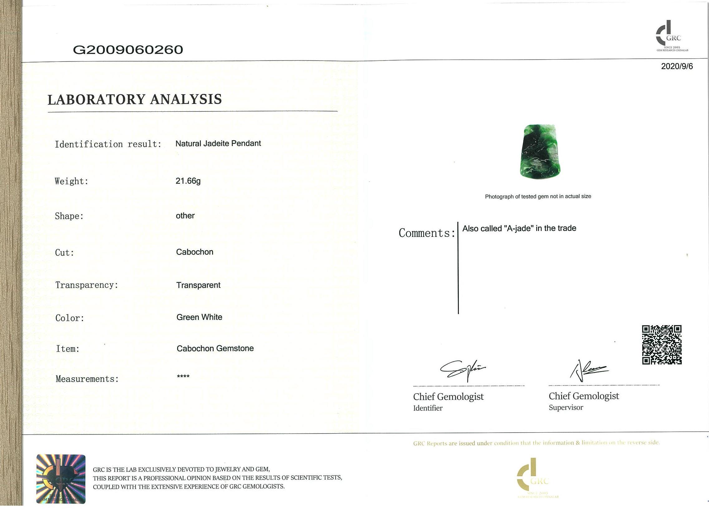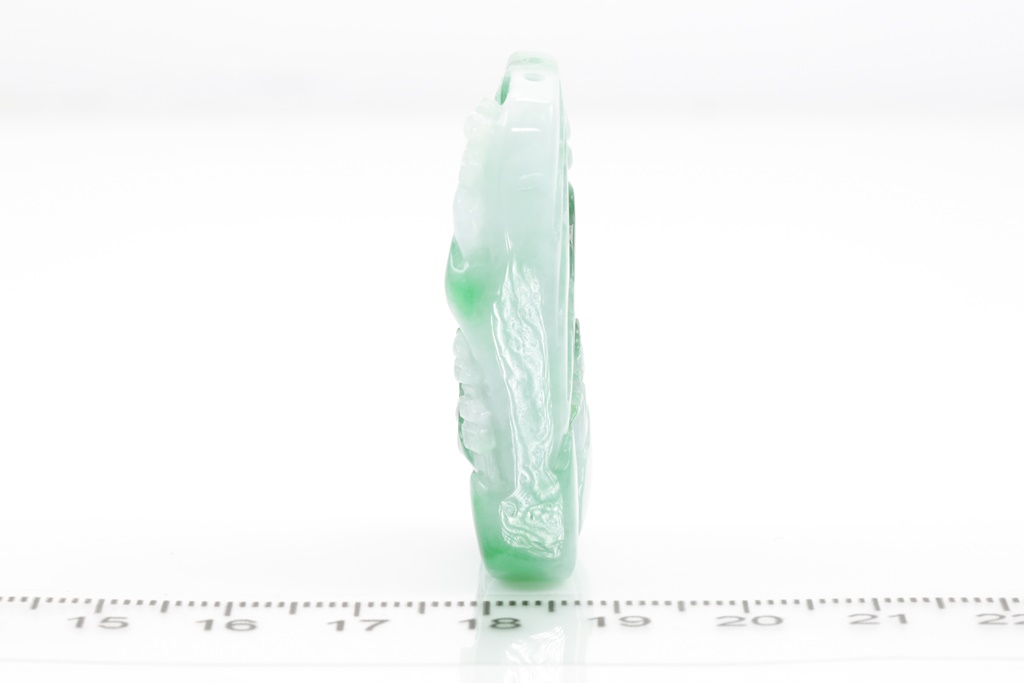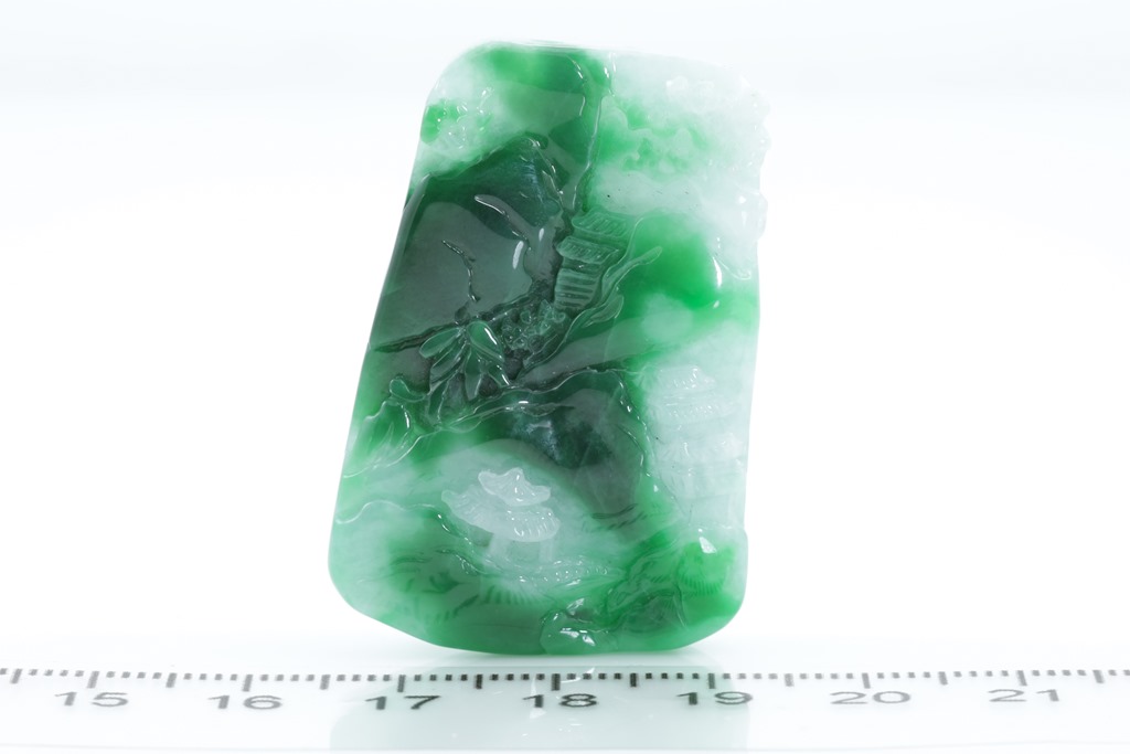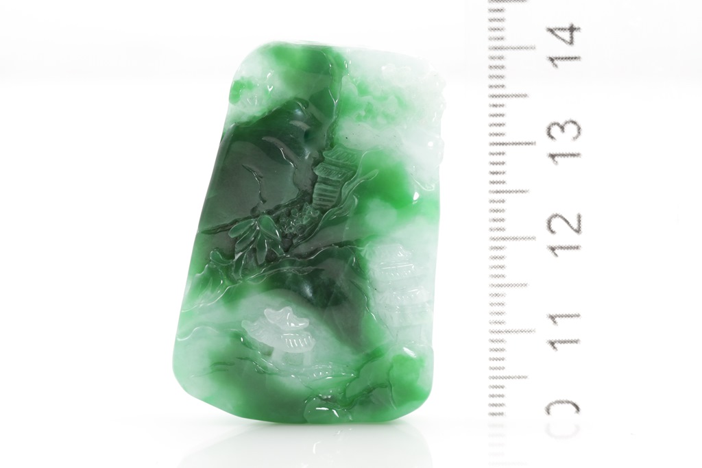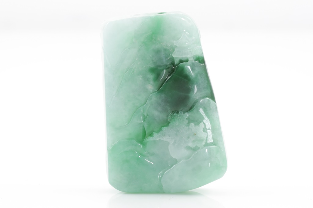 Jade Pendant with carved landscape green and white natural Jadeite Jade - Type A. Pendant dimensions 4.0 x 2.6 x 0.8cm (Drilled to wear with a fine cord). Weight: 21.66g With GRC certificate #G2009060260. (As New)