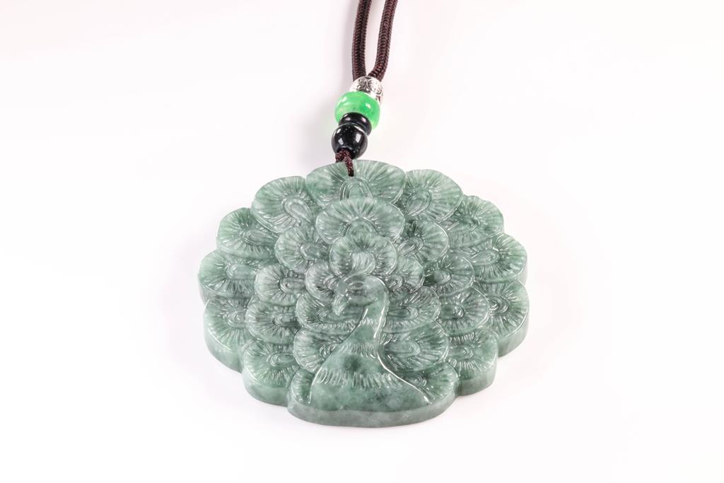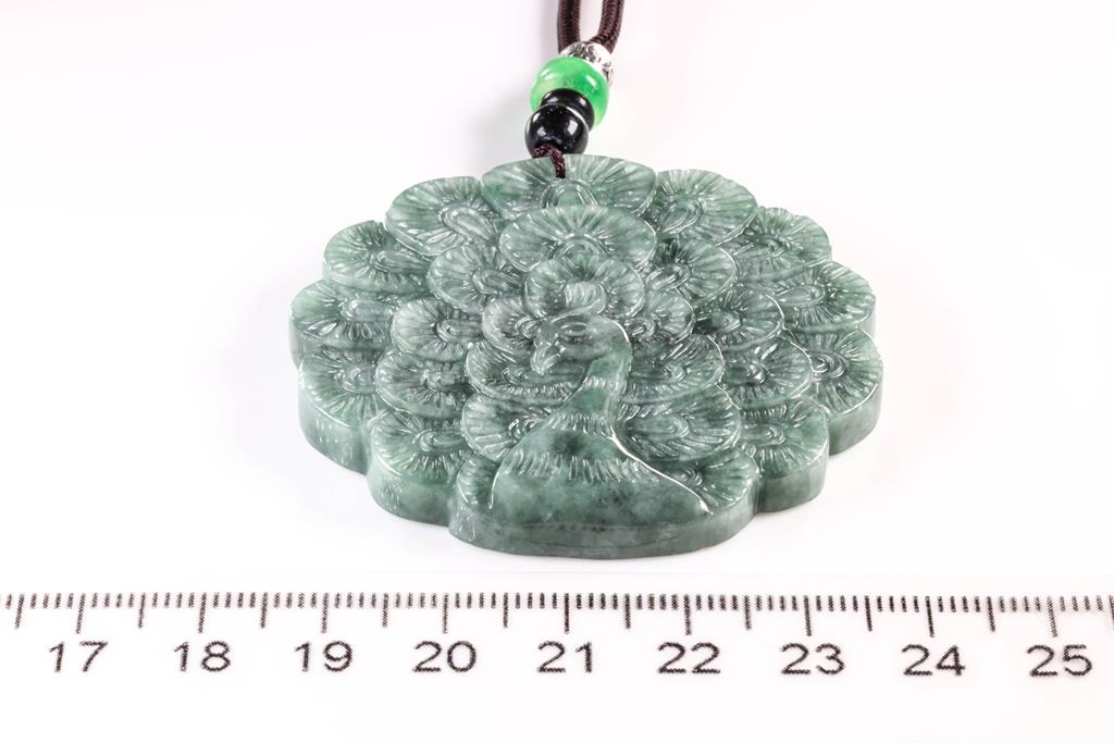 Jade Pendant with carved peacock green Natural Jade - Type A. With Gem Testing Report #HL12012227506. Diameter 5.2cm. On cord. (As New)
