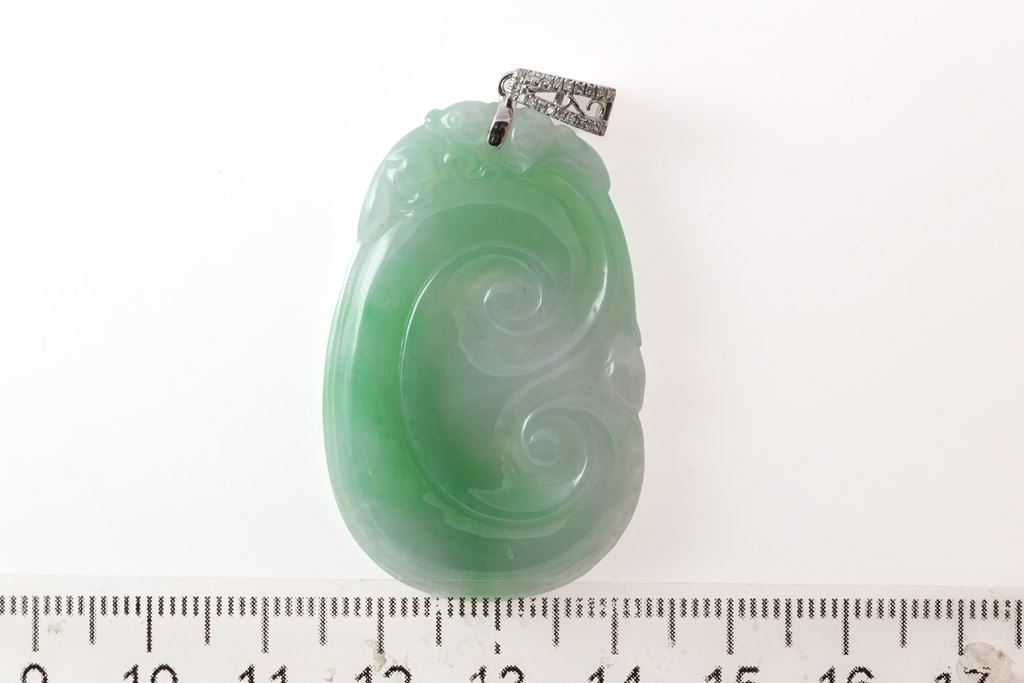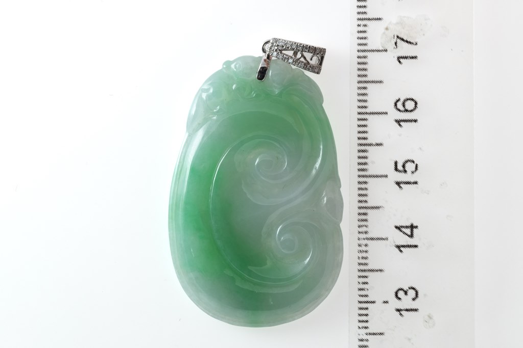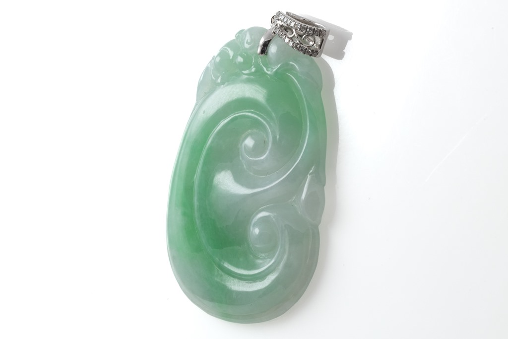 Jade pendant carved 'Ruyi' shape with light green to green patches translucent natural Type A Jadeite Jade . 18ct white gold bale with round cut Diamonds totalling approximately 0.11cts. Size: 43.1 x 27.8 x 4.45cm. No chain provied. Weight 11g. With Hong Kong Kowloon Laboratory #SC121682. (As New)