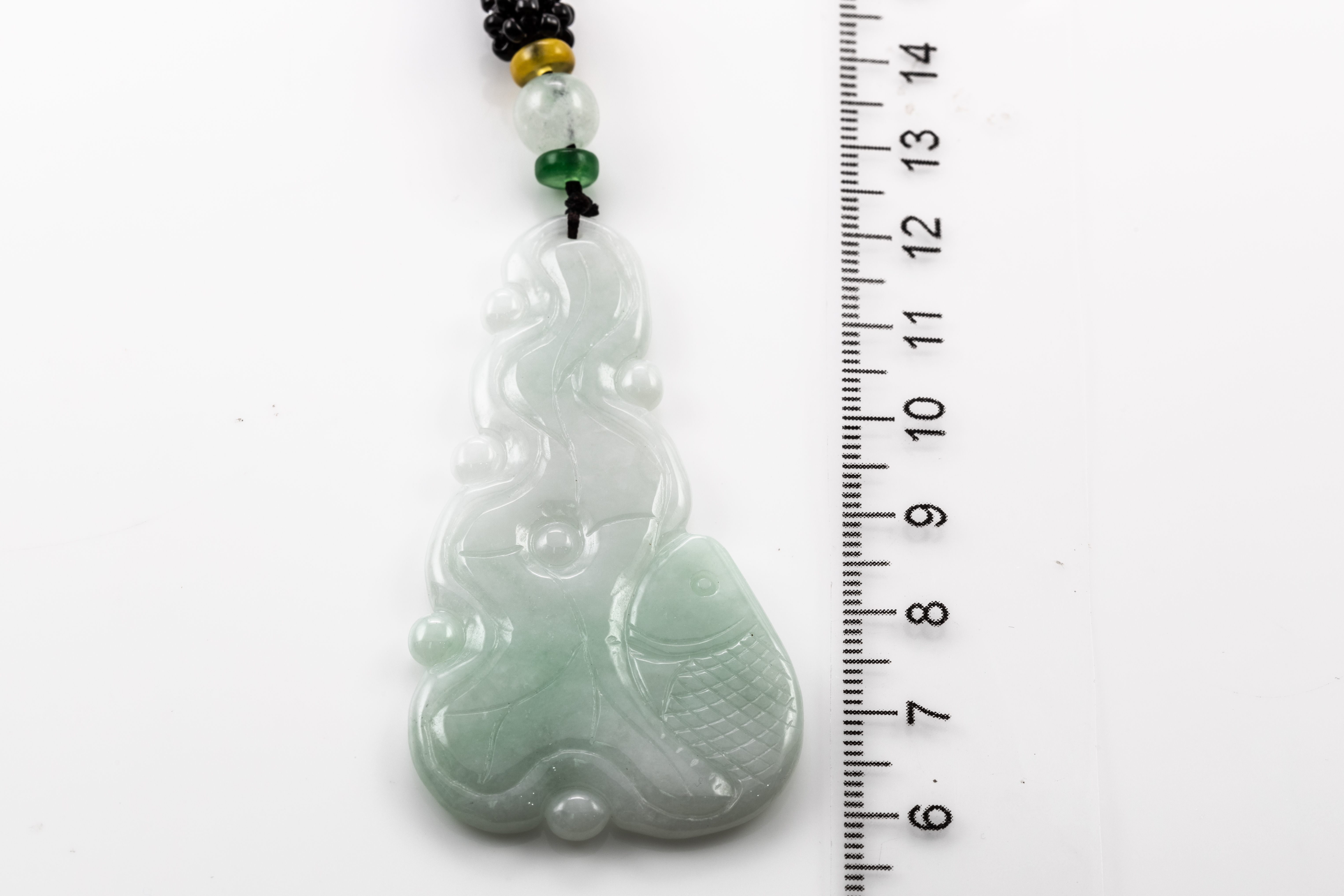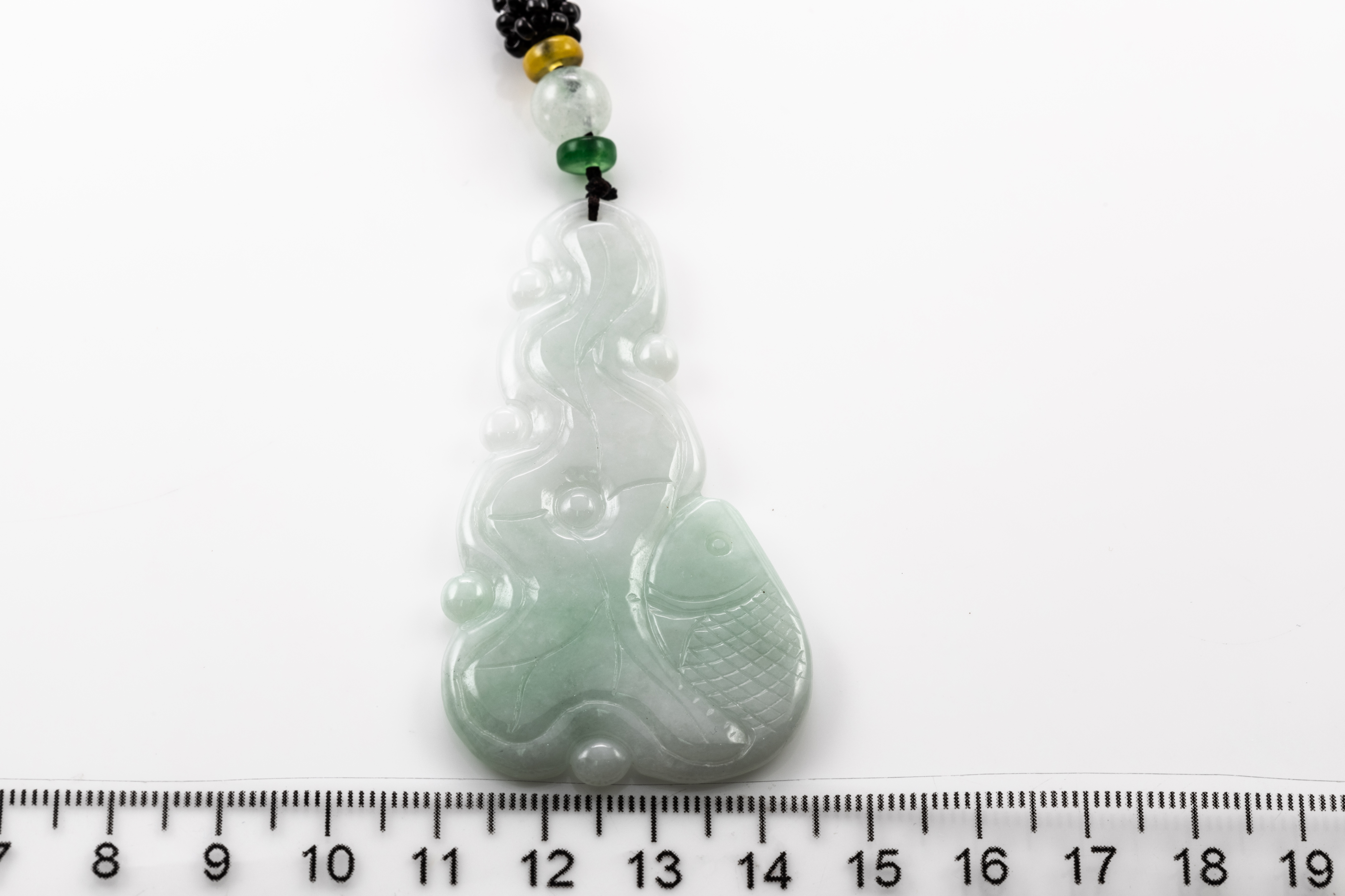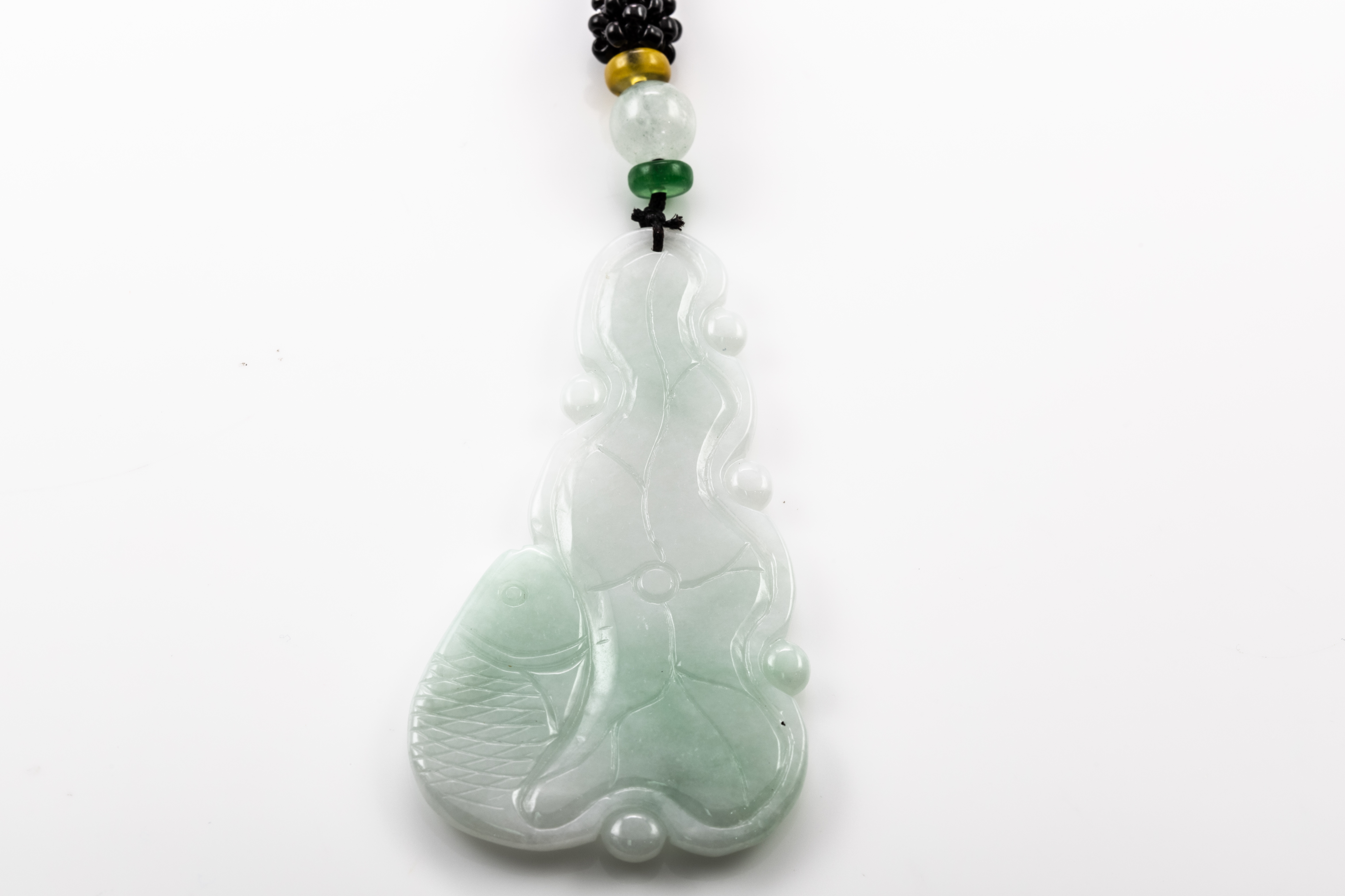 Jade Pendant with carved lily pad and fish Light green Type A natual Jadeite Jade. Weight 15.0g. With gem report. On cord with adjustable Length 44cm. Weight: 18g. (Pre-owned)