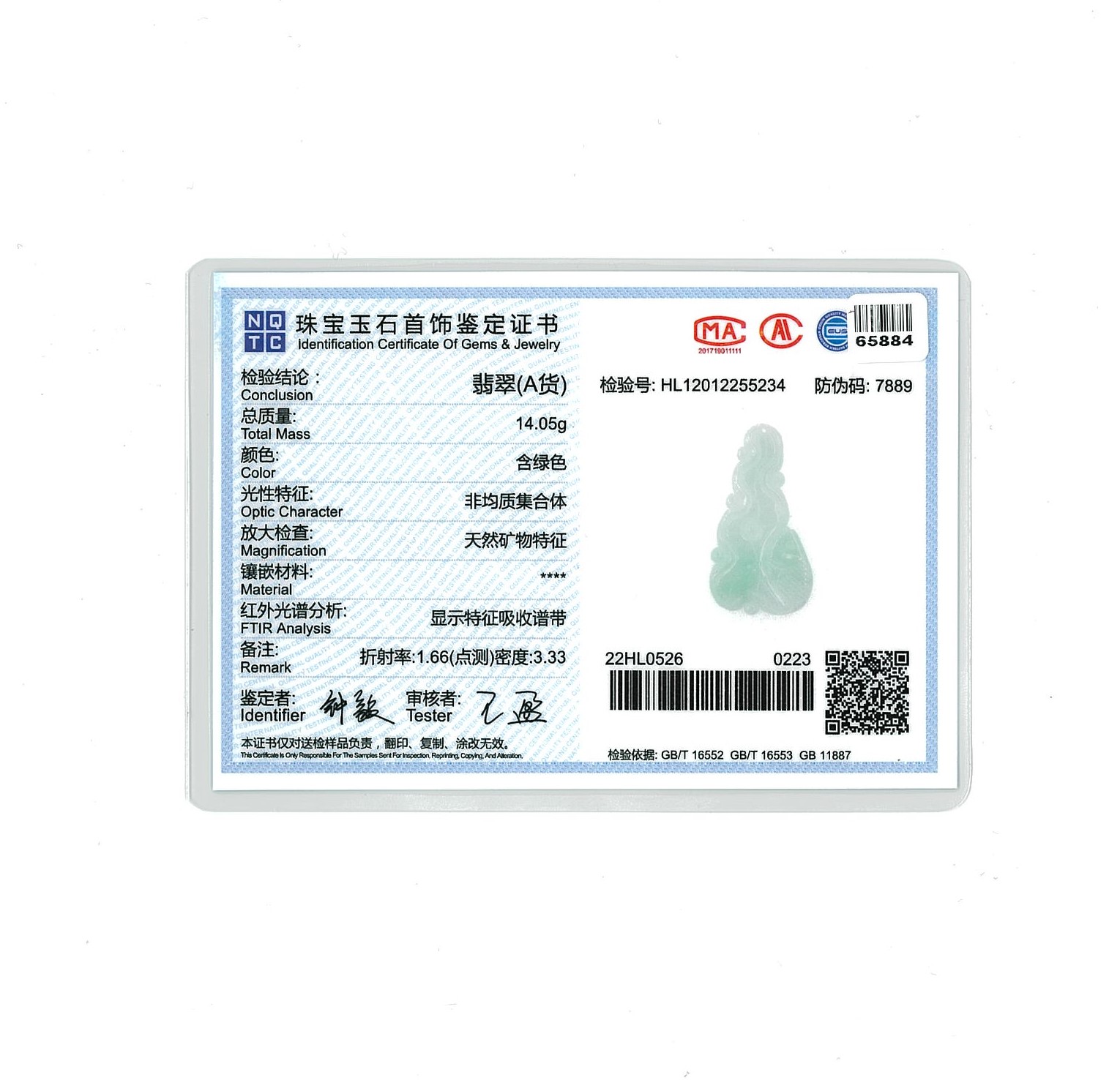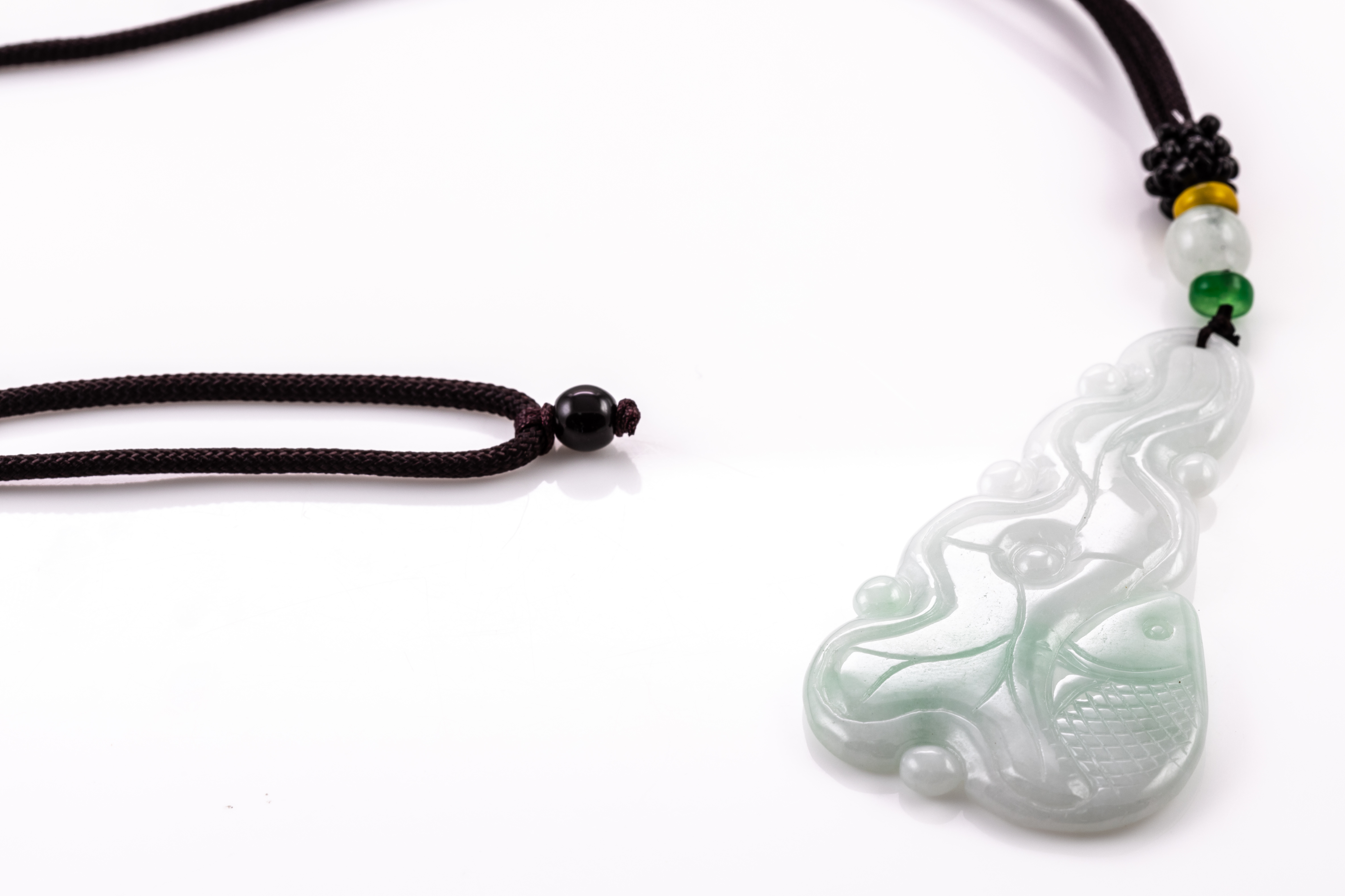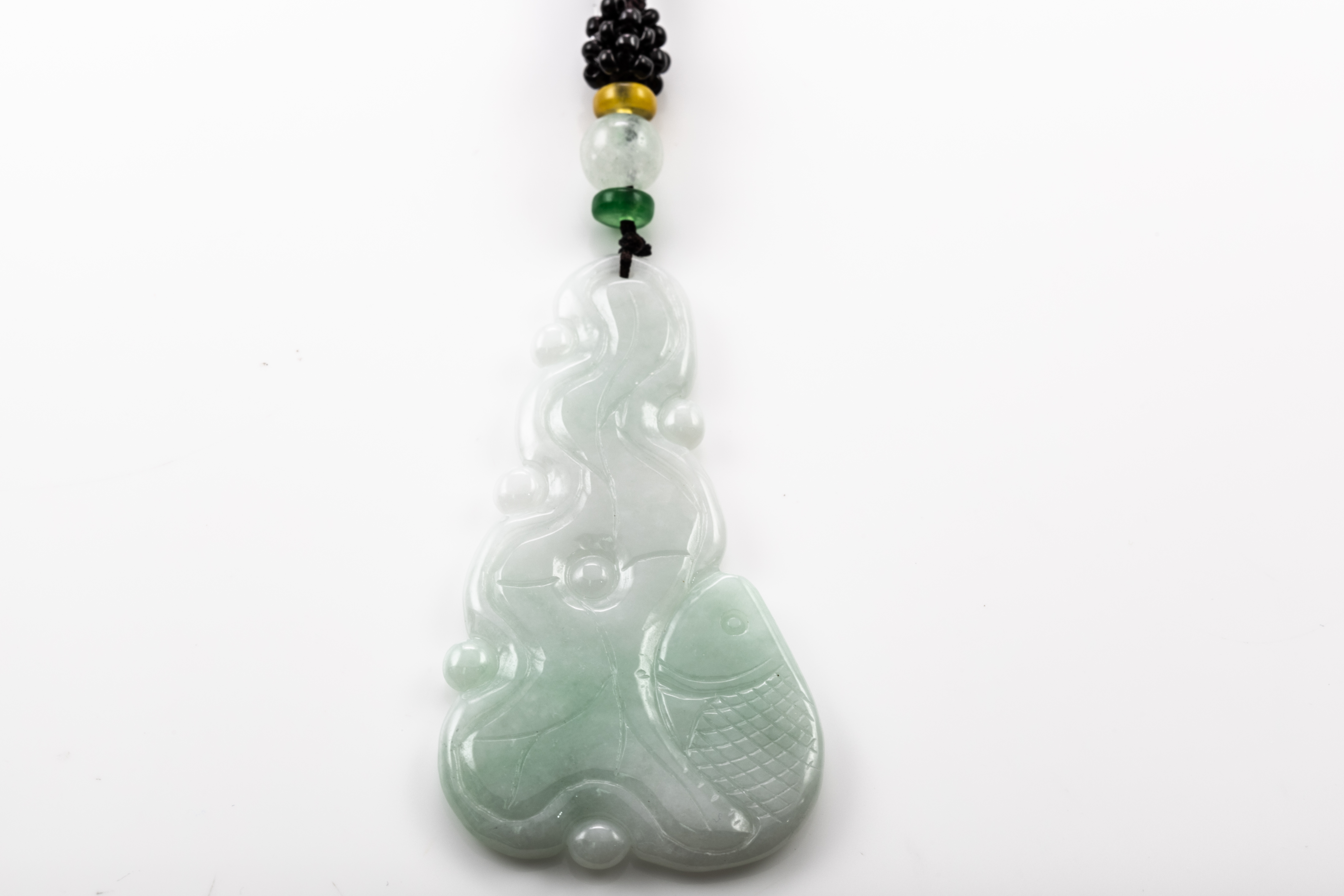 Jade Pendant with carved lily pad and fish Light green Type A natual Jadeite Jade. Weight 15.0g. With gem report. On cord with adjustable Length 44cm. Weight: 18g. (Pre-owned)