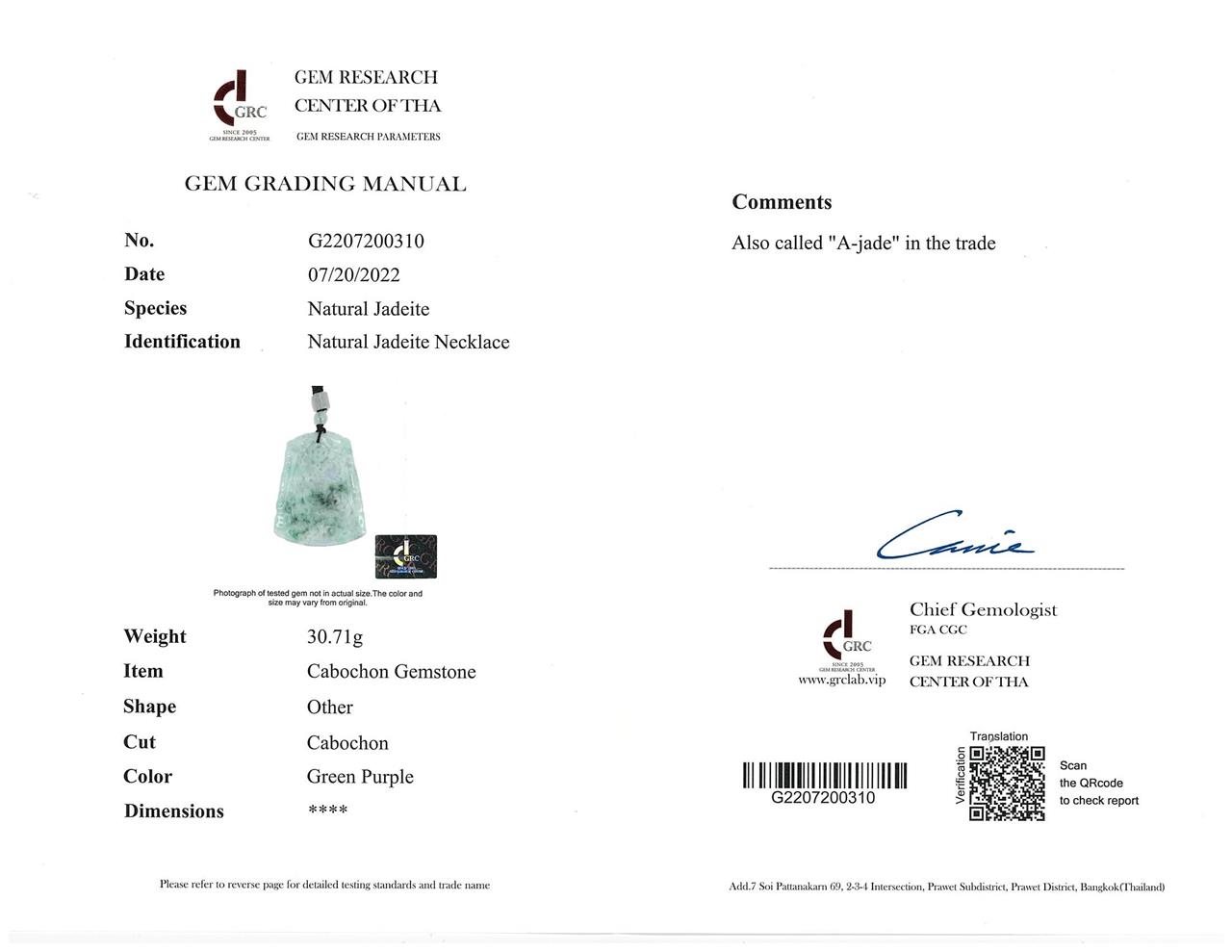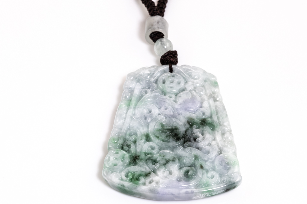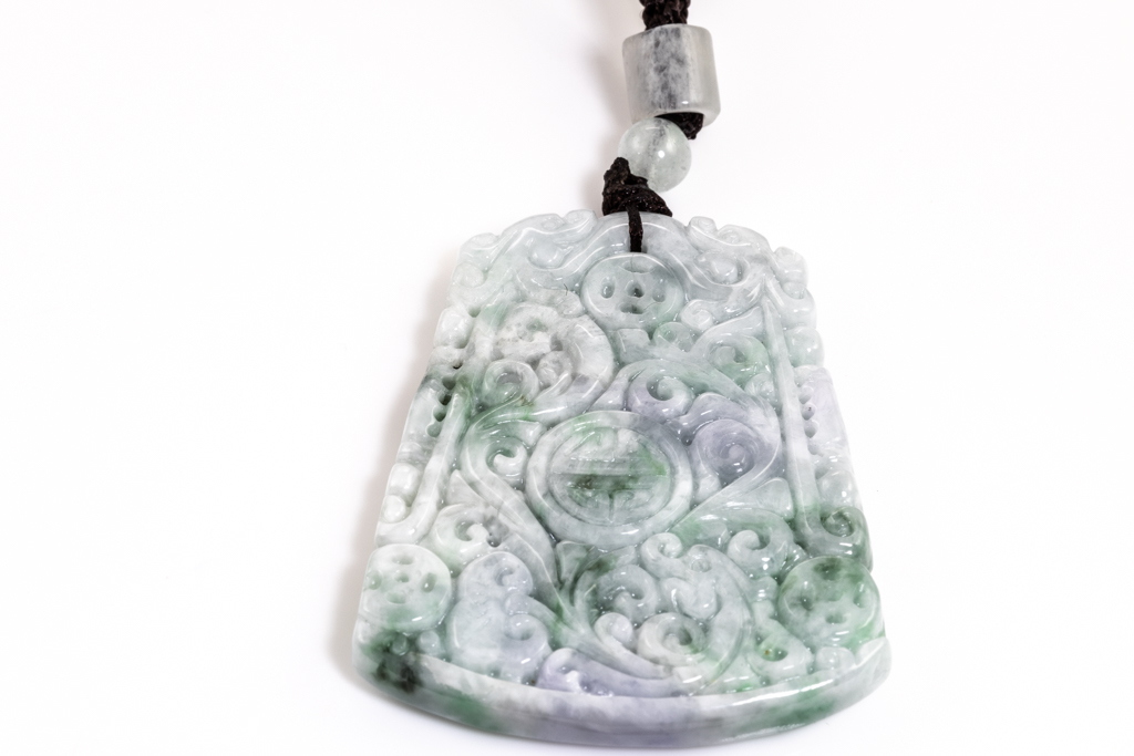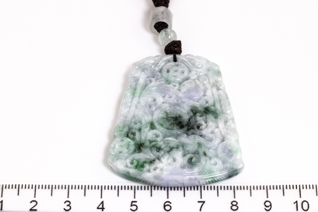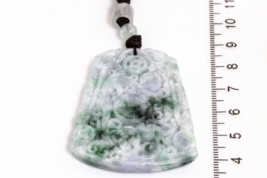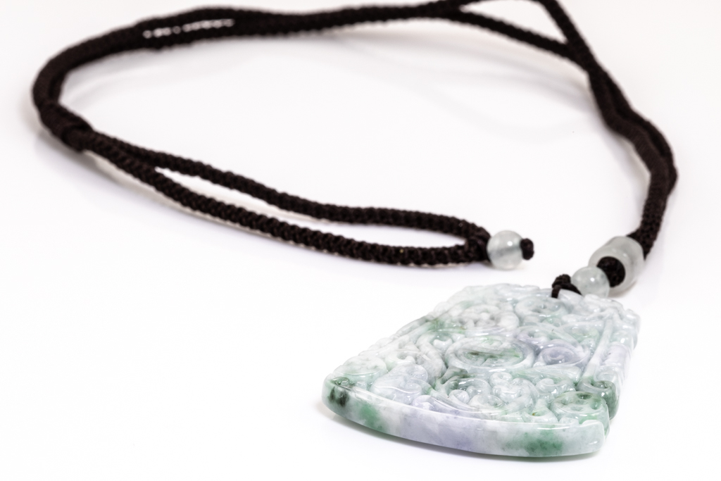Jade Pendant, carved light green and white Jadeite - Type A. With gem report. On adjustable cord. Length 34cm. Weight 30.7g (Pre-owned)