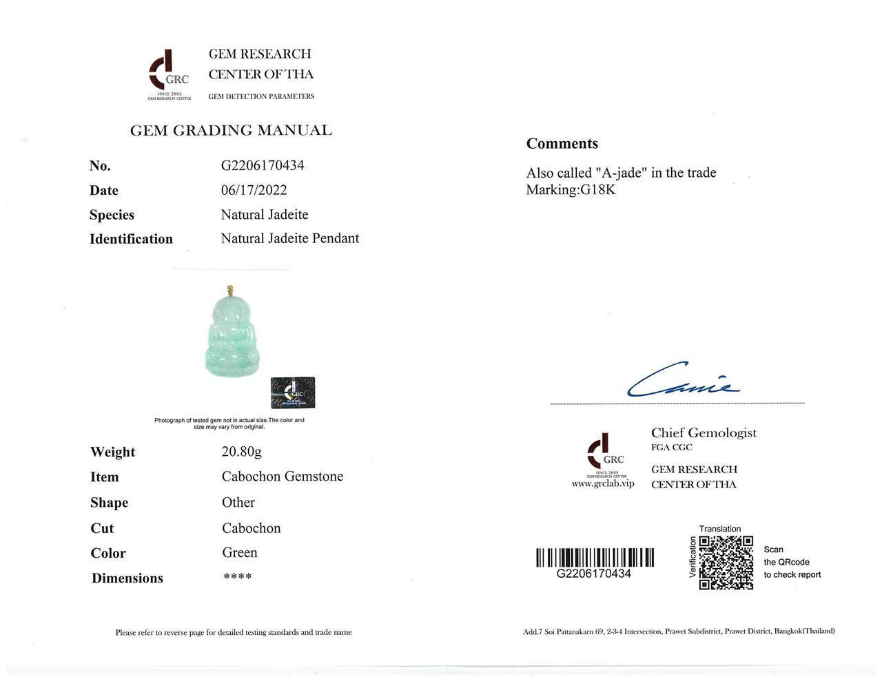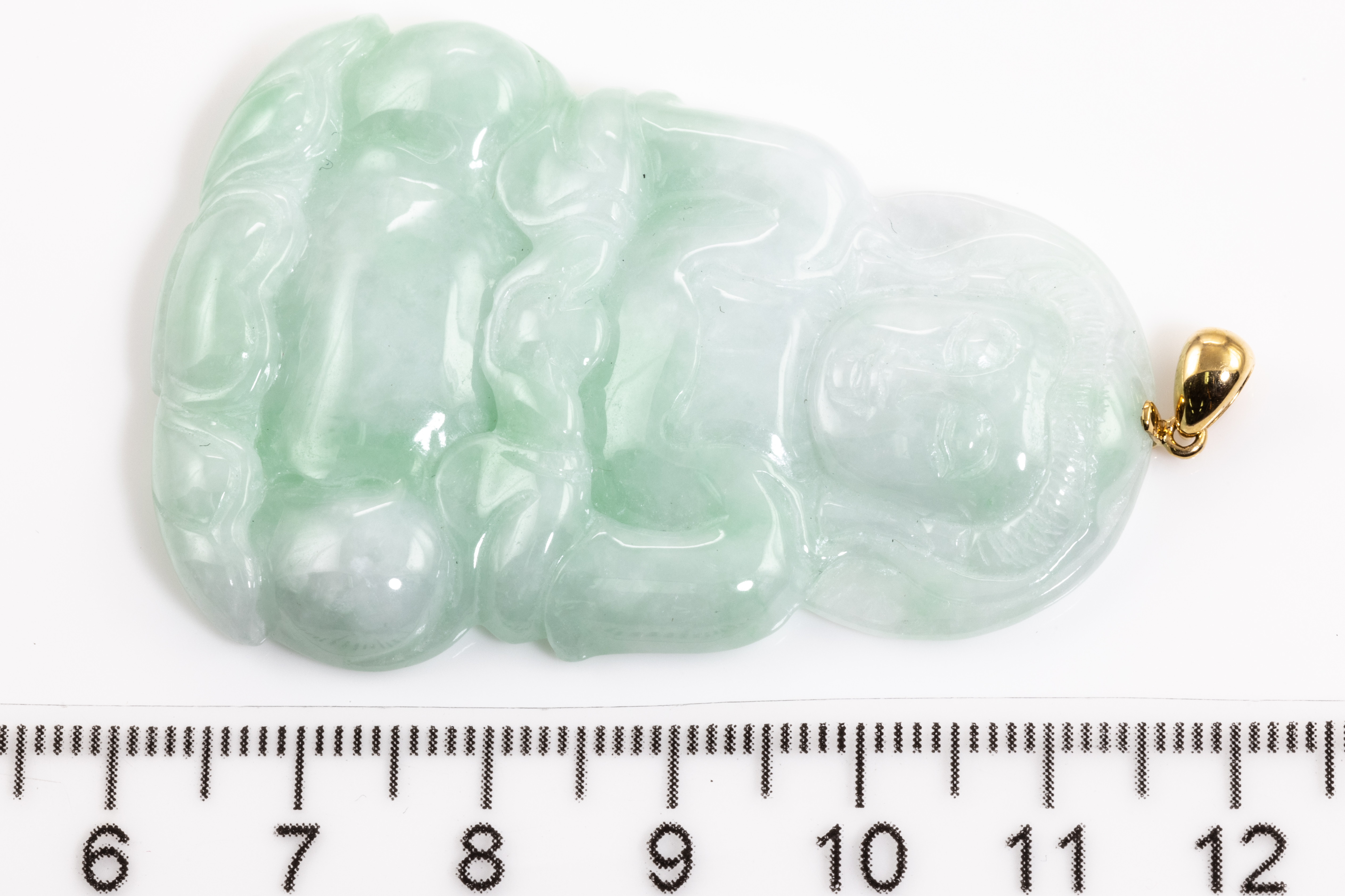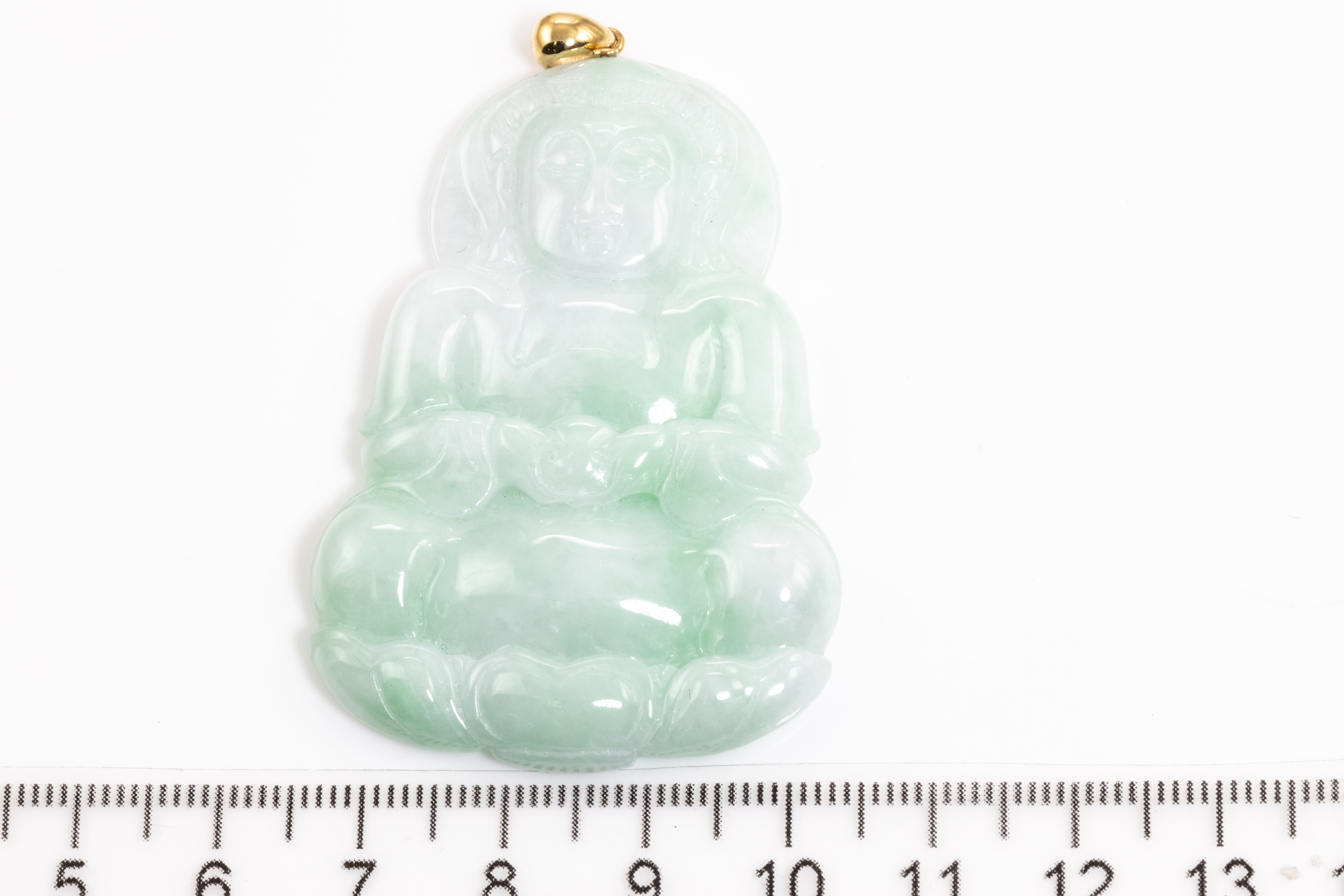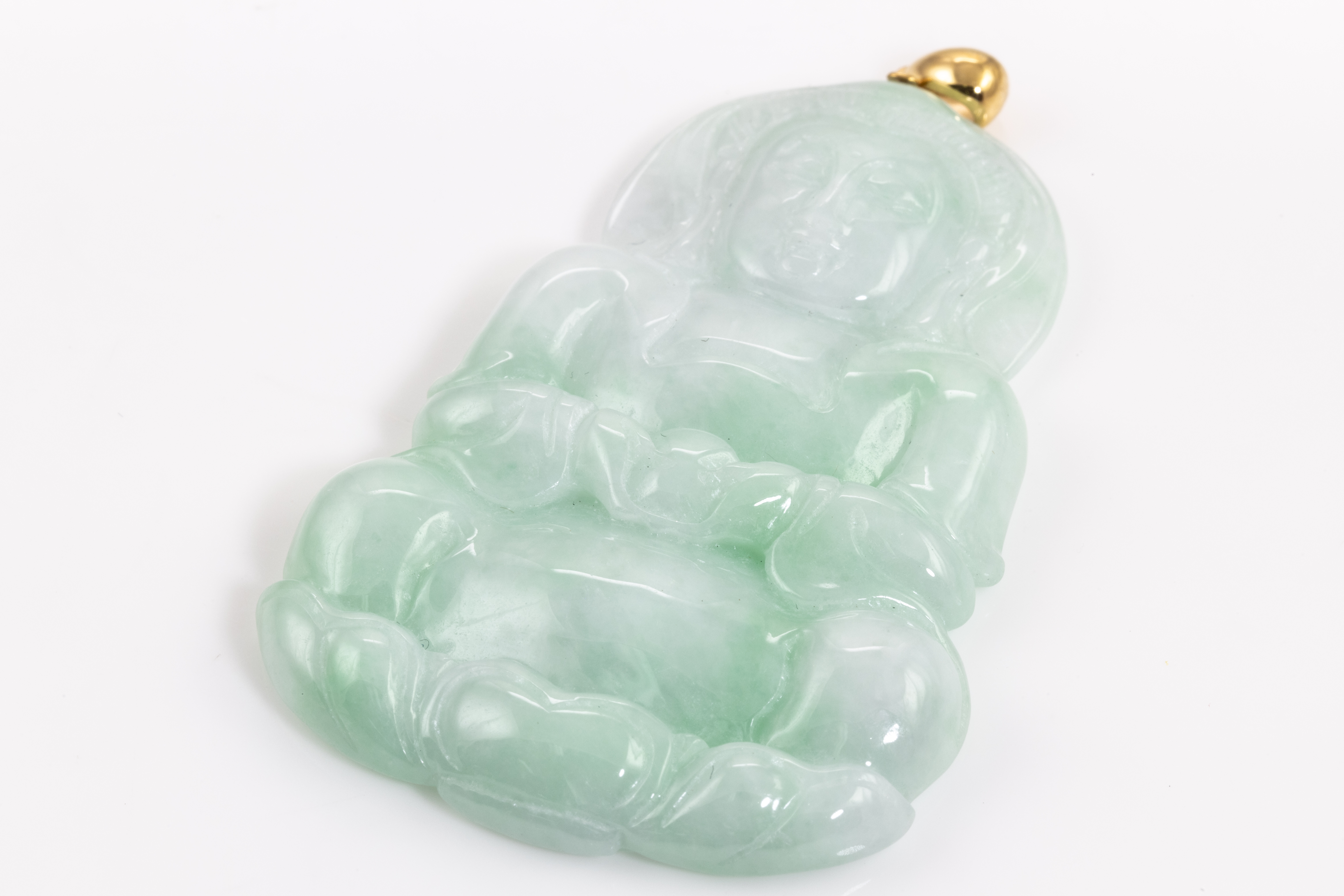 Jade Pendant shaped as a Buddha, light green Jadeite - type A. With gem report. 18ct yellow gold bale. Weight 20.8g. (Pre-owned)
