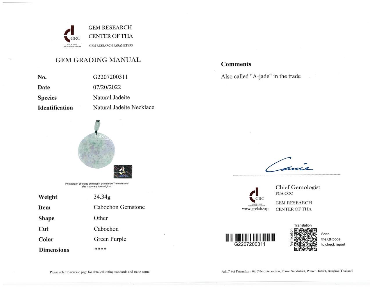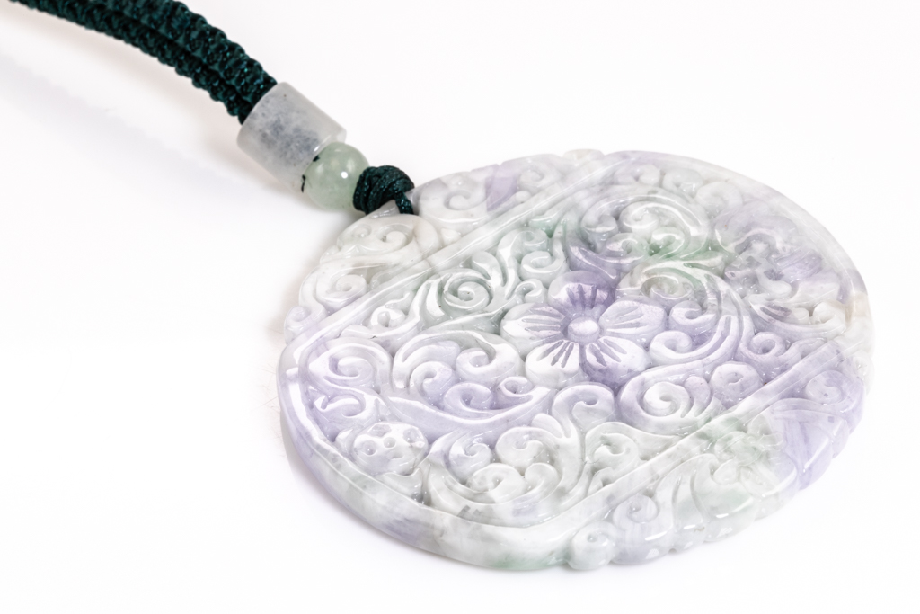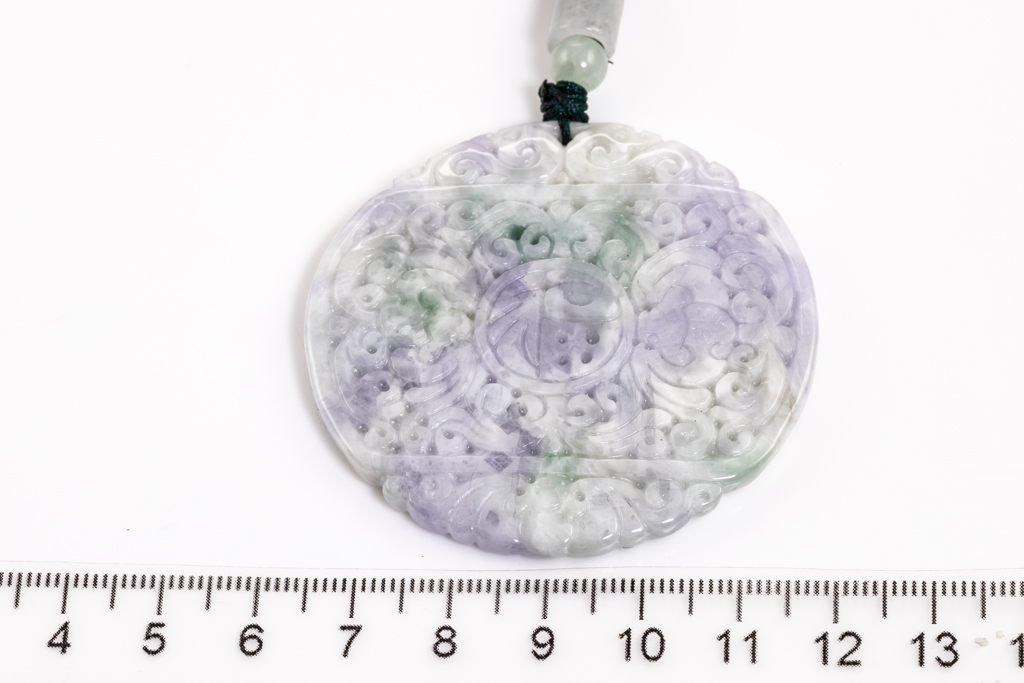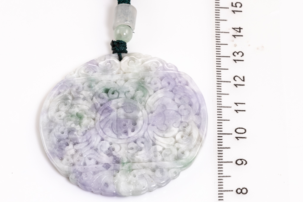 Jade Pendant, shaped as a carved disc, light green, lavender and white Jade, on adjustable cord. Diameter 5cm. Length 35cm. With Gem report. Weight 34.4g. (Pre-owned)