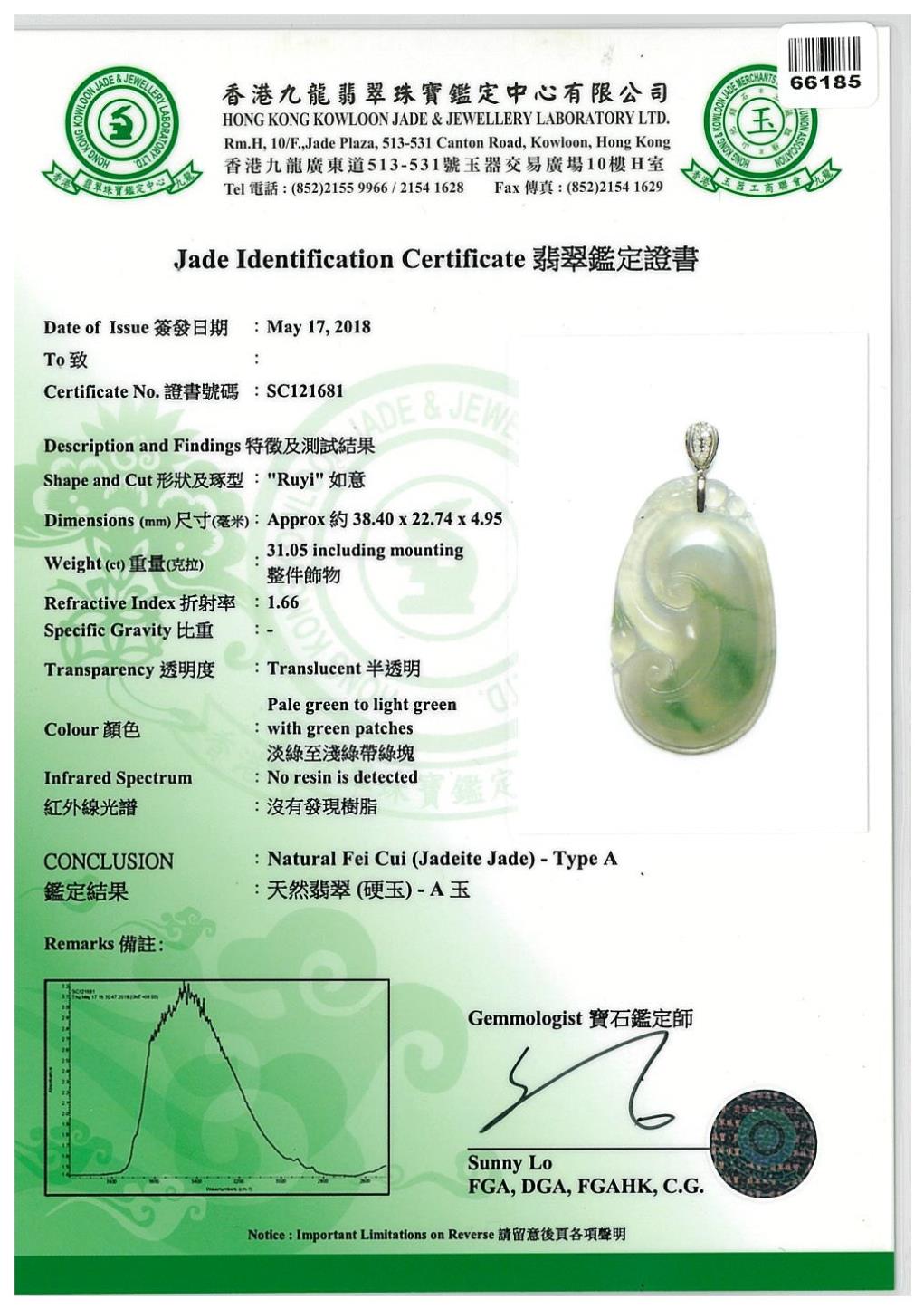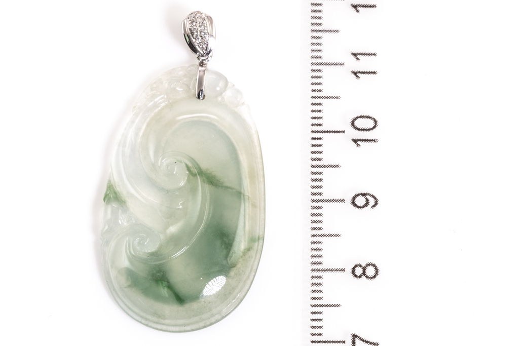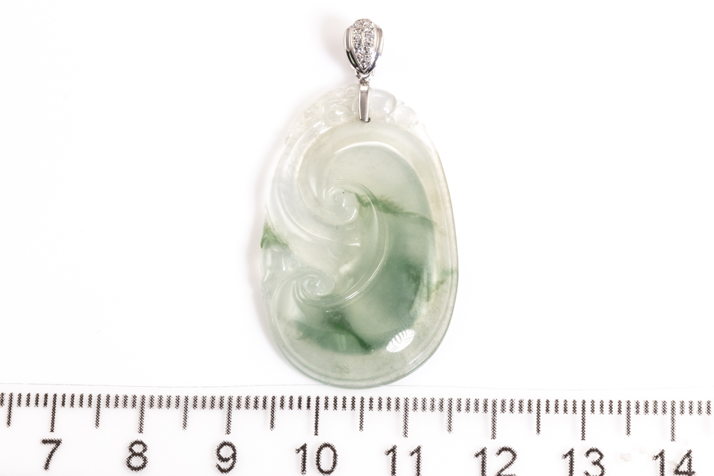 Jade Pendant with carved Ruyi light green Jadeite Jade - type A. 18ct white gold bale set with Diamonds totalling approximately 0.005ct. With gem report. Weight 6.2g. (Pre-owned)