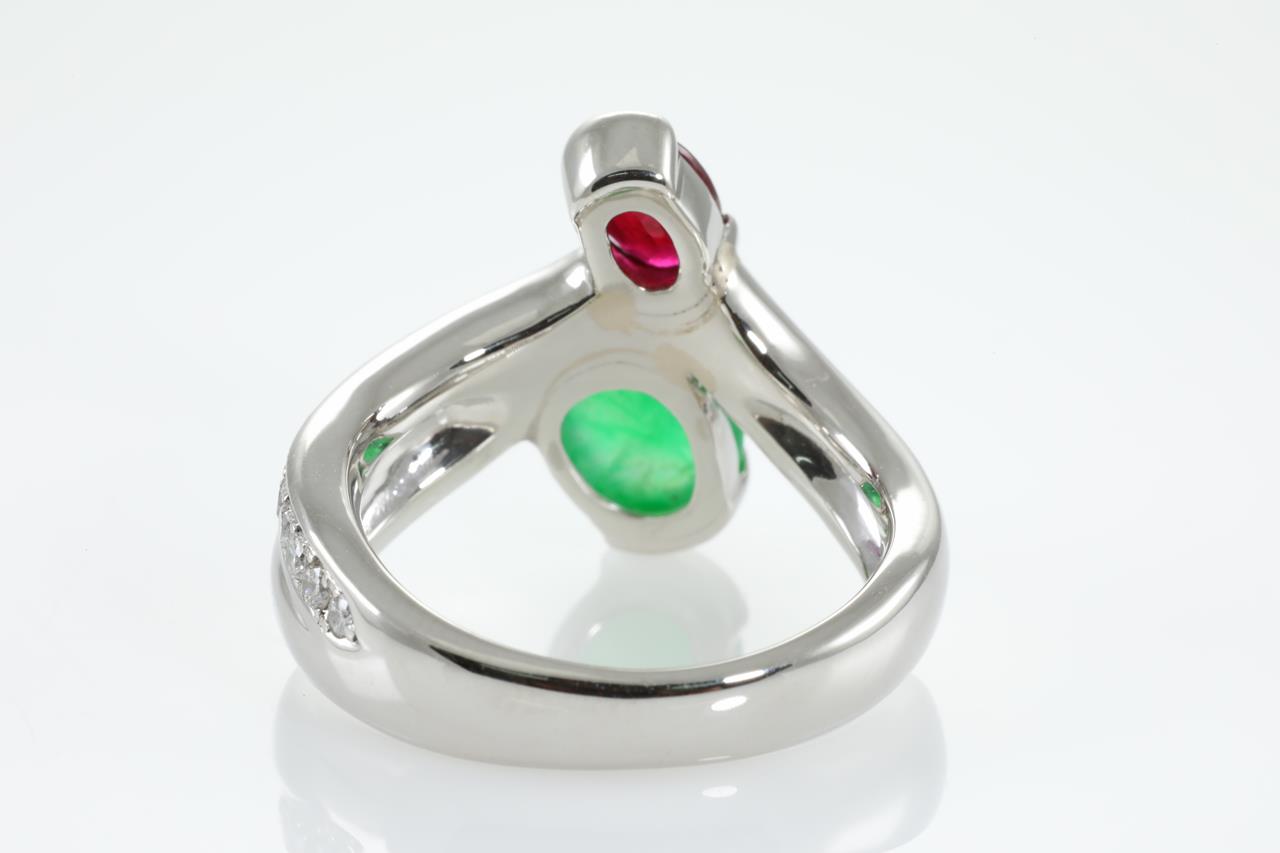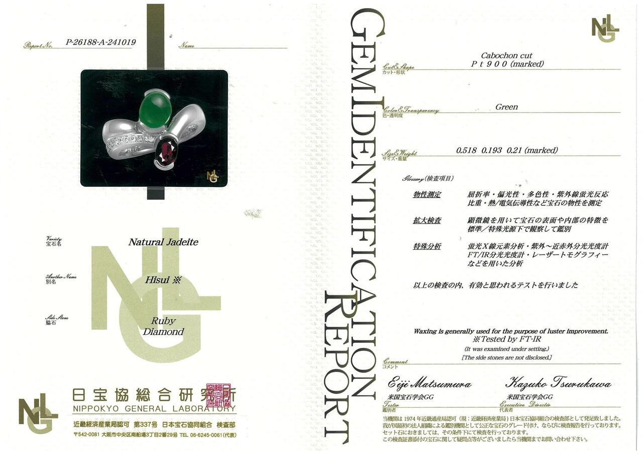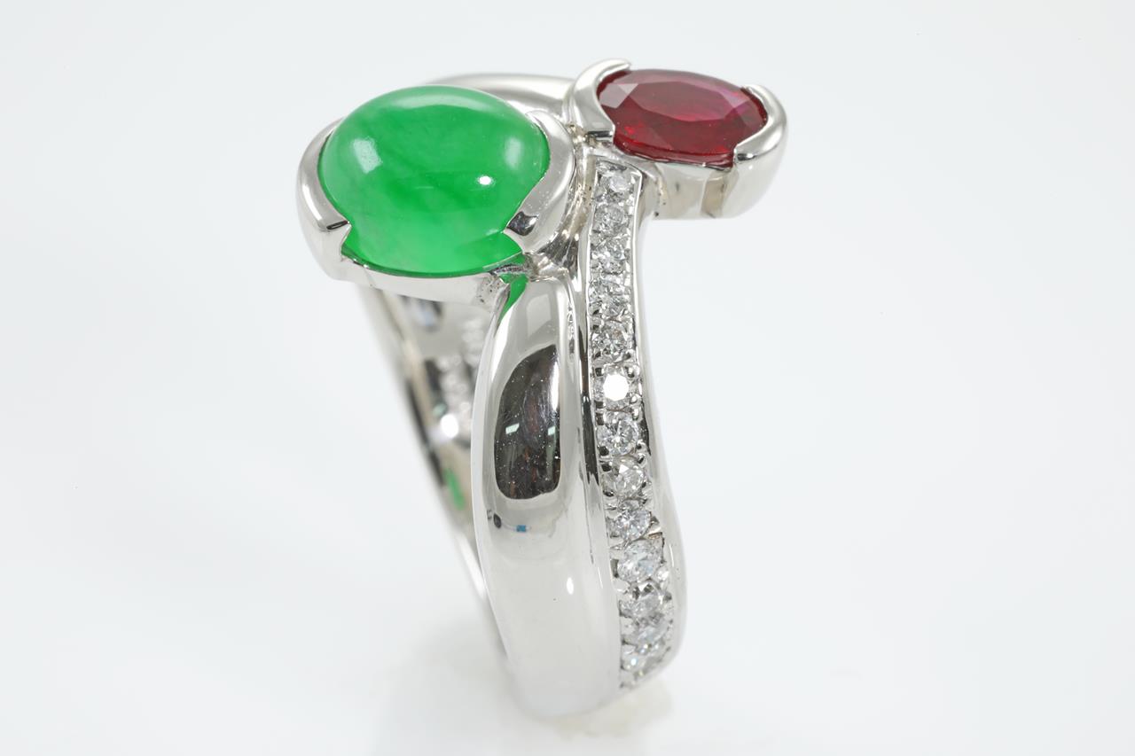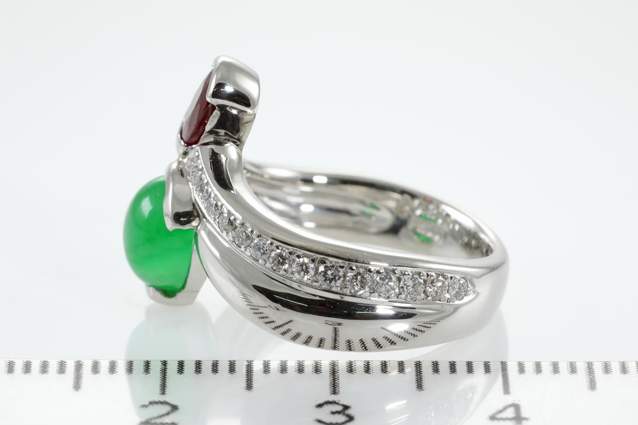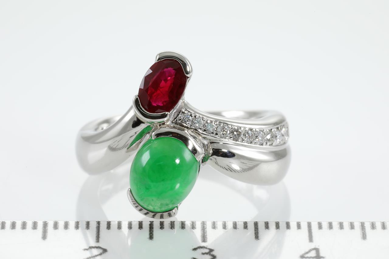 Jade and Diamond ring with an oval cabochon cut Natural Type A green Jadeite Jade of 0.51 (With Gem Identification report# P-26188-A-241019, Ruby of 0.19ct and Diamonds totalling 0.21cts . Platinum. Ring size K1/2. (Pre-owned)