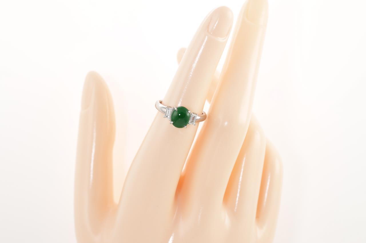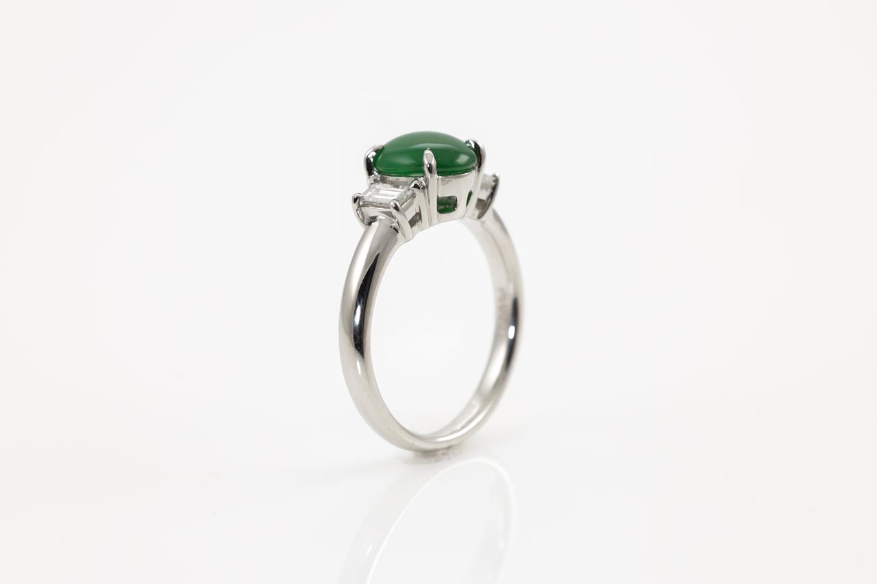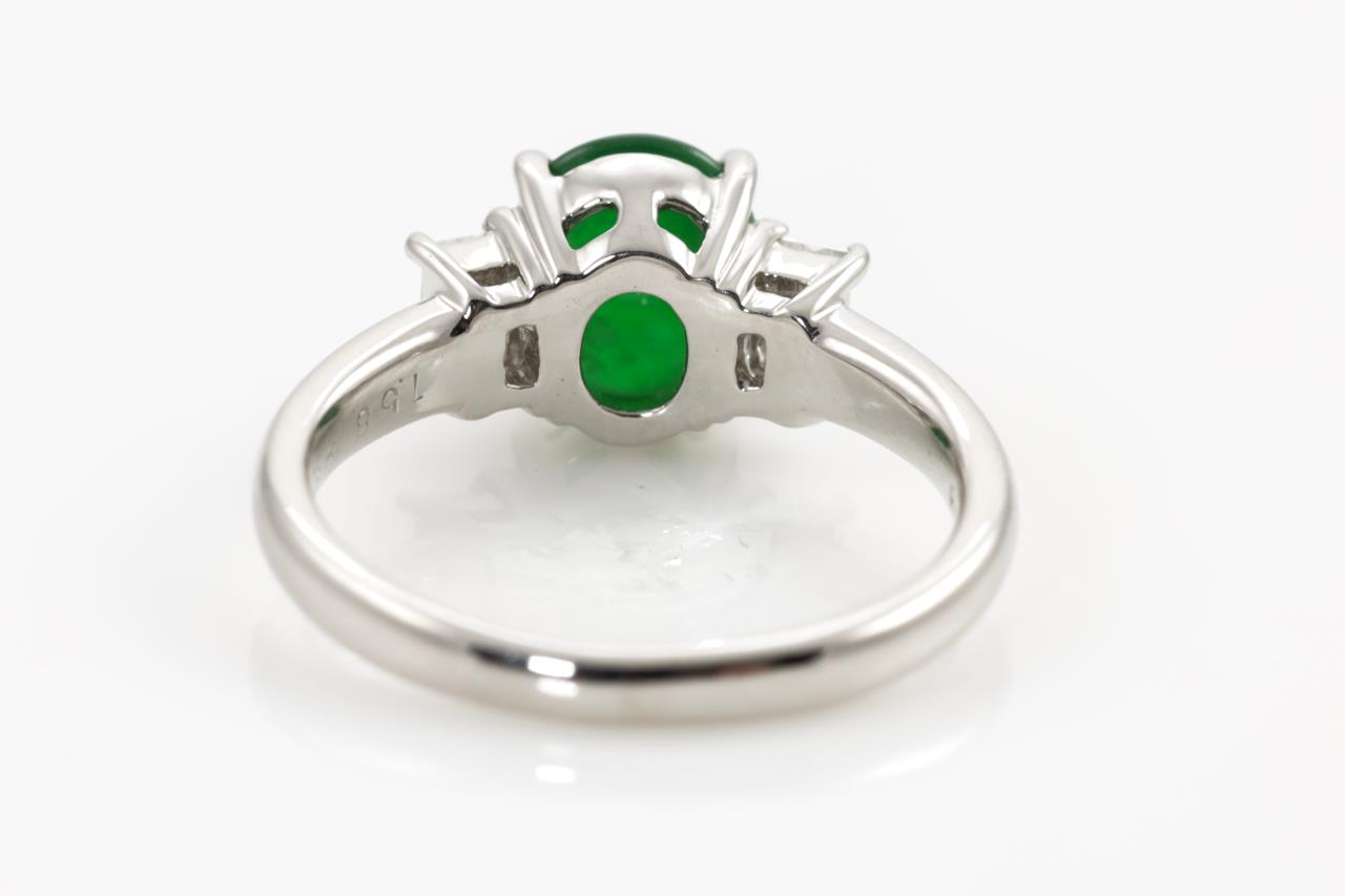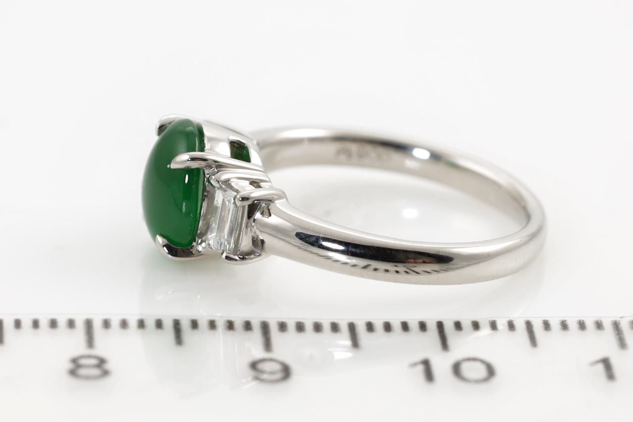 Jade and Diamond ring with an oval translucent green natural Jadeite Jade of 1.58ct and 2 baguette cut Diamonds totalling 0.24cts. Platinum. Ring size K1/2. Weight: 5.6g. (Pre-owned)