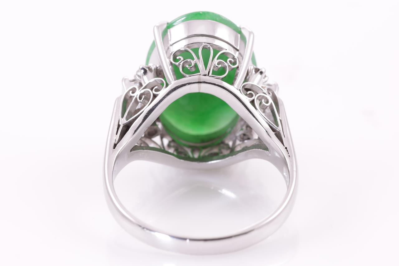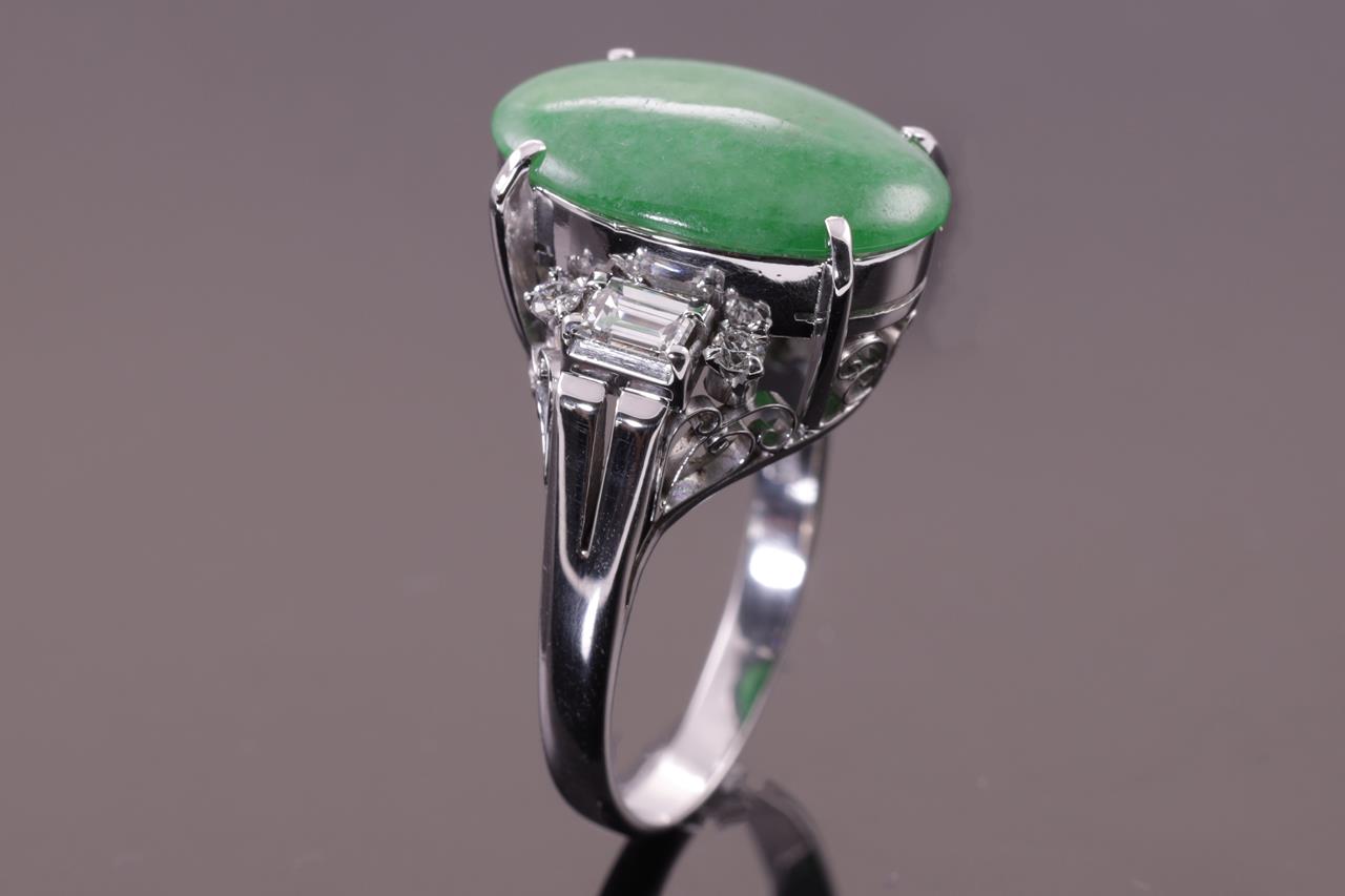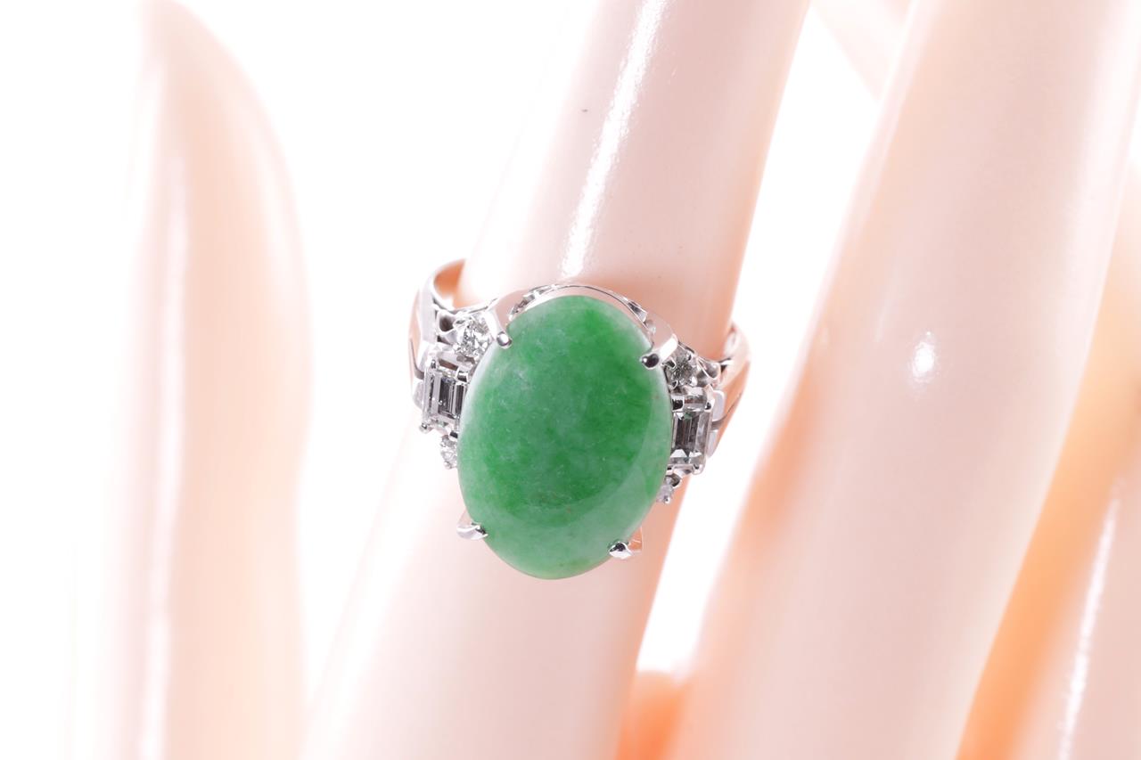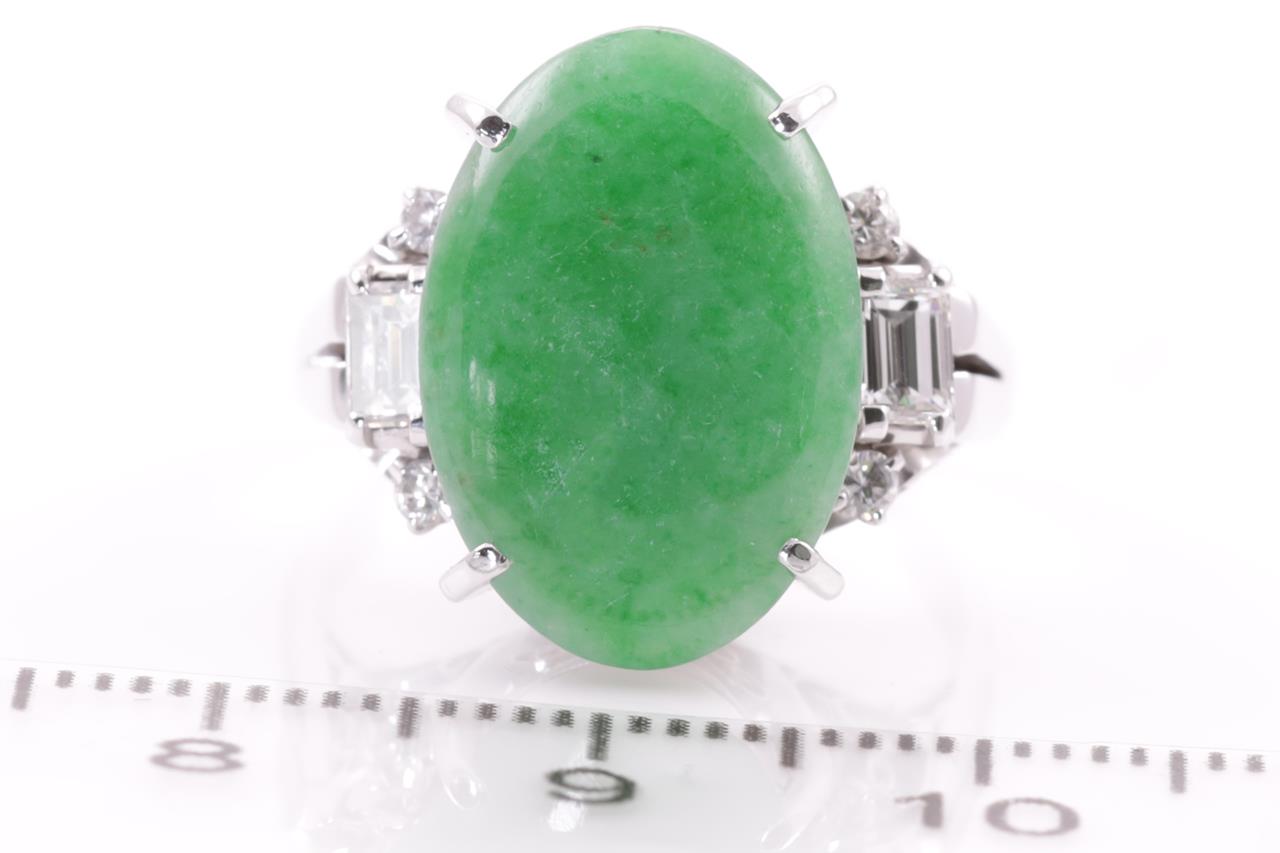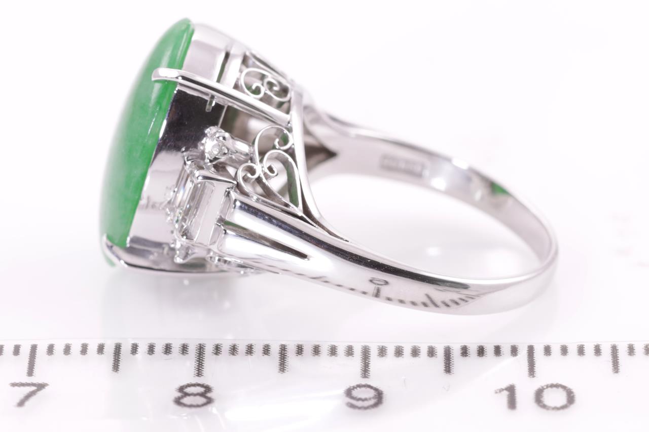 Jade and Diamond ring with an oval cabochon cut natural green Type A Jadeite Jade of 16.8mm x 11.6mm x 3.9mm and round & buguette cut Diamonds totalling 0.48cts (Estimated grading G SI). Platinum. Ring size M1/2 - ring resizing is not recommended. Weight: 8.2g. (Pre-owned)