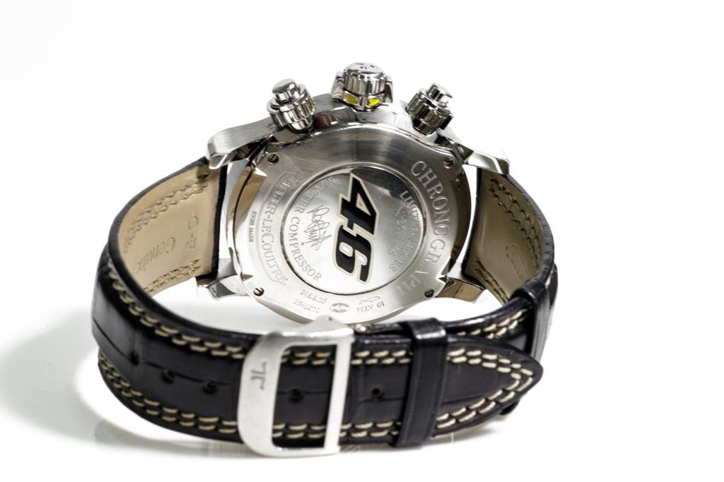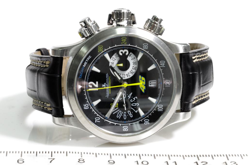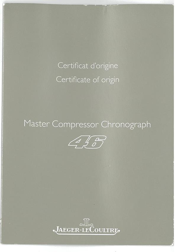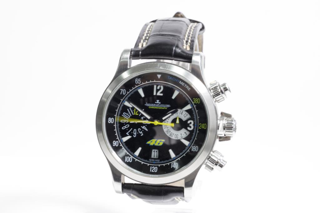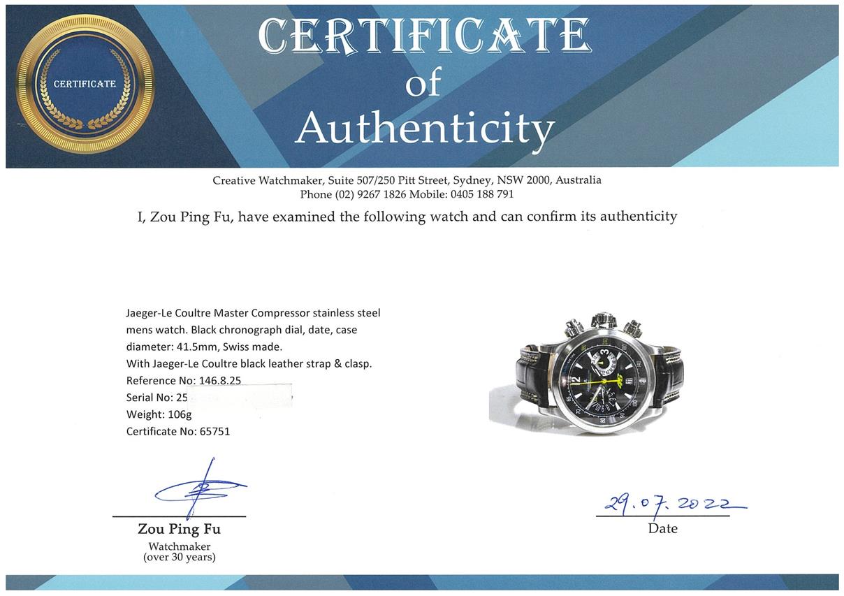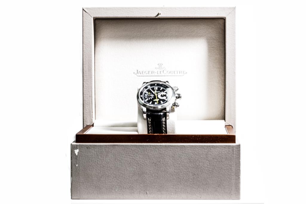 Jaeger-Le Coultre Master Compressor stainless steel automatic mens watch. Black chronograph dial, date, case diameter: 41.5mm, adjustable max wrist size: 20.5cm, Swiss made. Ref# 146.8.25. With Jaeger-Le Coultre black leather strap & clasp. With Certificate of Authenticity, Jaeger-Le Coultre Guarantee Certificate dated 27/05/2012, Jaeger-Le Coultre Certificate of Origin and Jaeger-Le Coultre box. 3 month FSA warranty. (Pre-owned)