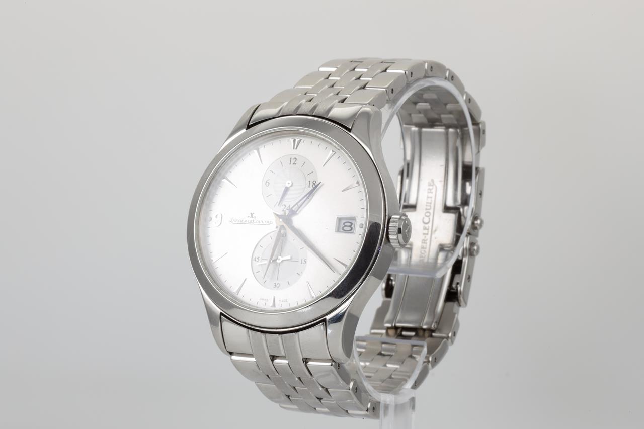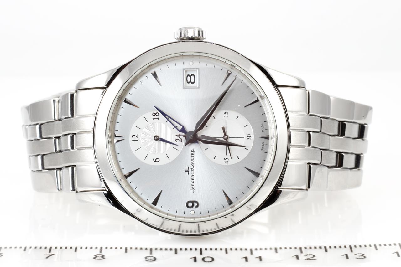 Jaeger Le-Coultre Master Hometime stainless steel automatic mens watch. Silver dial, case diameter: 40mm, wrist size: 19cm, Swiss made. Ref# 174.8.05.S. With Jaeger Le-Coultre stainless steel bracelet and clasp. With certificate of authenticity. 3 month FSA warranty. (Pre-owned)