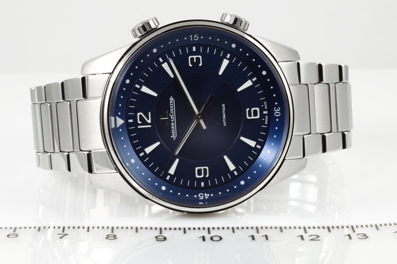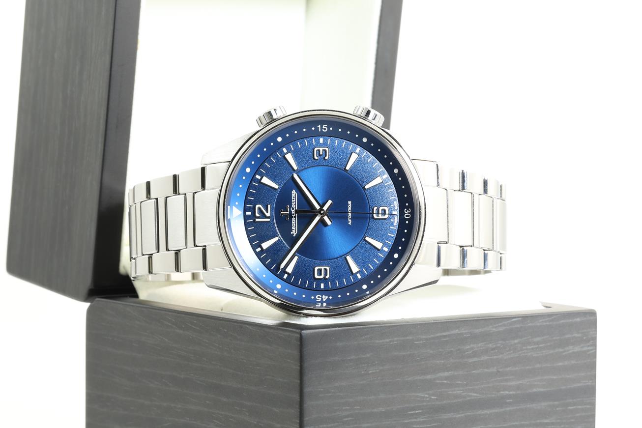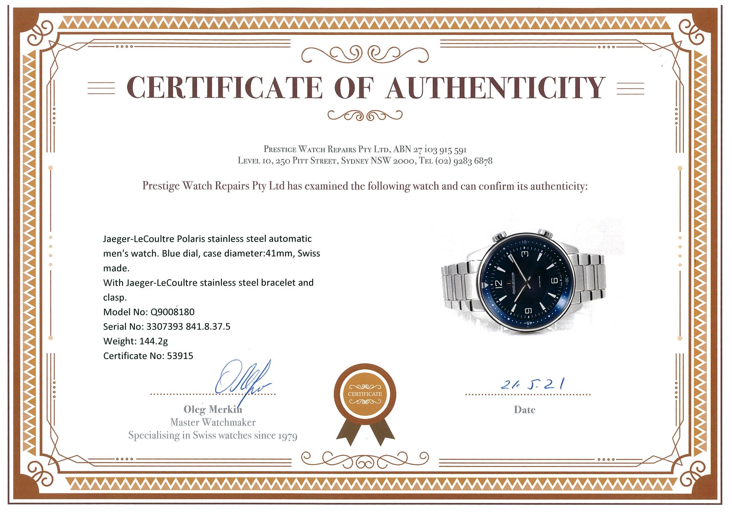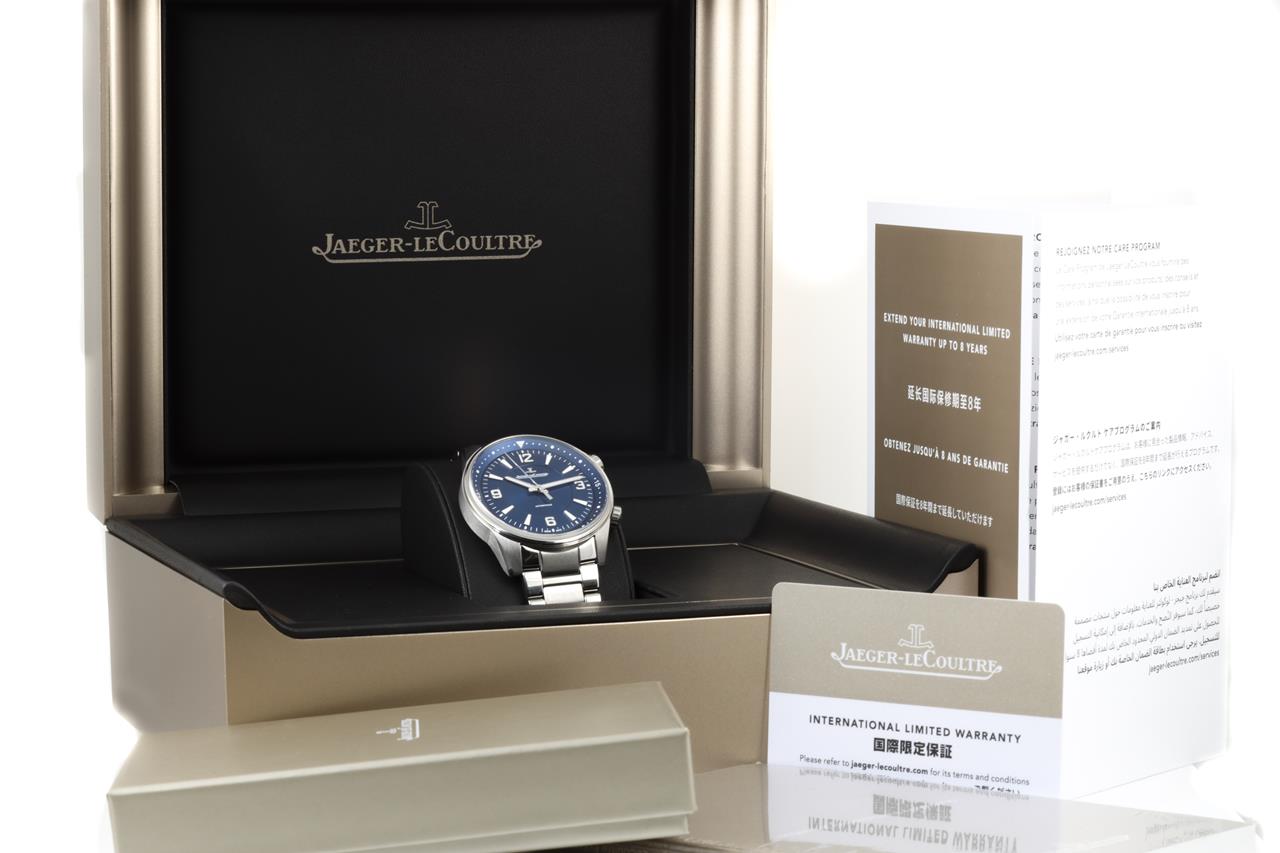 Jaeger-LeCoultre Polaris stainless steel automatic mens watch. Blue dial, case diameter:41mm, wrist size: 20cm, Swiss made. Ref# Q9008180. With Jaeger-LeCoultre stainless steel bracelet and clasp. With Certificate of Authenticity, Jaeger-LeCoultre international limited warranty card dated 2020/4/18, notepad and Jaeger-LeCoultre box. 3 month FSA warranty. (Pre-owned)