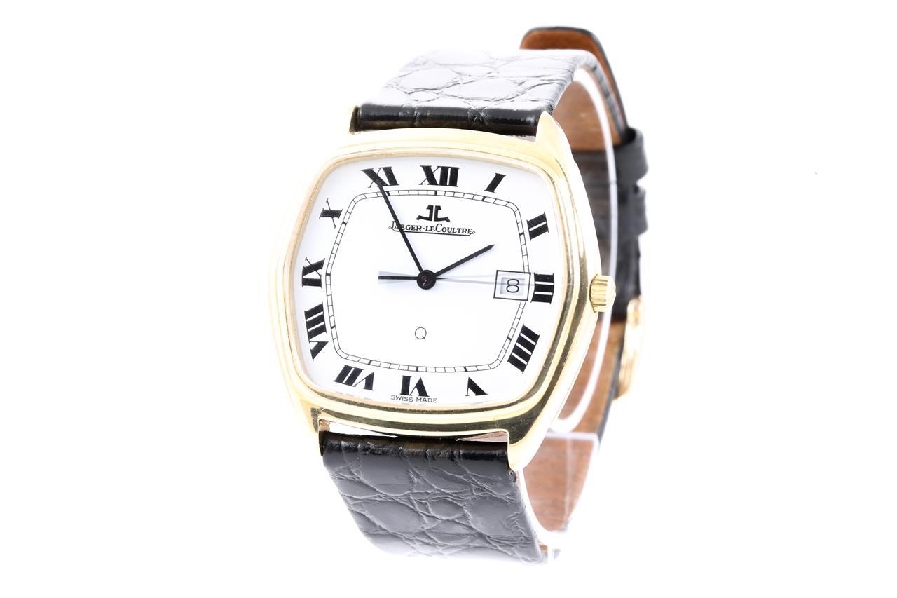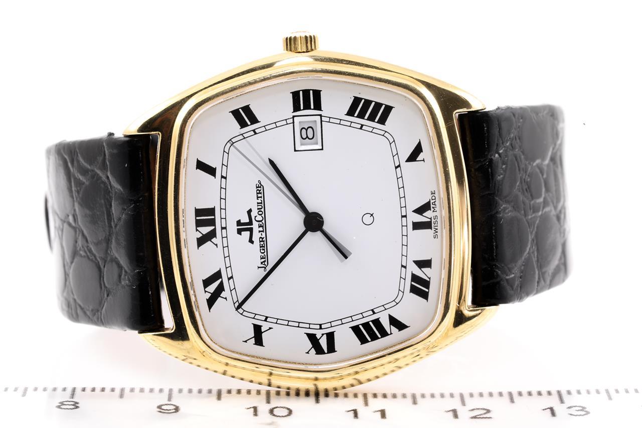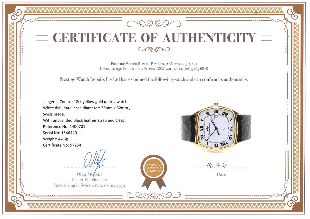 Jaeger LeCoultre 18ct yellow gold quartz watch. White dial, date, case diameter: 35mm x 32mm , length: 19.5cm, Swiss made. Ref# 1400701. With unbranded black leather strap and clasp. With certificate of authenticity, Jaeger LeCoultre international guarantee booklet dated 21/7/1992 and Jaeger LeCoultre box. 3 month FSA warranty. (Pre-owned)